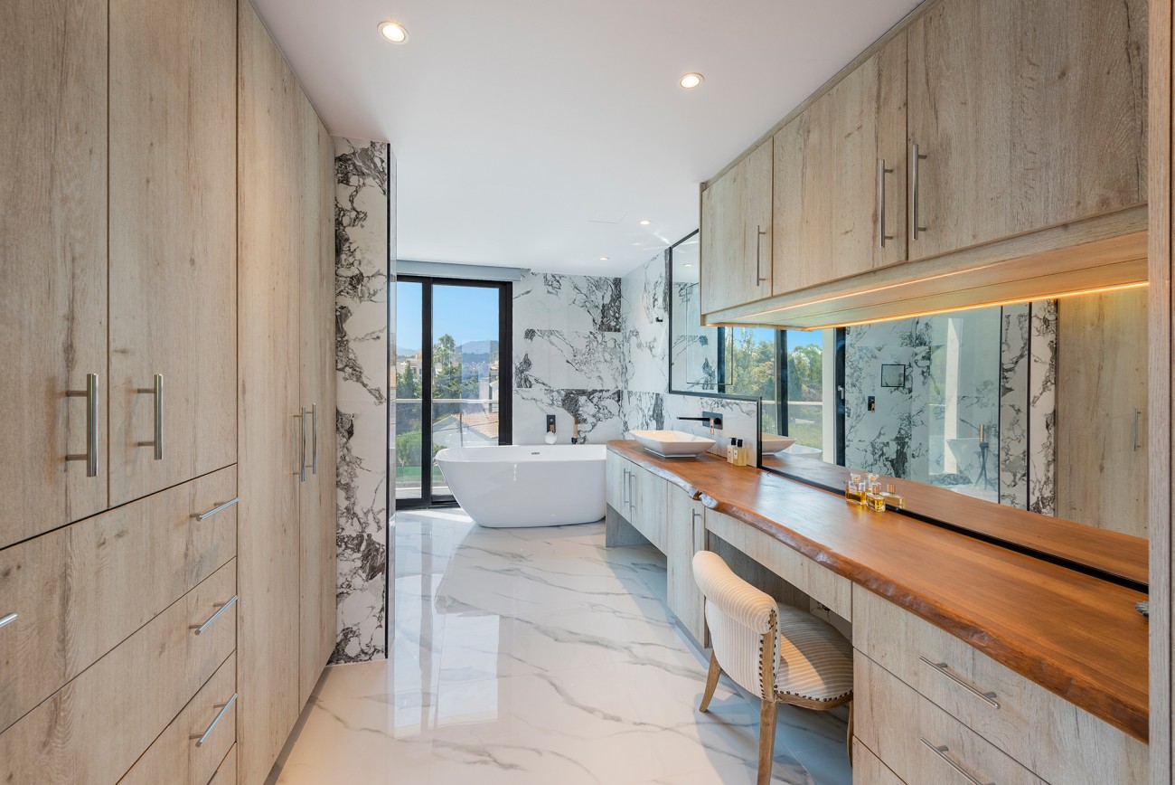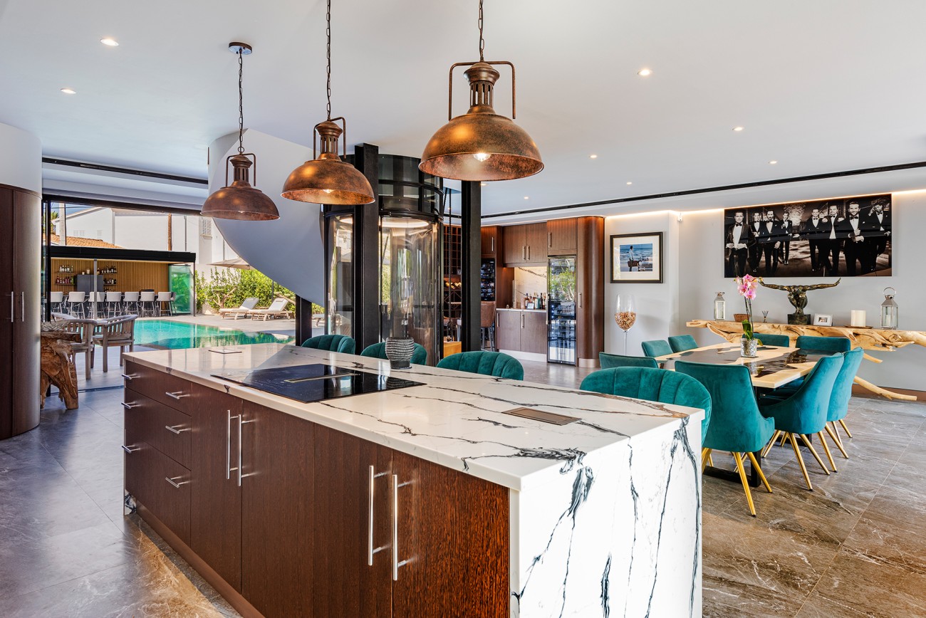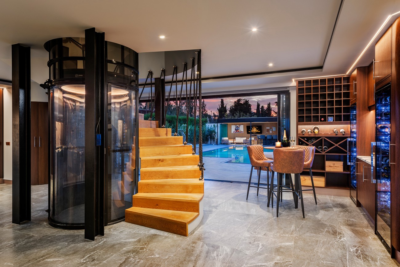 Deze villa biedt een royale woonoppervlakte van ongeveer 408m2, inclusief vier slaapkamers en vijf badkamers en een glazen lift die gemakkelijke toegang biedt tot elk niveau.
