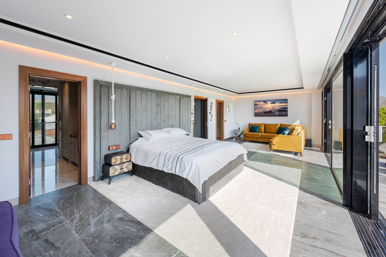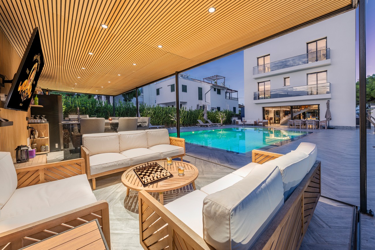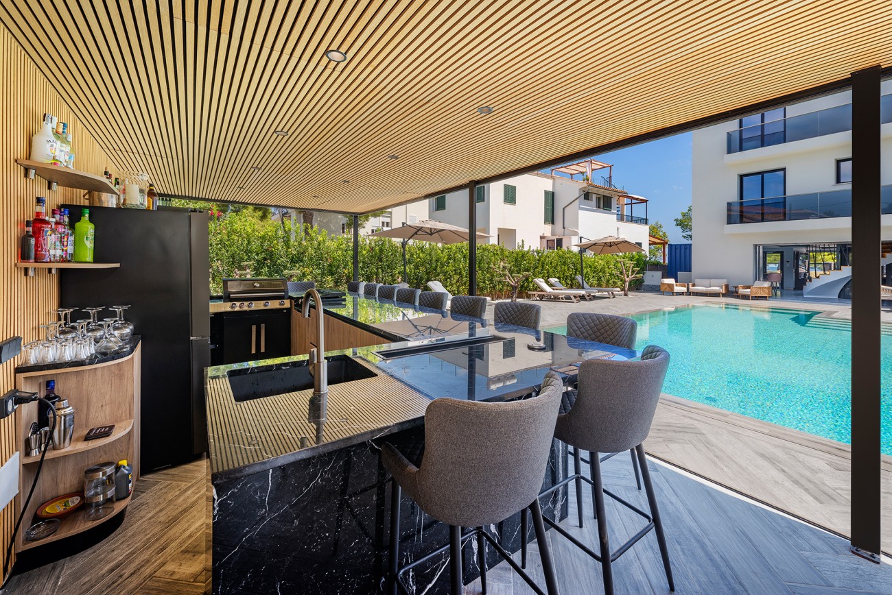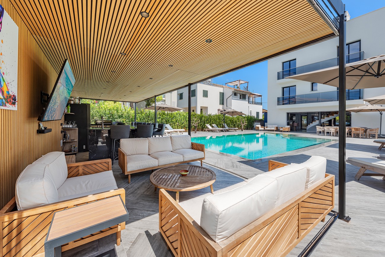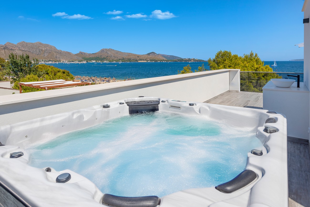 Het zwembad heeft een prachtige pergola met een zomerkeuken, bar en eetruimte, die allemaal volledig afgesloten kunnen worden. Vanuit elke hoek heb je een prachtig uitzicht op de baai van Pollensa, met zijn prachtige witte zandstrand en heldere turquoise water.