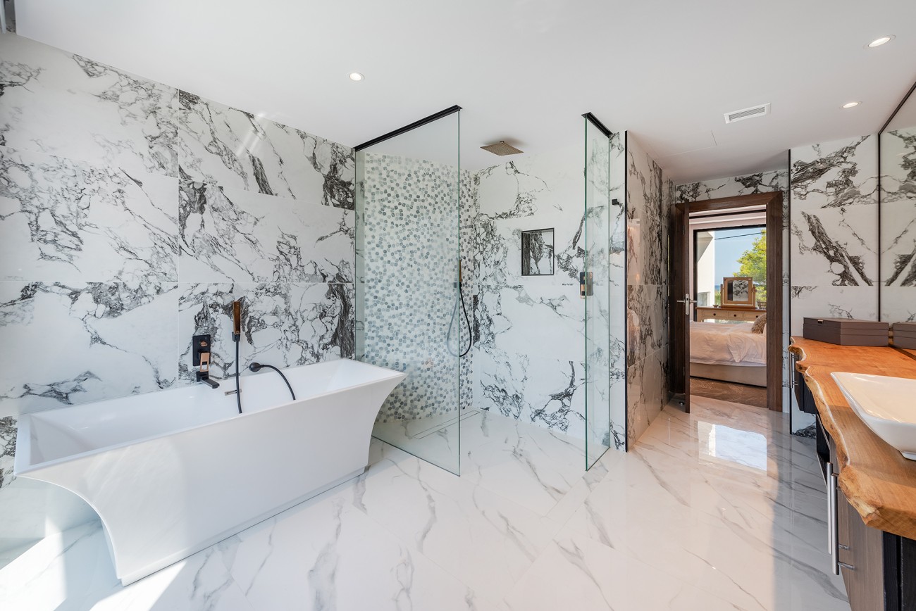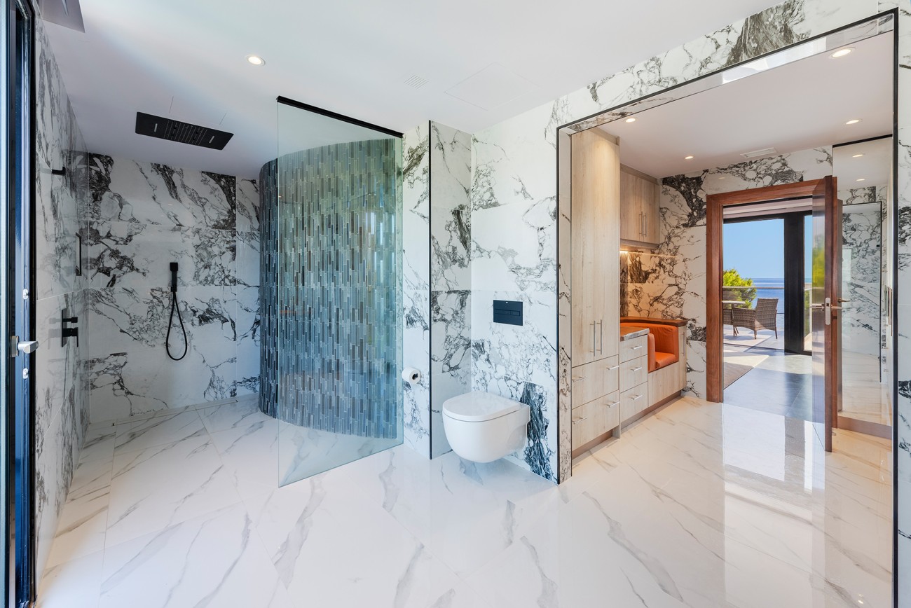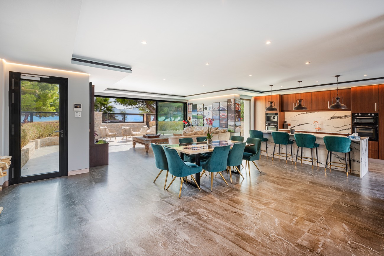 Op de begane grond is een prestigieuze open keuken met eersteklas geïntegreerde apparatuur, plus een ruime woon-eetkamer die aan beide zijden geopend kan worden via grote glazen deuren, waardoor je vanaf het zwembad een prachtig uitzicht op zee hebt.