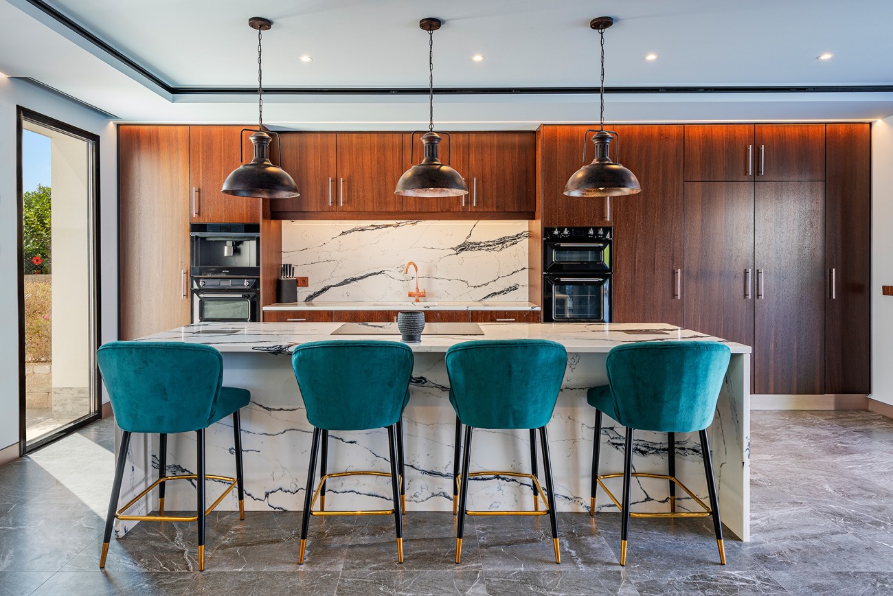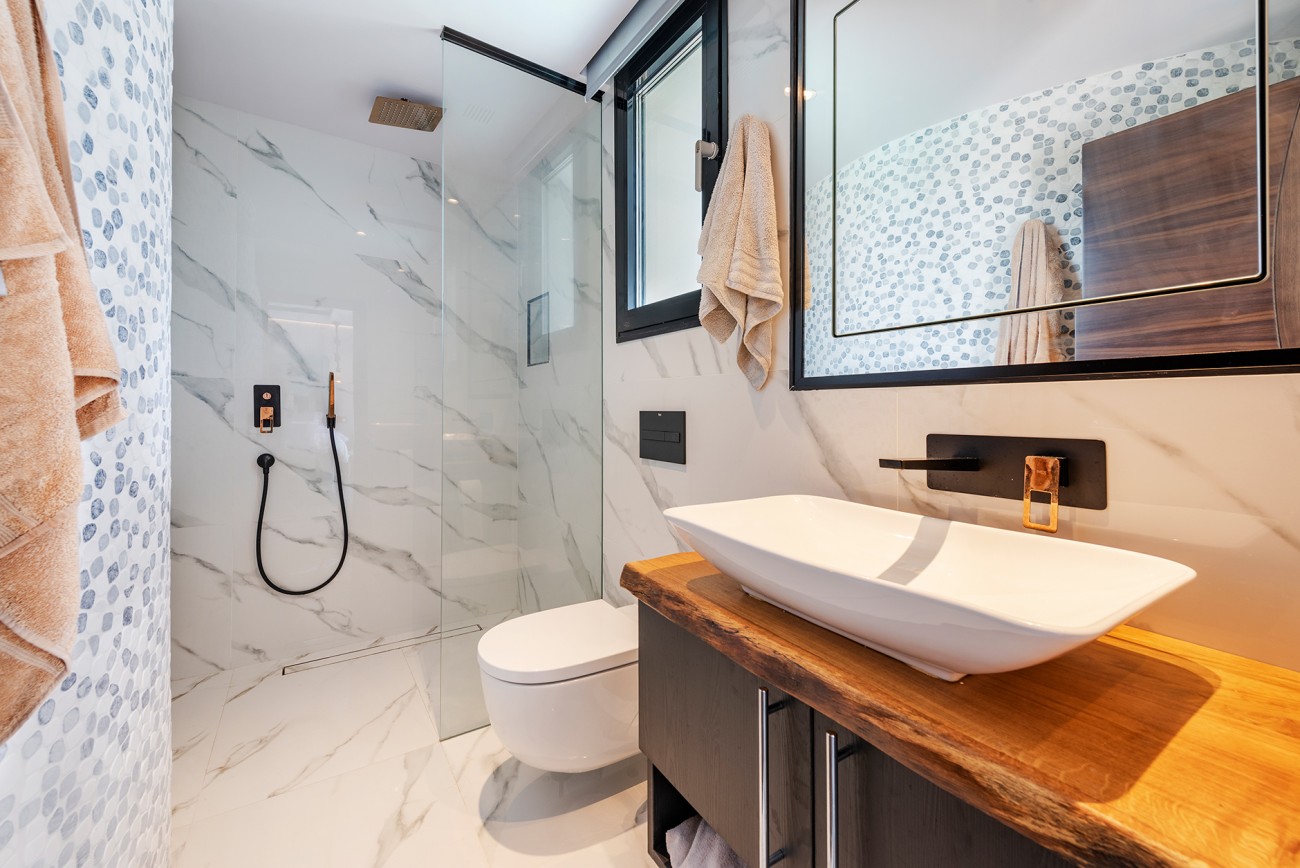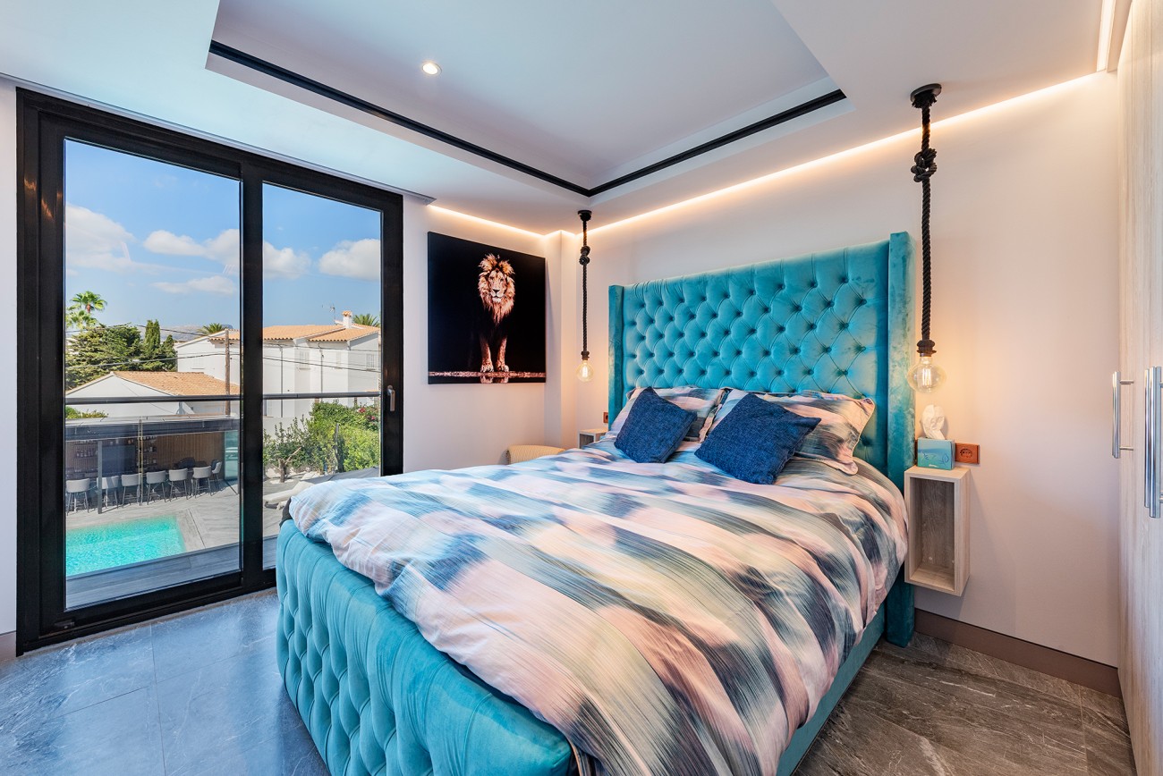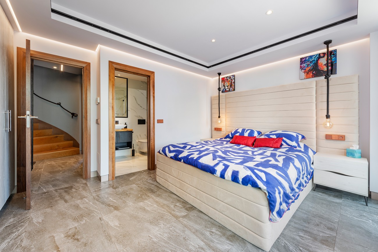 Op de begane grond is een prestigieuze open keuken met eersteklas geïntegreerde apparatuur, plus een ruime woon-eetkamer die aan beide zijden geopend kan worden via grote glazen deuren, waardoor je vanaf het zwembad een prachtig uitzicht op zee hebt.