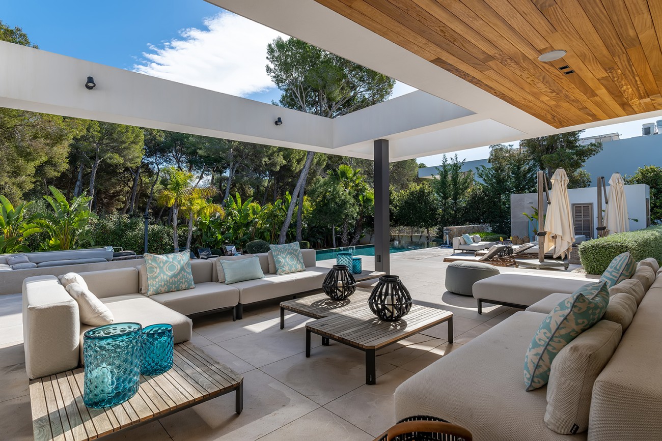 Het huis ligt direct aan de golfbaan Nova Santa Ponsa en biedt panoramisch uitzicht en een gevoel van rust. De entree met een imposante eiken draaideur verwelkomt bezoekers met elegantie en stijl. De overdekte en onoverdekte terrassen zijn de perfecte plek om buiten te ontspannen.