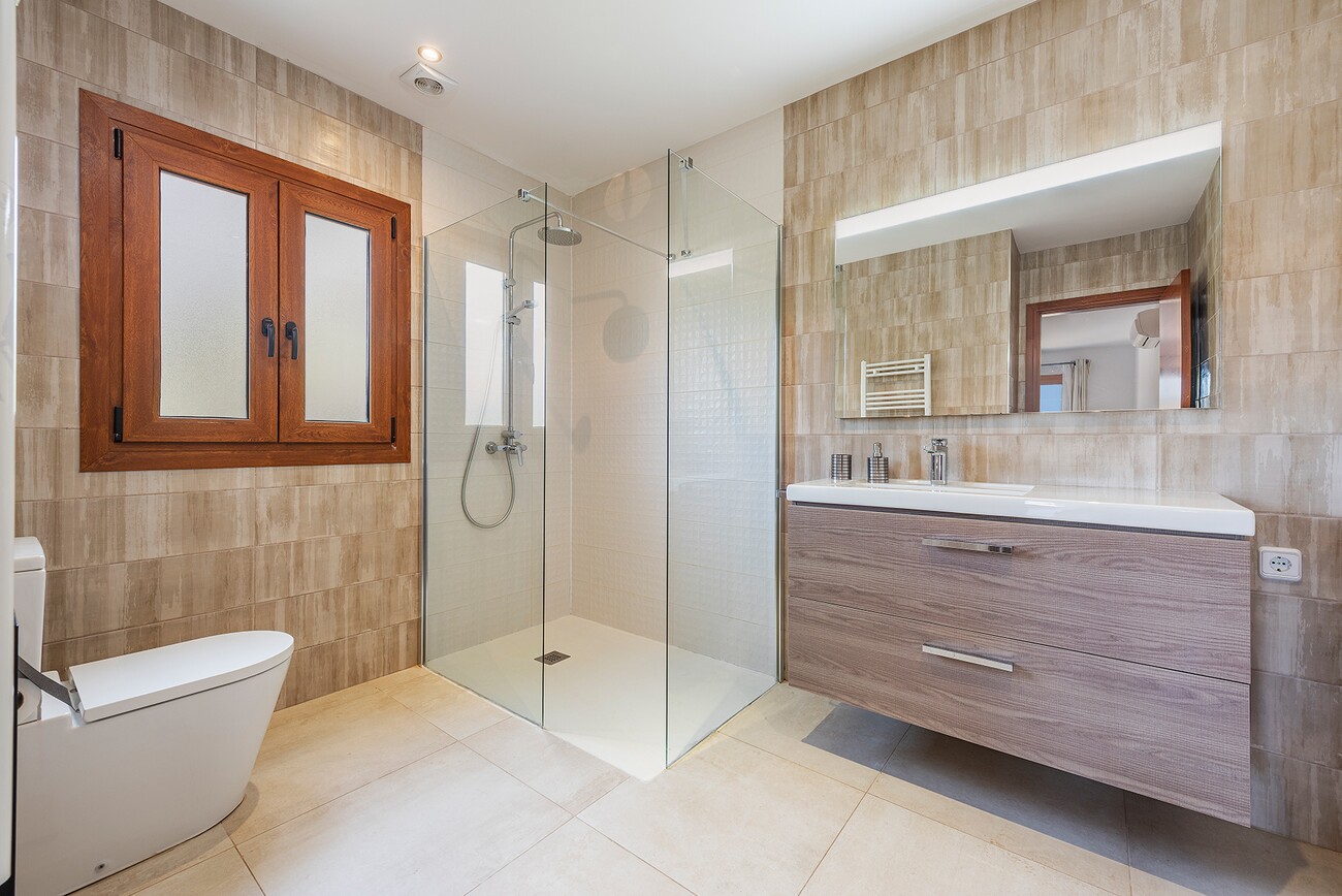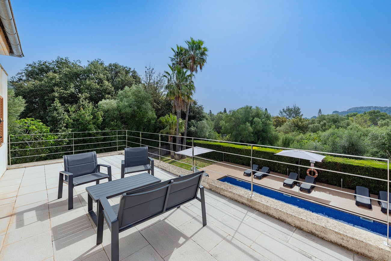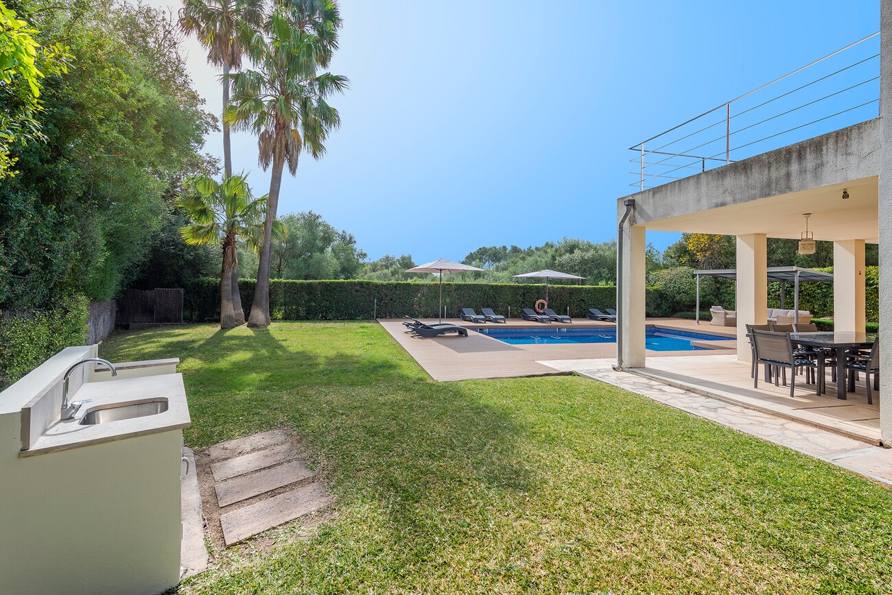 Outside, the villa boasts an attractive private swimming pool with spacious sunbathing terraces, perfect for enjoying the Mallorca sunshine. A shaded dining terrace and brick-built BBQ area provide the ideal setting for alfresco meals, while a stylish pergola with chill-out seating creates a relaxing spot by the pool.