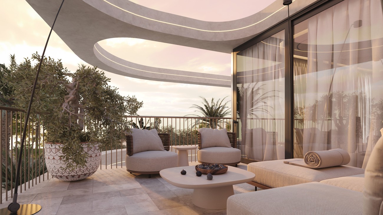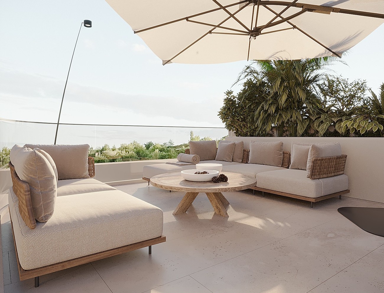 Naast het terras dat grenst aan de woonverdieping, hebben de penthouses royale privédakterrassen met weidse uitzichten over de Middellandse Zee en het omringende berglandschap. Een opvallend kenmerk van de penthouses is de privélift die de ondergrondse garage rechtstreeks met het appartement verbindt en beide verdiepingen met elkaar verbindt. De gelijkvloerse tuinwoningen profiteren van een privétrap vanuit de garage.