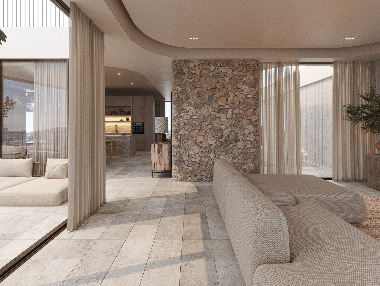 Elke woning heeft drie slaapkamers en drie badkamers – waarvan twee en suite – samen met een gunstig gelegen gastentoilet. De ruime, open woon- en eetruimte wordt gecompleteerd door een op maat gemaakte designkeuken die is uitgerust met hoogwaardige geïntegreerde apparatuur van Gaggenau en Miele. Grote glazen schuifdeuren strekken zich uit van vloer tot plafond, vullen het interieur met natuurlijk licht en creëren een naadloze overgang naar de privébuitenruimtes.