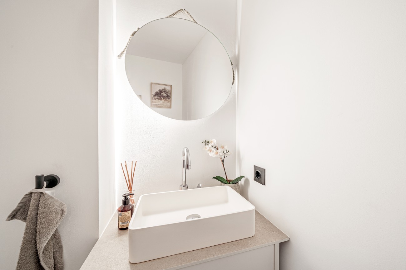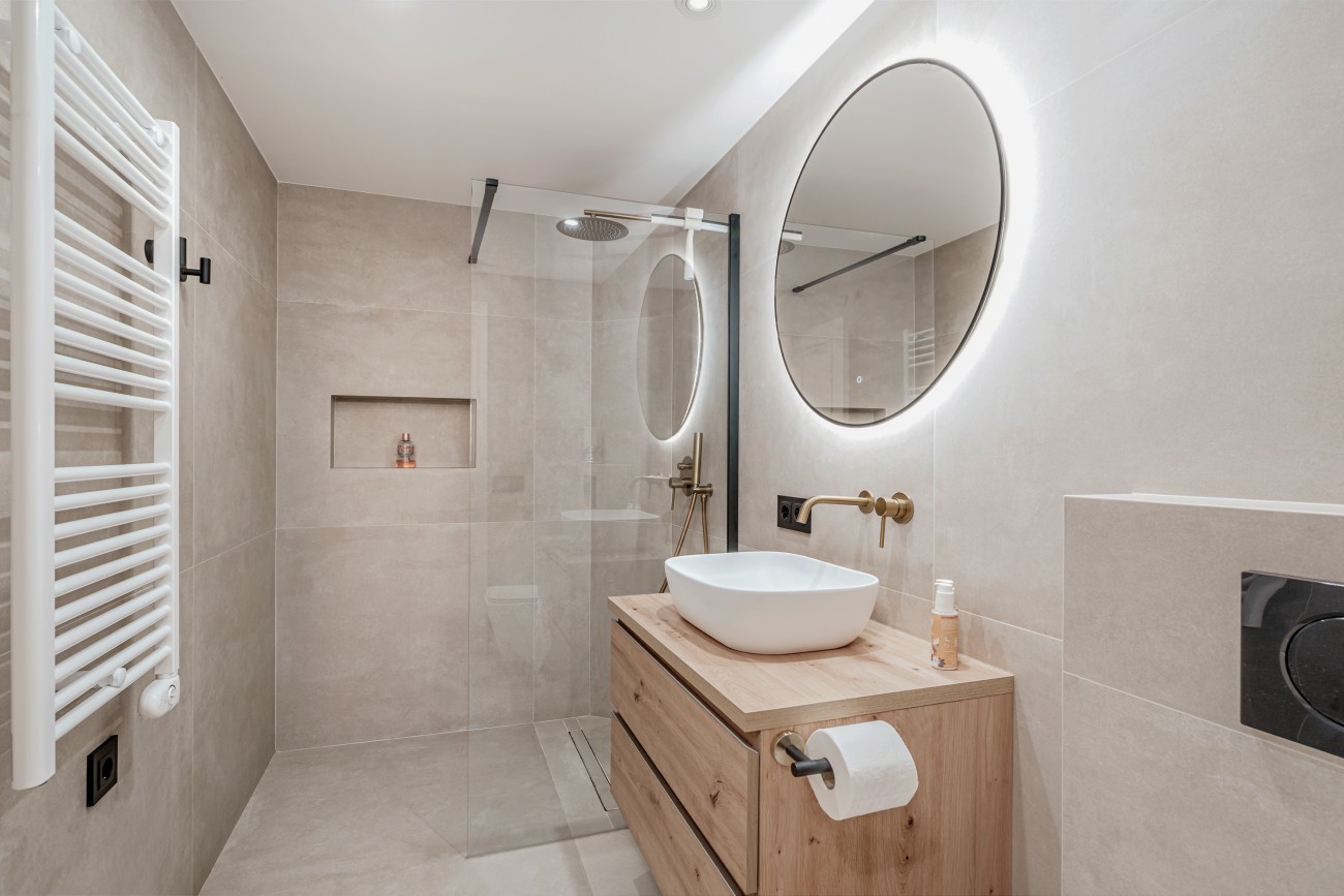 The upper floor features a generous living and dining area opening onto a 6.5 m² balcony with partial sea views, accompanied by a guest toilet and a convenient storage space. The lower level hosts two bedrooms, each with an en-suite bathroom, leading directly to a covered 10.5 m² terrace and a delightful 25 m² private garden with lounge area and barbecue. This outdoor space also provides independent access, adding to the convenience and privacy.