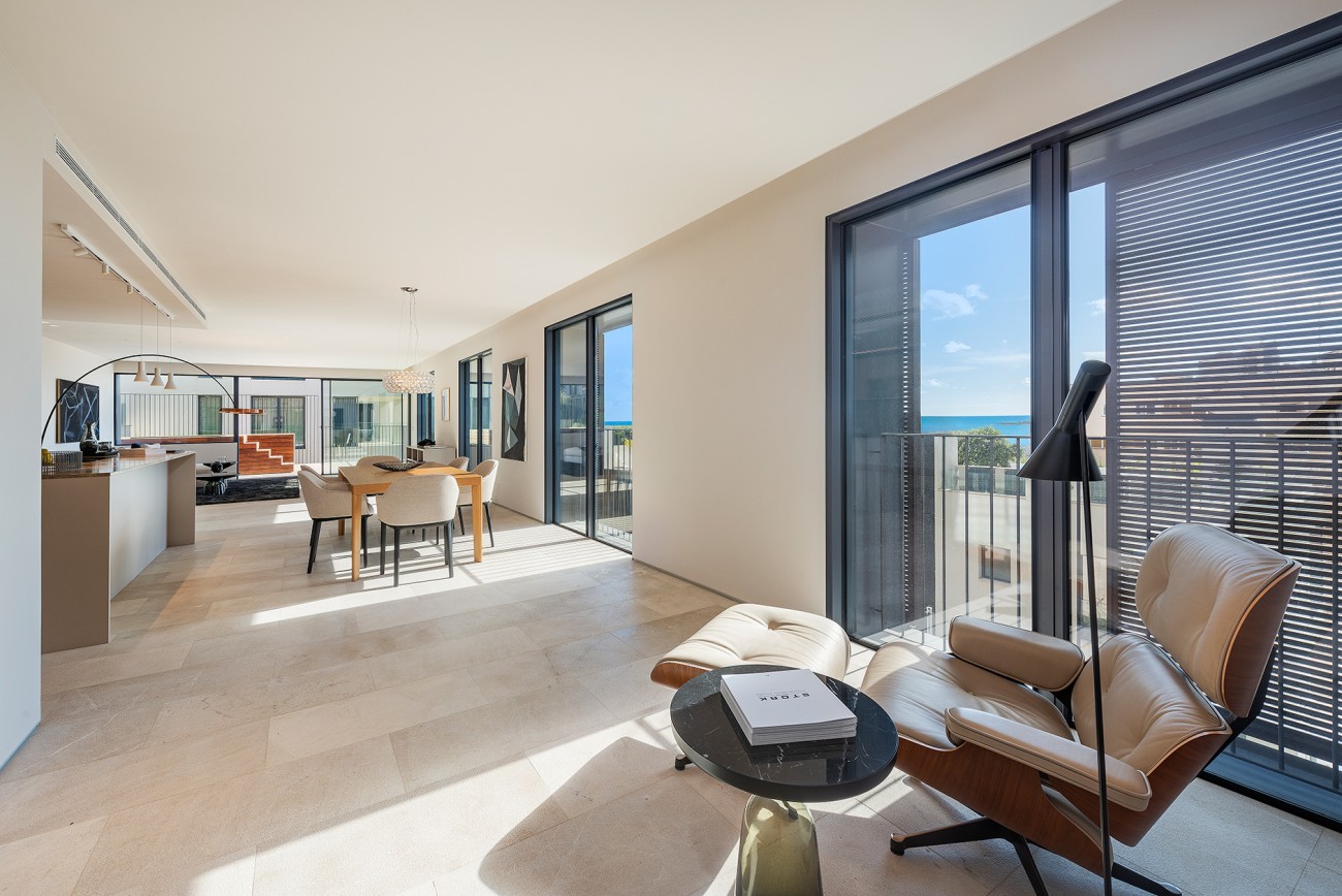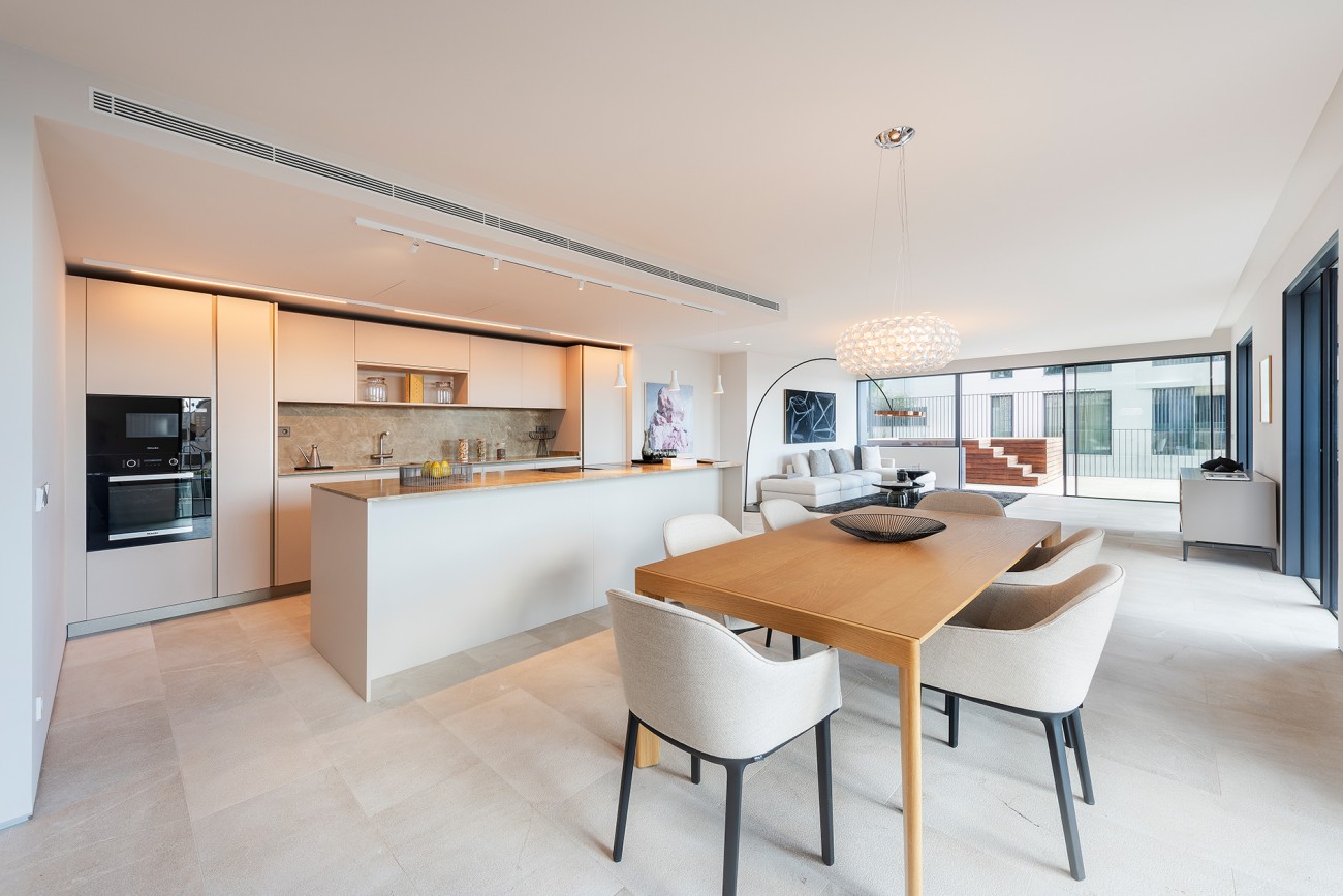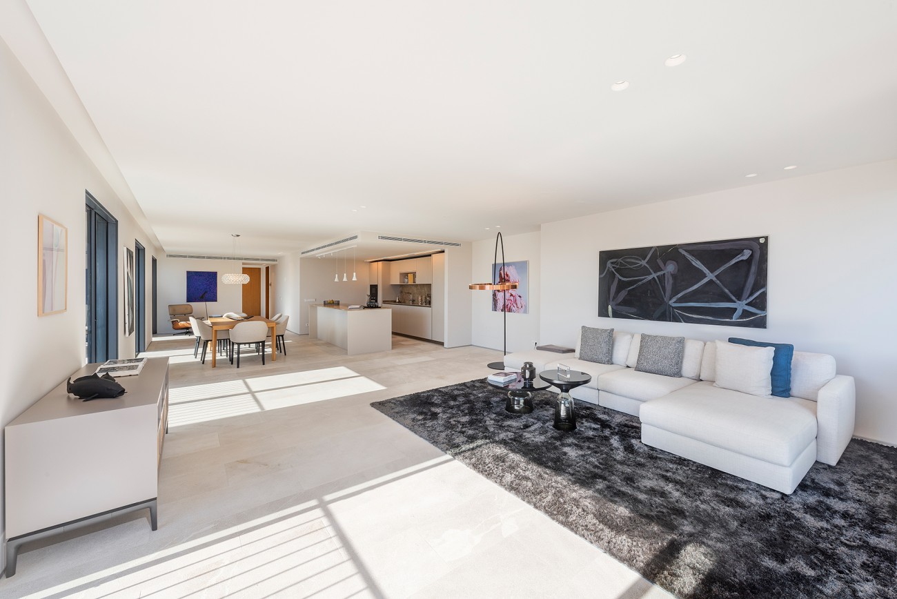 Dit appartement is verdeeld over de gehele tweede verdieping en beschikt over een privéterras van 33 m2 met een dompelbad van 7 m2. Het heeft een grote woon/eetkamer van 59 m² met open keuken, drie slaapkamers, drie badkamers (waarvan één en suite), gashaard en voor een aangename sfeer gedurende het hele jaar zijn airconditioning en vloerverwarming geïnstalleerd.