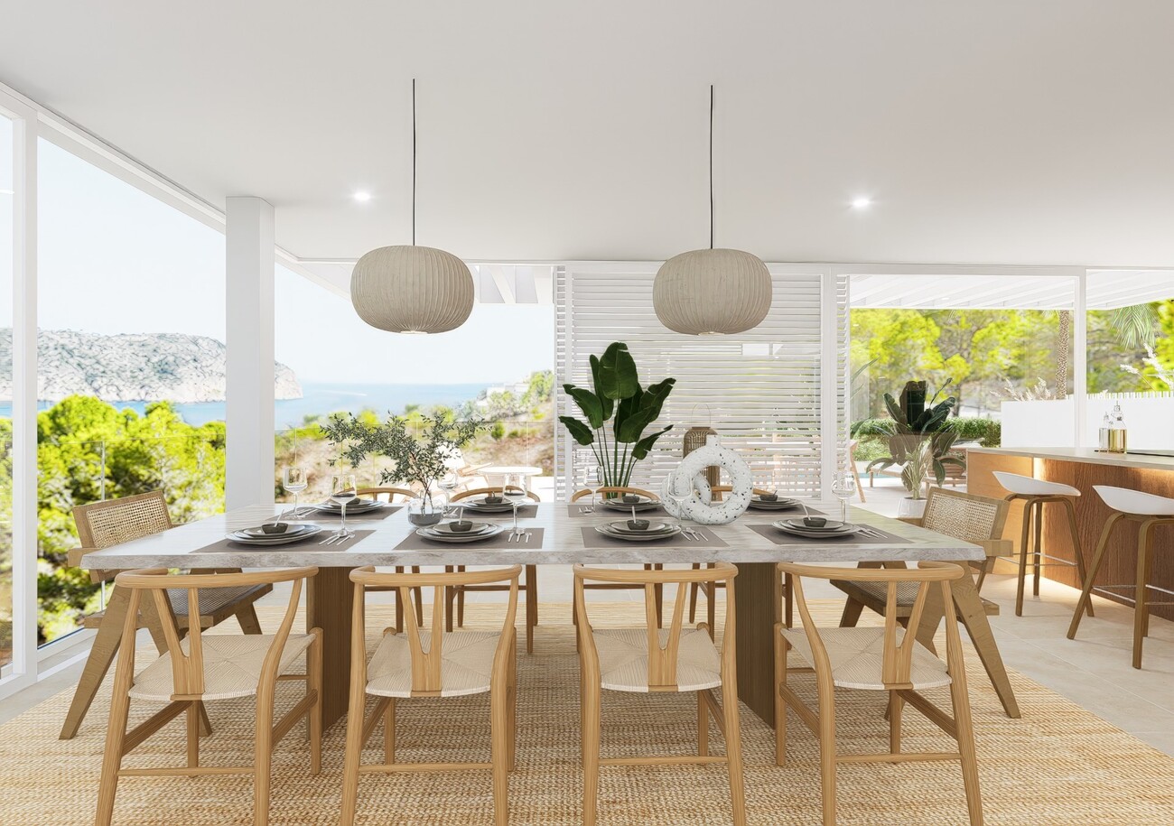 On the first floor are two double bedrooms with en-suite bathrooms and fitted wardrobes; the master bedroom has a balcony of approx. 7m2. This level also has a generous living room that seamlessly integrates with an open-plan kitchen and cooking island. Large windows and doors flood the space with natural light and offer direct access to an 18m2 terrace and a pool measuring approximately 7m2, where you can relax and take in the stunning views of Palma Bay.