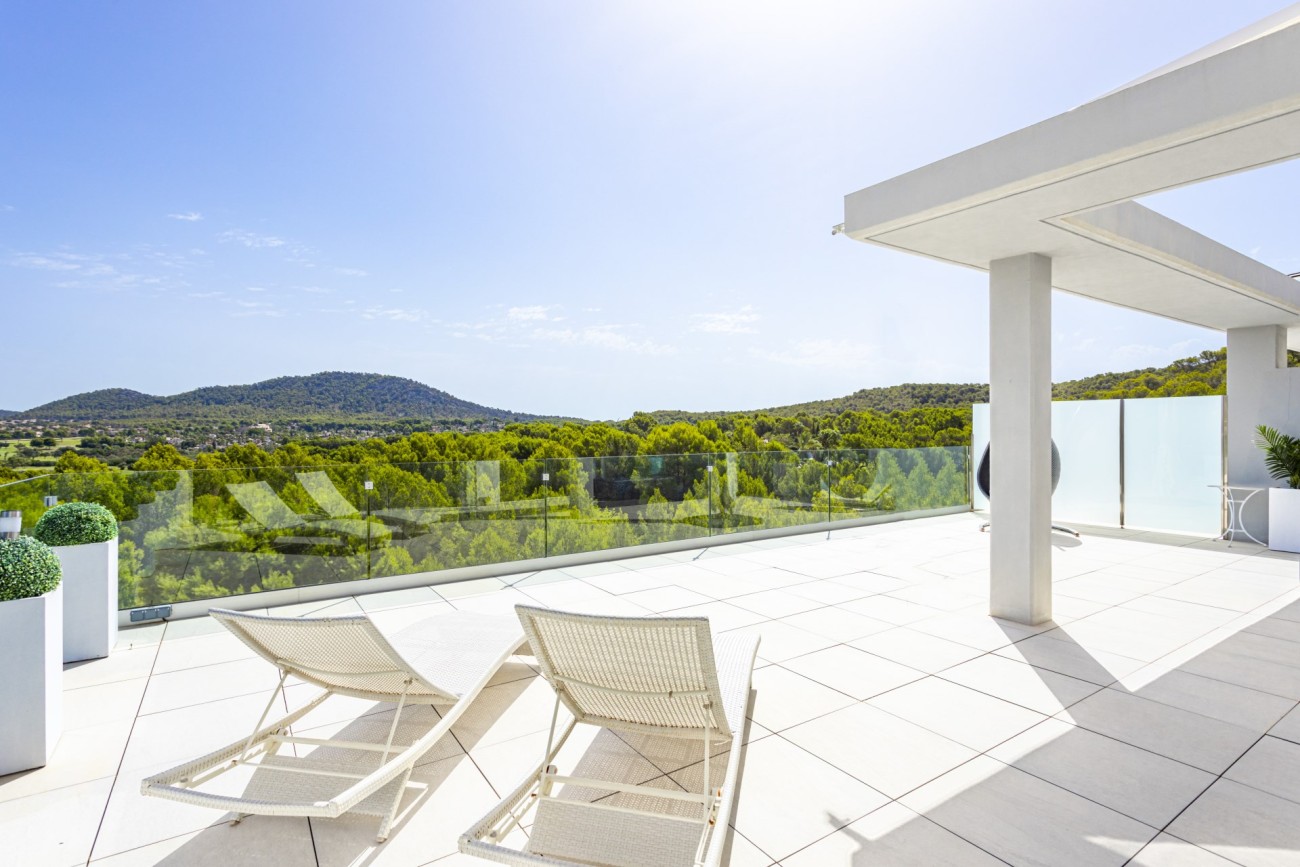 Het meest opvallende kenmerk is het overdekte terras, dat volledig kan worden afgesloten met frameloze glazen elementen. Bovendien biedt een terras van 120 m² een prachtig panoramisch uitzicht. Deze woning beschikt ook over een eigen parkeerplaats en een berging in het gebouw. Andere hoogtepunten zijn vloerverwarming, dubbele beglazing en airconditioning.