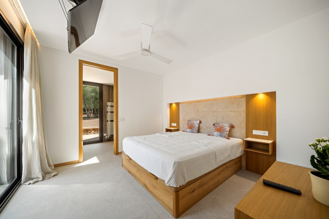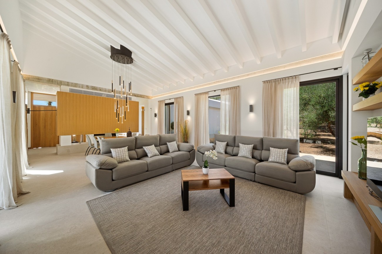 Deze nieuw gebouwde moderne finca in Porreres biedt een perfecte mix van modern design en traditionele Mallorcaanse charme. De woning ligt op een enkel niveau, op het zuiden en biedt ononderbroken uitzicht over het omringende landschap, de aangelegde tuin en het elegante zoutwaterzwembad van 48 m². De indeling is zorgvuldig gepland om het natuurlijke licht en de ruimte te maximaliseren, waardoor overal een lichte en uitnodigende sfeer is gecreëerd.