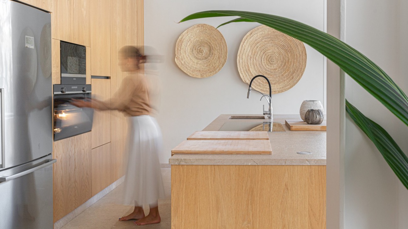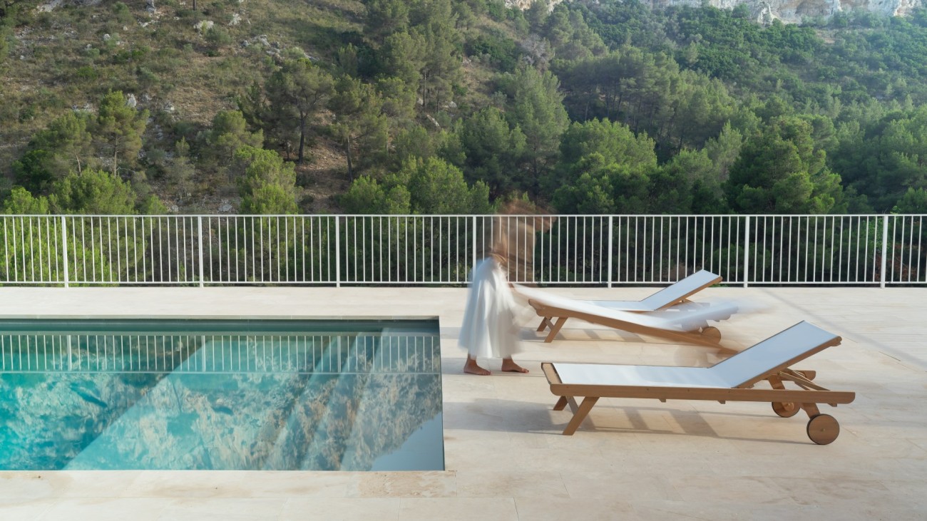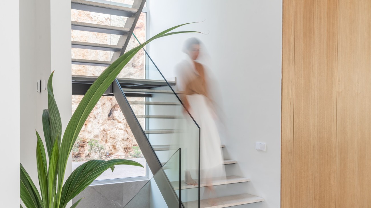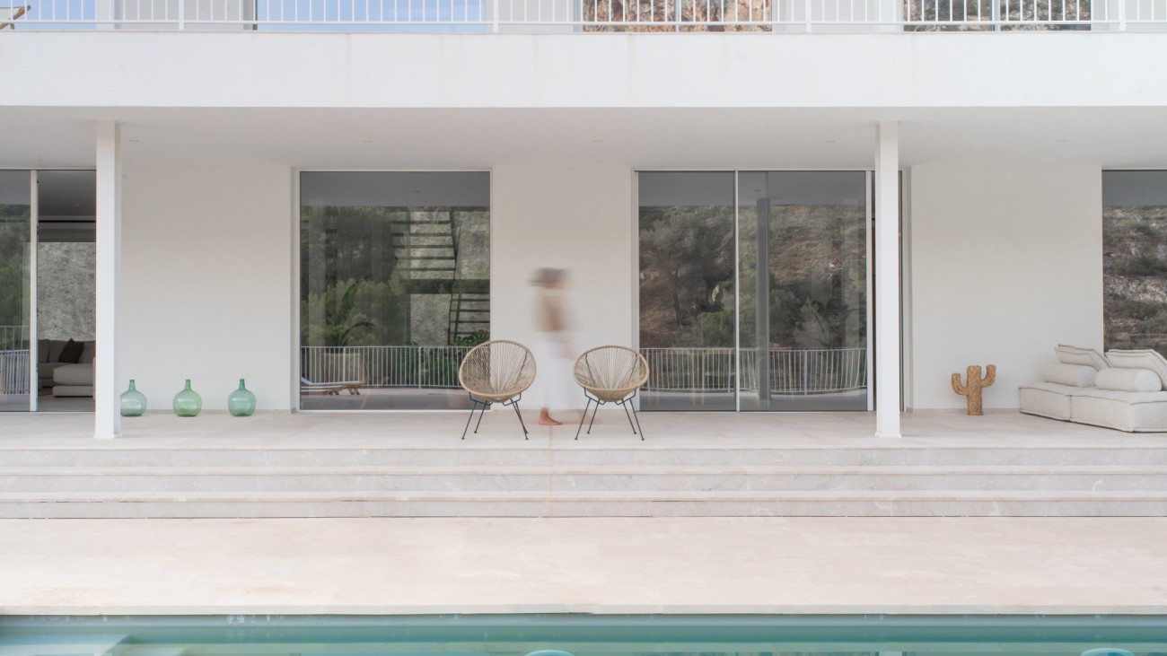 Bij binnenkomst word je getroffen door het zorgvuldige ontwerp van het lager gelegen woongedeelte, met een ruime zit- en eethoek, een moderne keuken voorzien van de nieuwste apparatuur en grote deuren van vloer tot plafond die uitkomen op het terras, dat een rustige omgeving bij het zwembad biedt.