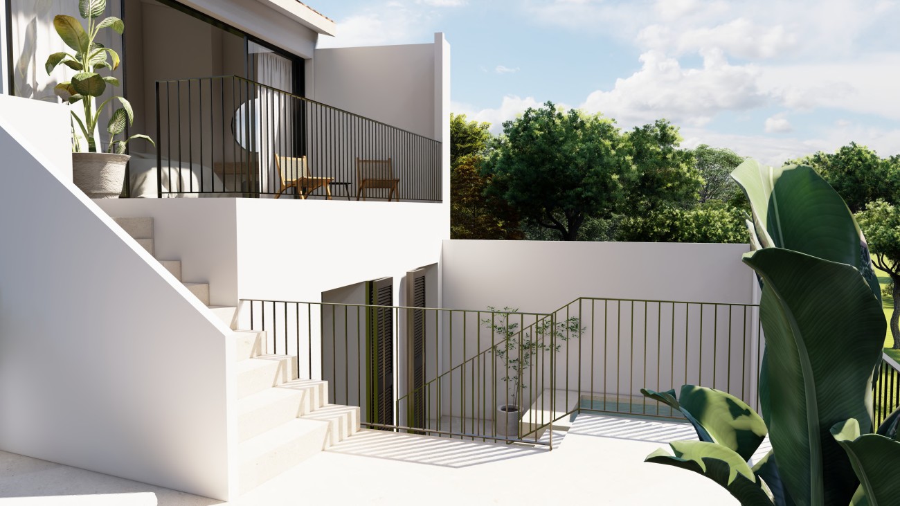 Op de bovenste verdieping bevindt zich de hoofdslaapkamer, met een ruime kleedkamer en een eigen badkamer. Vanaf het aangrenzende terras kun je genieten van de luxe jacuzzi en het schilderachtige uitzicht op de daken van Santanyi.
