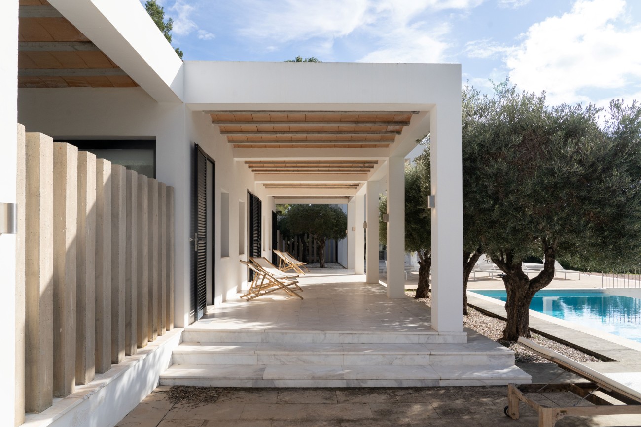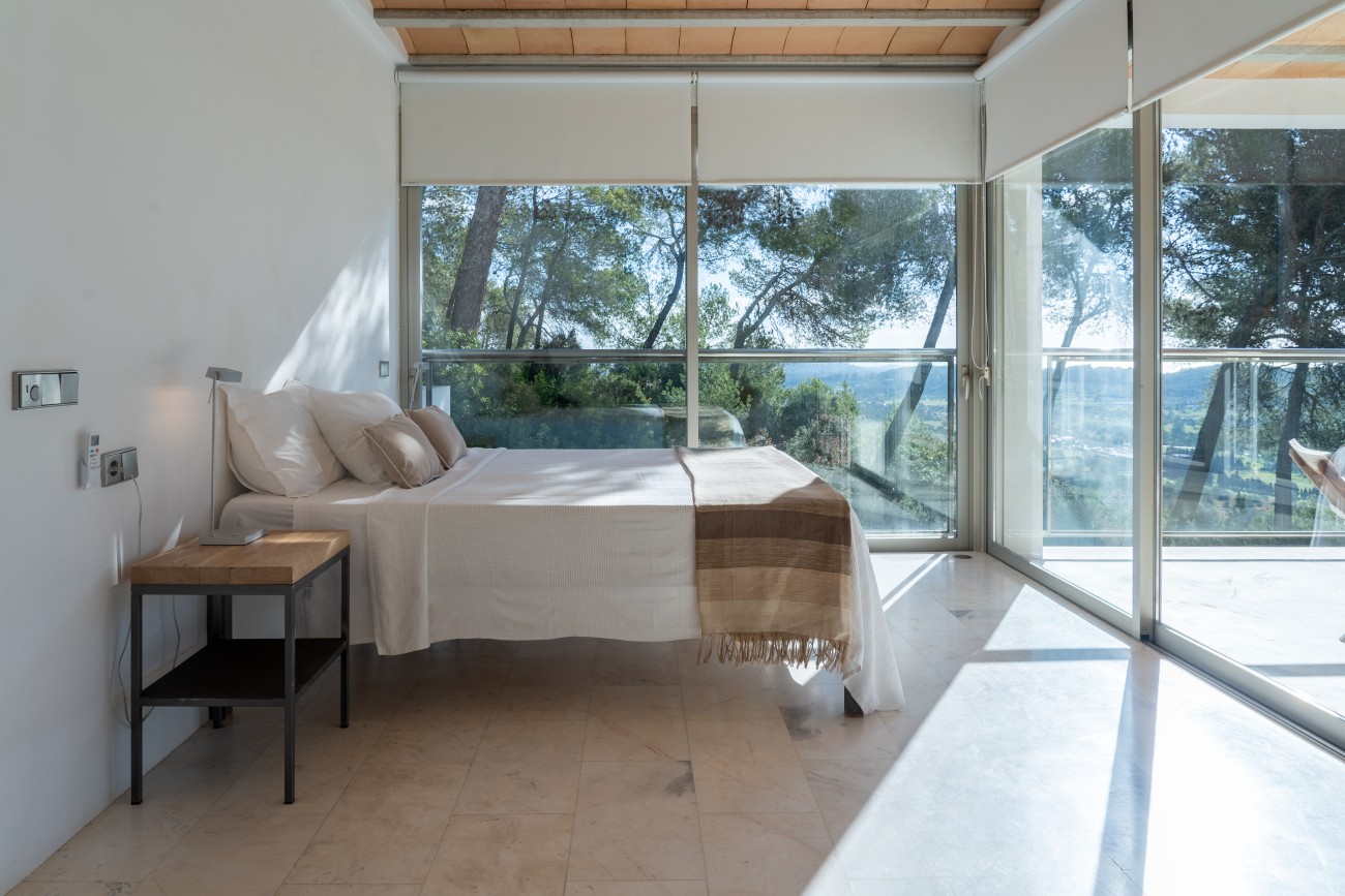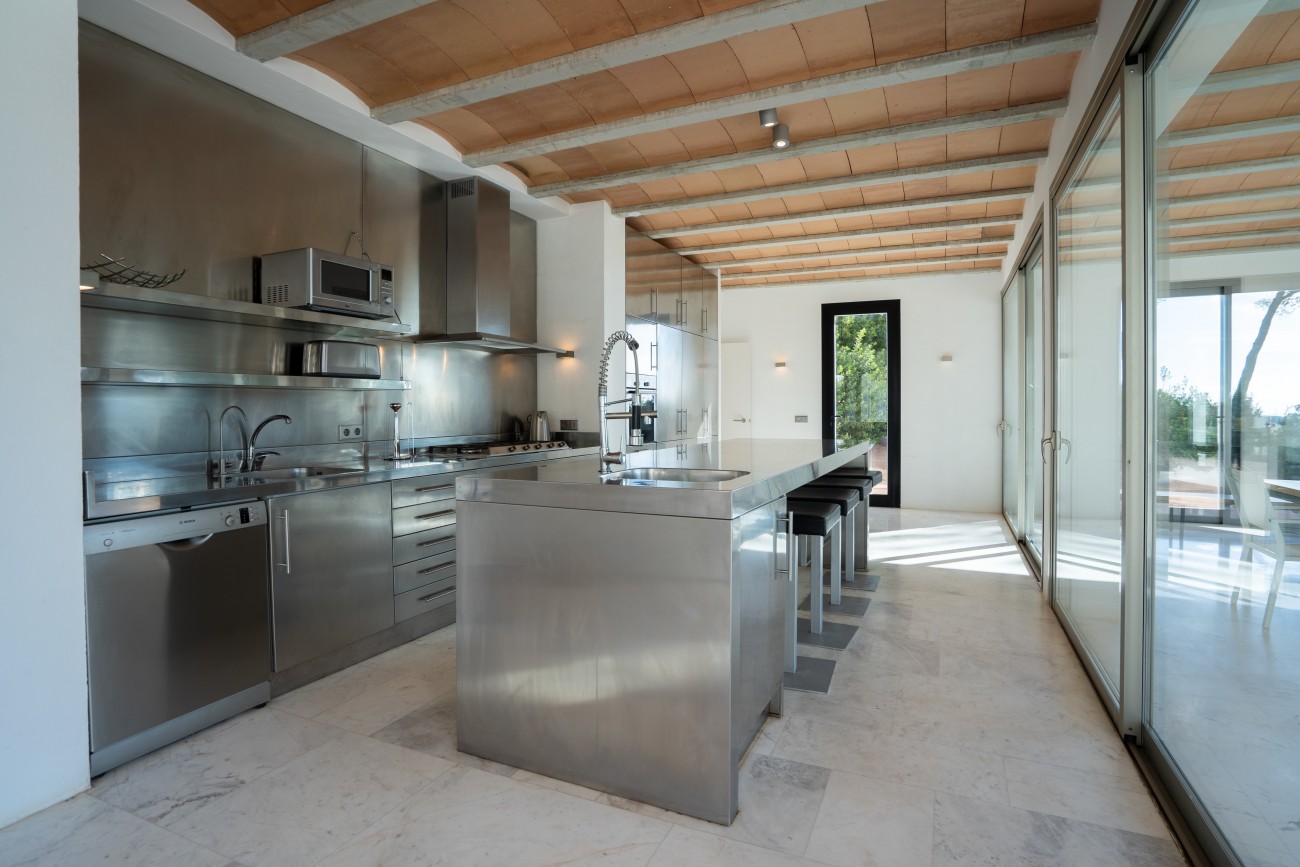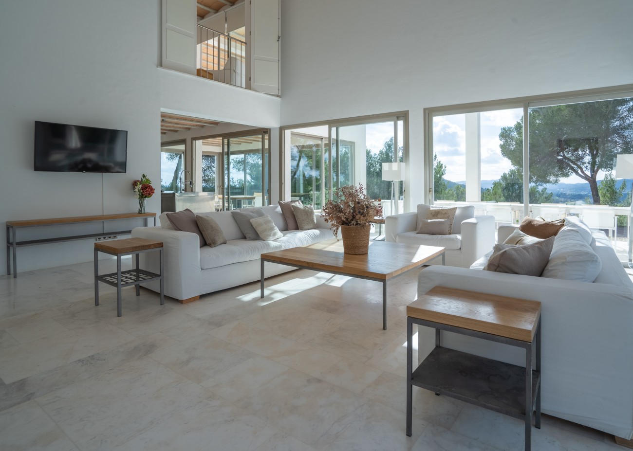 De villa heeft open woonruimtes met ramen van vloer tot plafond, waardoor het huis gevuld is met natuurlijk licht en naadloos aansluit op het buitenleven. De moderne keuken is uitgerust met eersteklas roestvrijstalen apparatuur en een centraal eiland, ideaal voor dagelijks gebruik en entertainment. De woonkamer komt uit op een terras met panoramisch uitzicht op het mediterrane landschap.