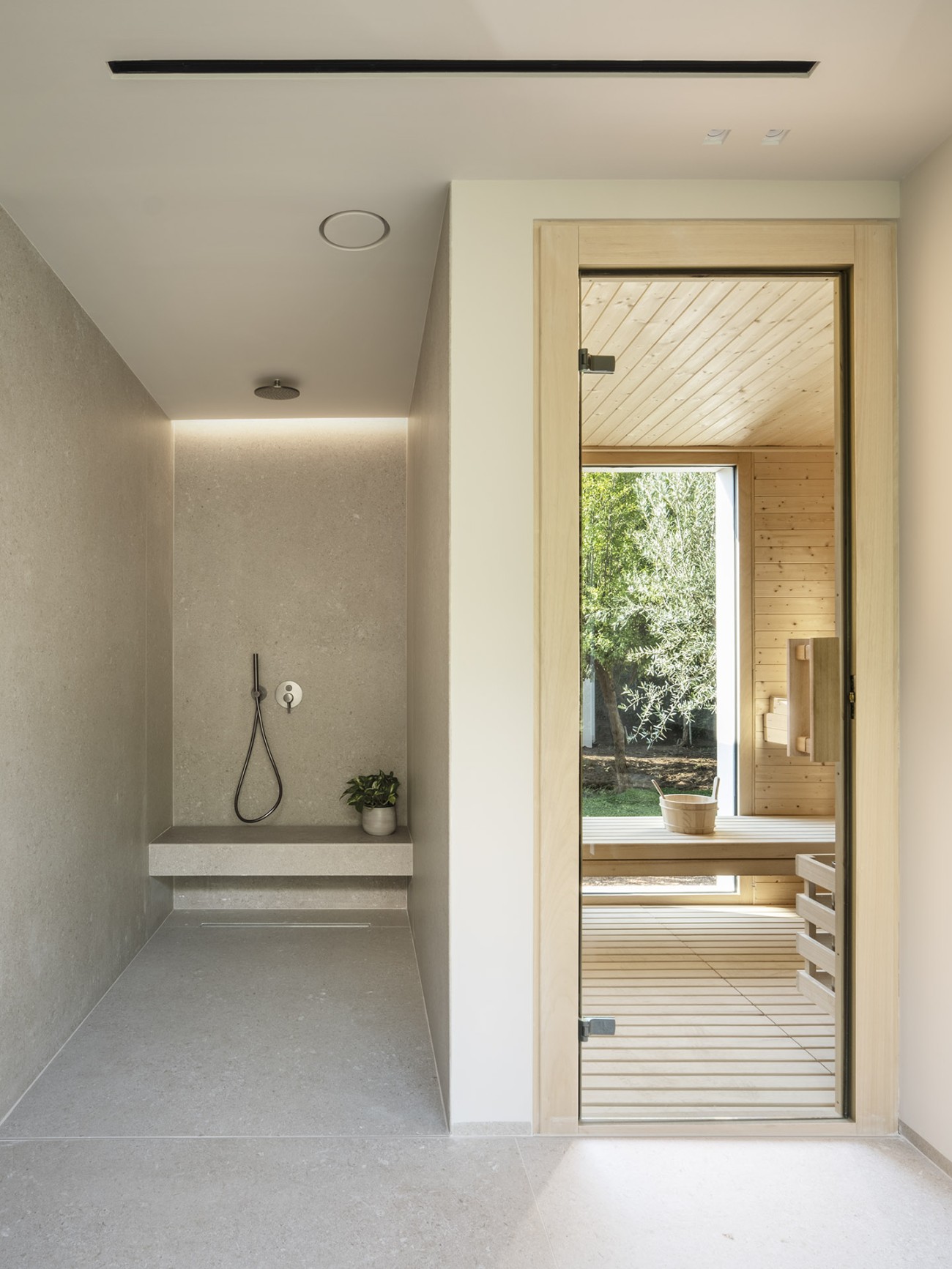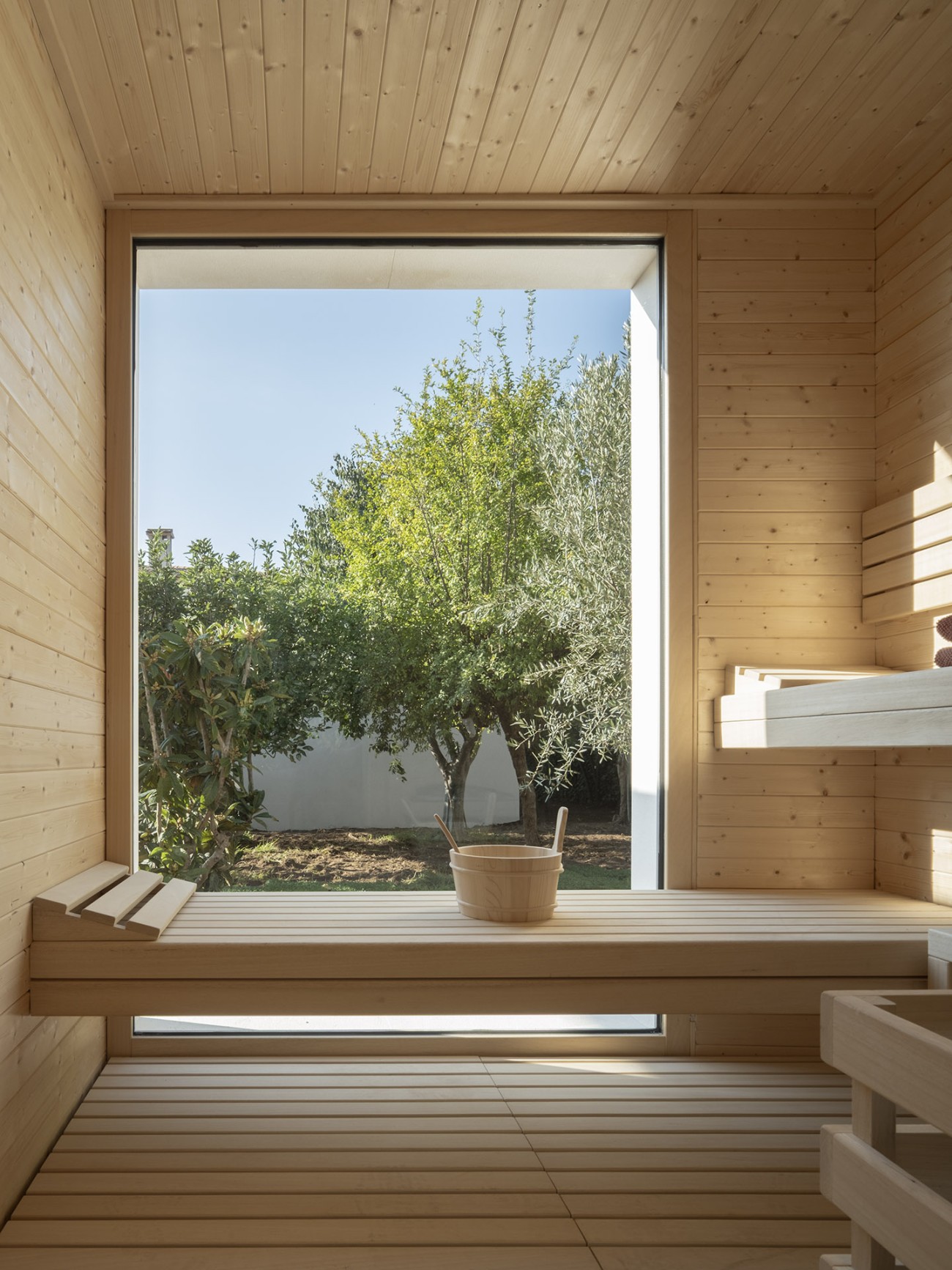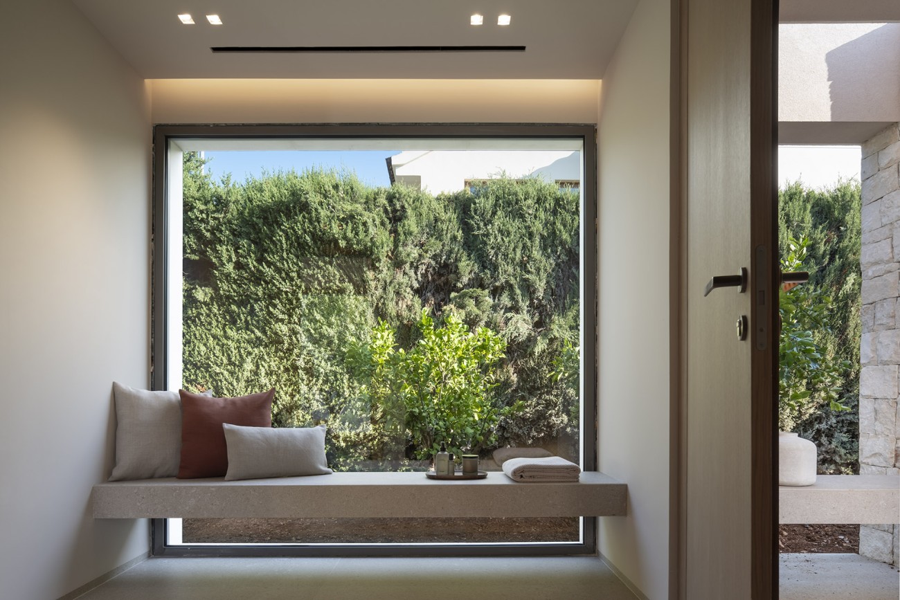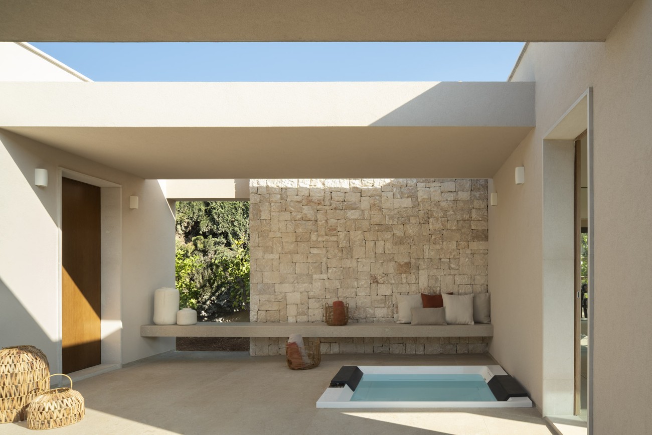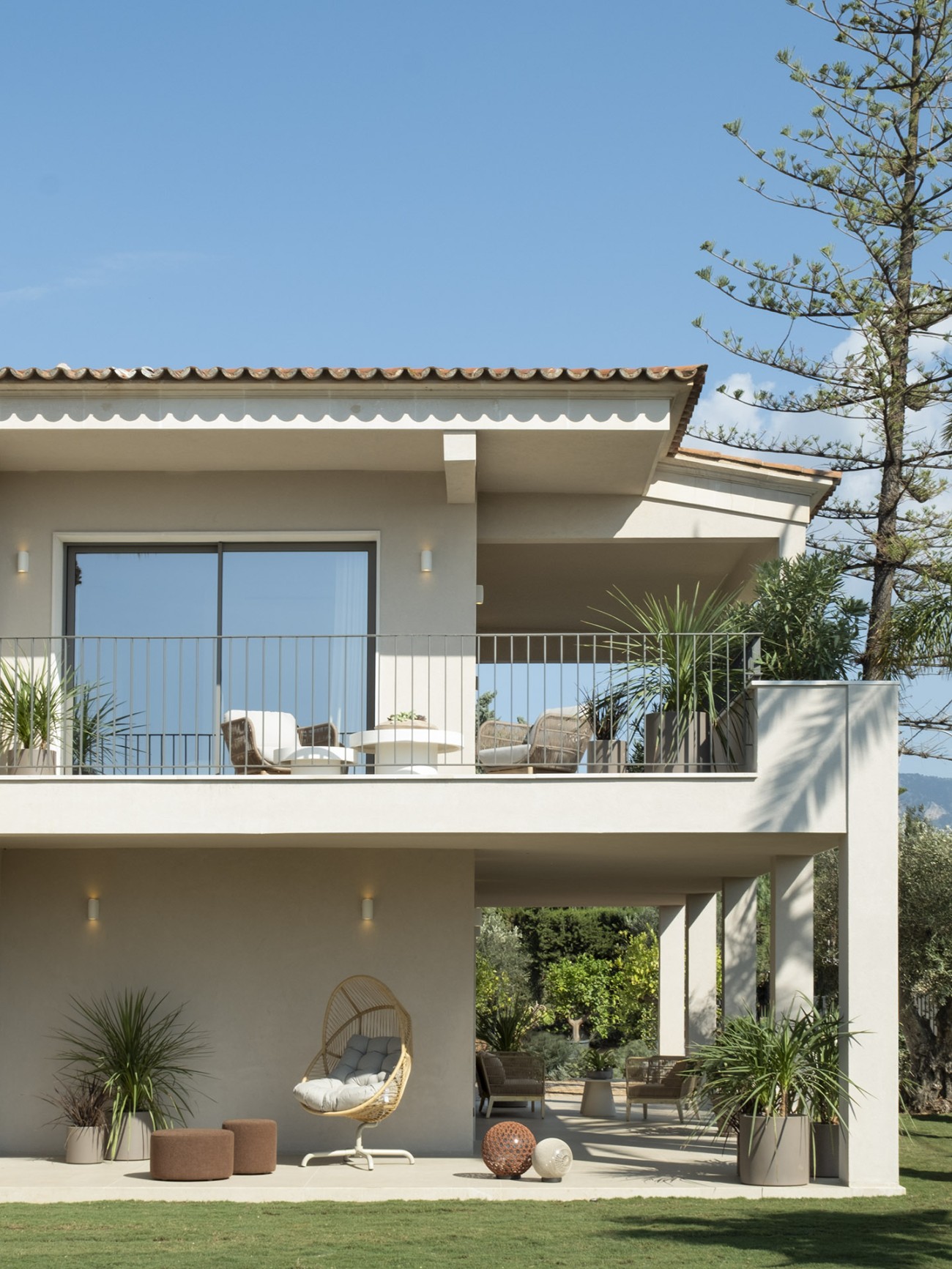 De villa is verdeeld over twee ruime verdiepingen. De begane grond heeft een open woon-, eetkamer en keuken, die naadloos de twee verschillende buitensferen van het huis met elkaar verbindt – de ene kant opent naar het verzorgde gazon en het 50 m² grote zwembad, en de andere kant naar de bloeiende boomgaard. De overdekte terrassen van in totaal 220 m² hebben een charmante zomerkeuken die ideaal is om buiten te eten.