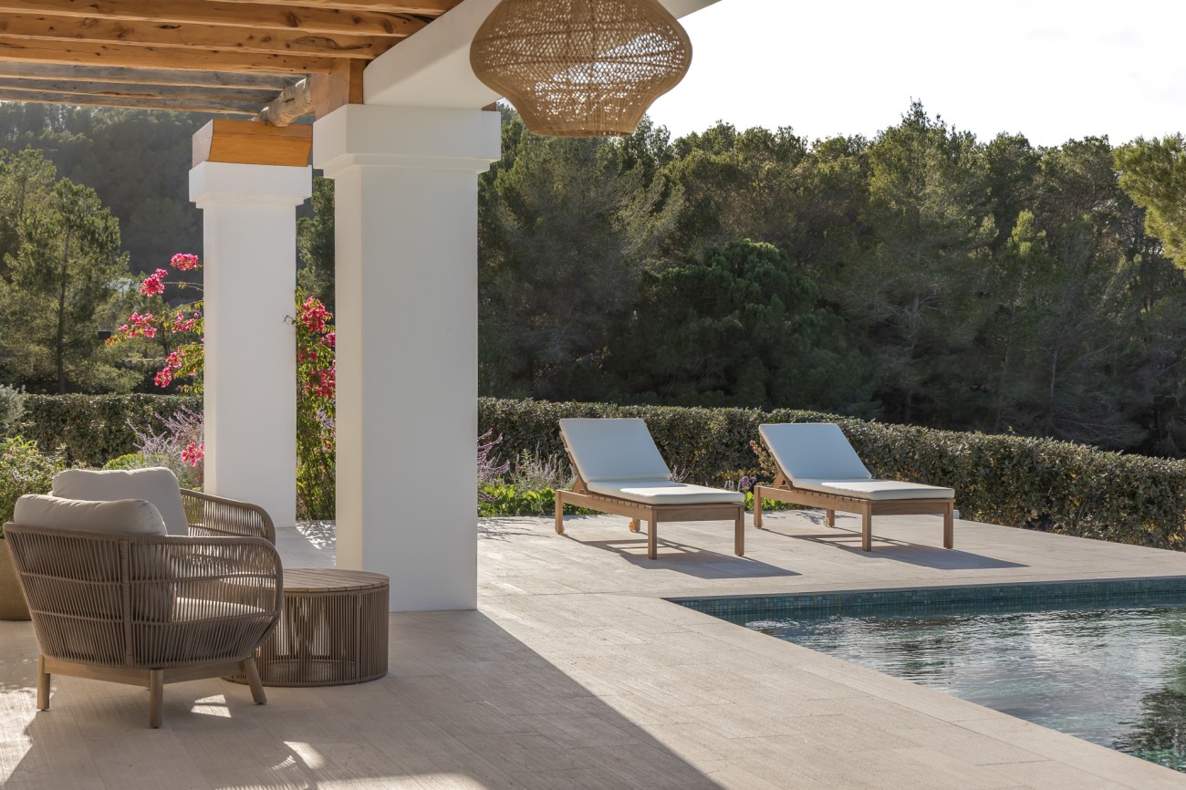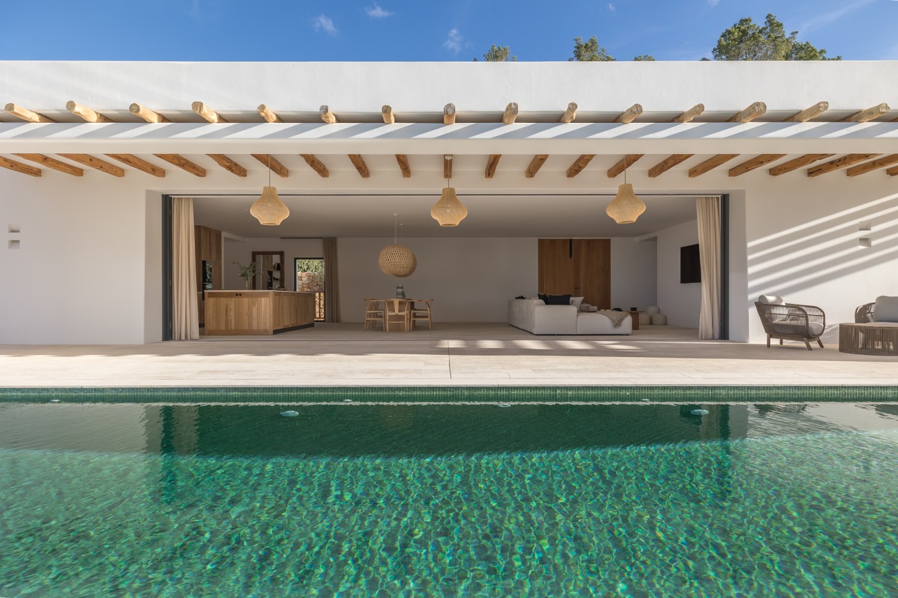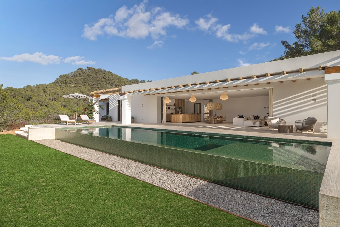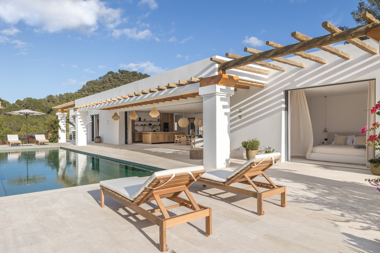 Buiten beschikt de villa over een spectaculair overloopzwembad van 78 m², naadloos geïntegreerd in uitgestrekte terrassen met uitzicht op zee. Deze buitenruimtes zijn perfect om te ontspannen, te entertainen en te genieten van Ibiza’s beroemde zonsondergangen en het hele jaar door van het mediterrane klimaat.