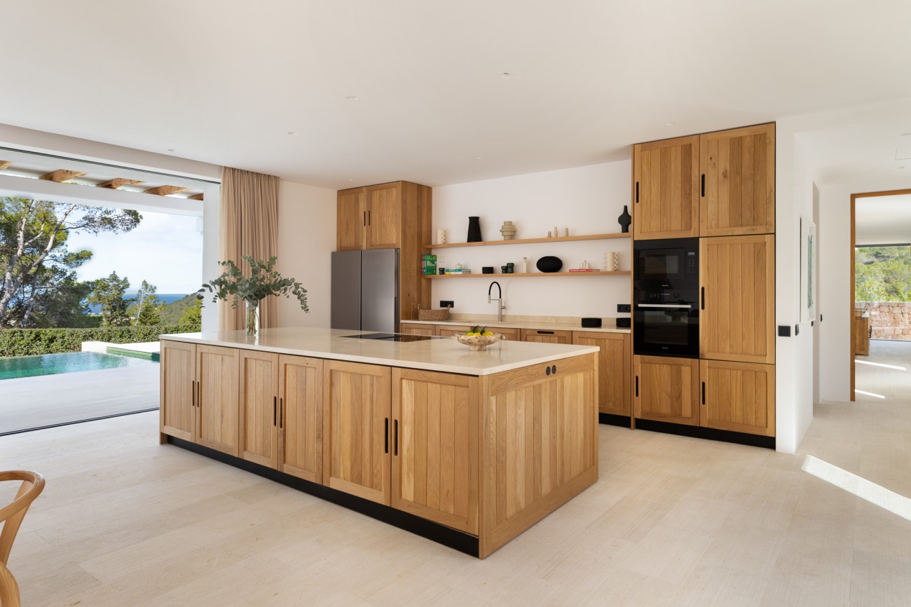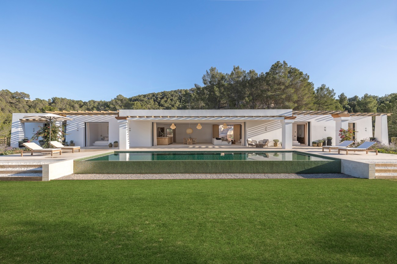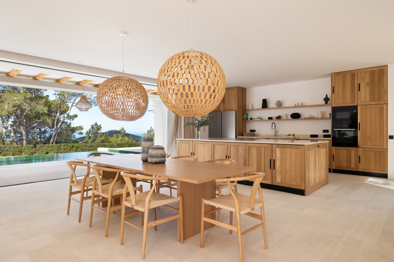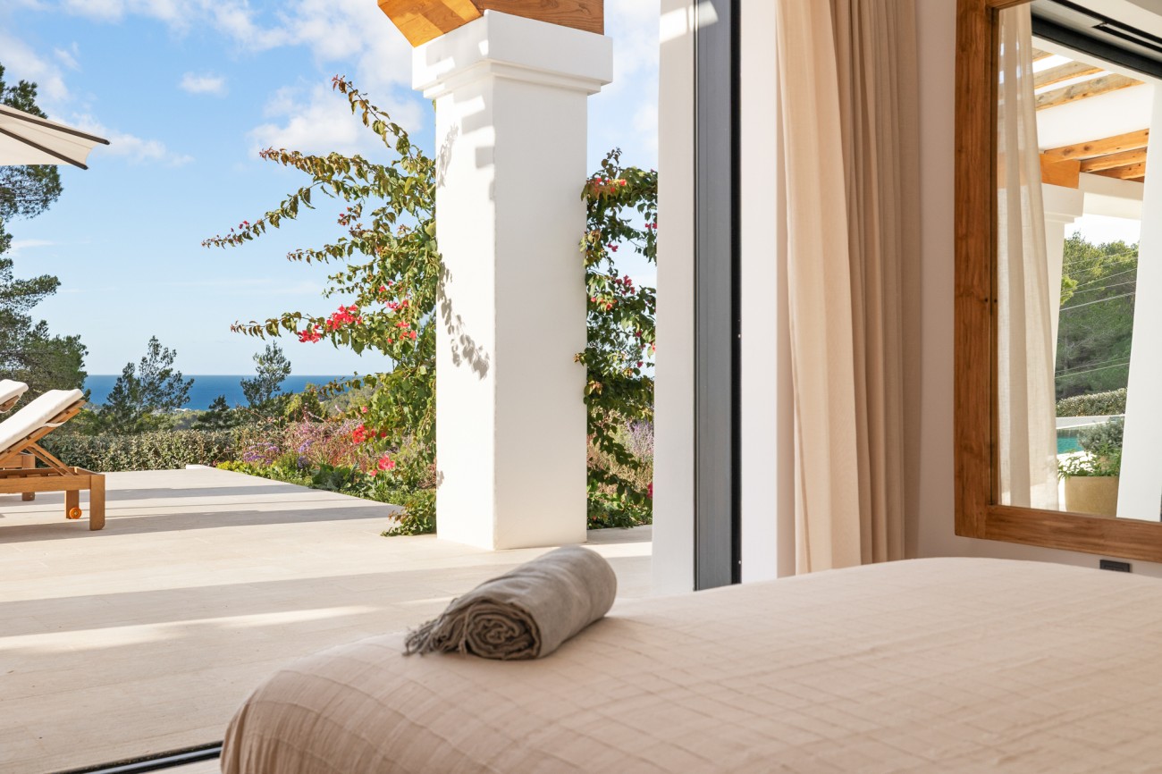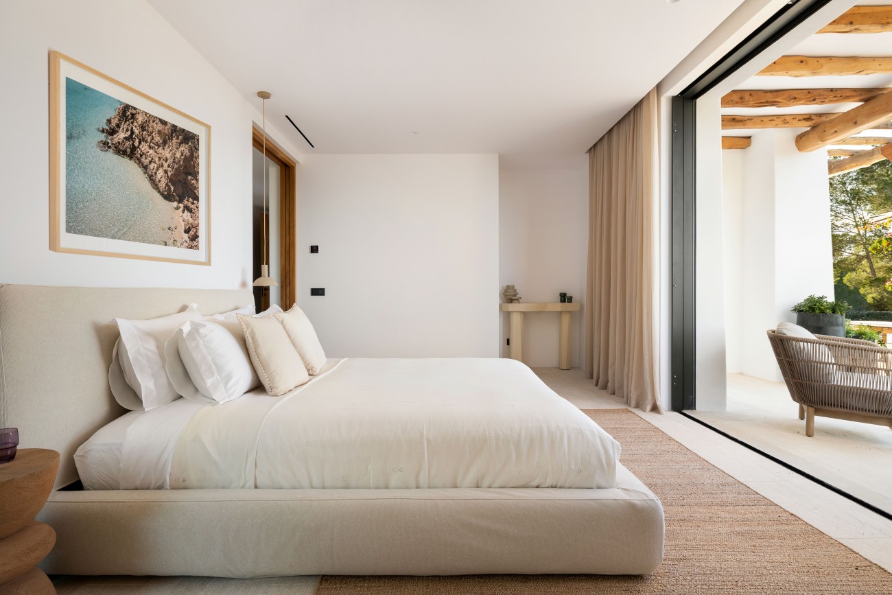 Buiten beschikt de villa over een spectaculair overloopzwembad van 78 m², naadloos geïntegreerd in uitgestrekte terrassen met uitzicht op zee. Deze buitenruimtes zijn perfect om te ontspannen, te entertainen en te genieten van Ibiza’s beroemde zonsondergangen en het hele jaar door van het mediterrane klimaat.