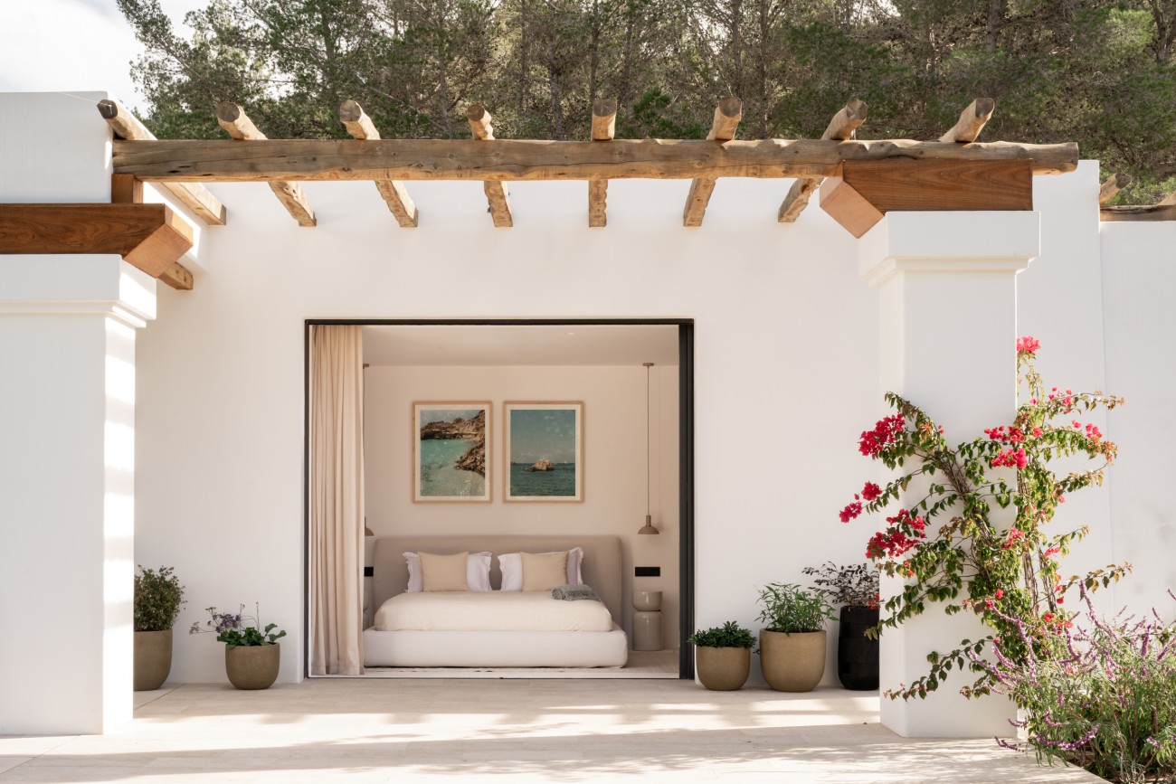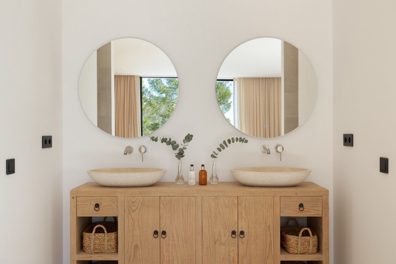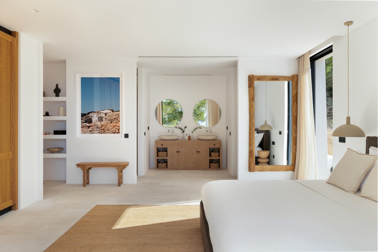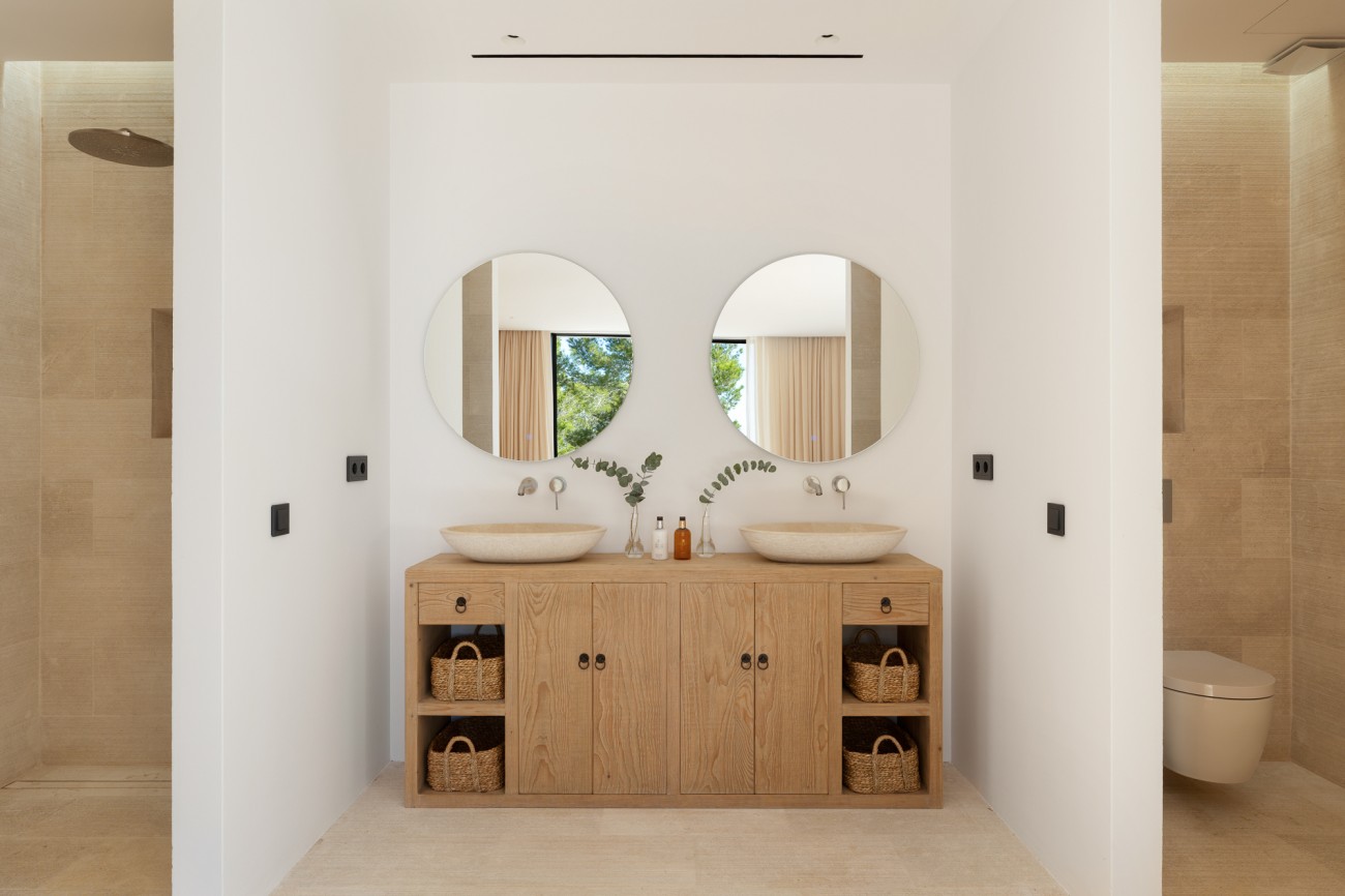 Buiten beschikt de villa over een spectaculair overloopzwembad van 78 m², naadloos geïntegreerd in uitgestrekte terrassen met uitzicht op zee. Deze buitenruimtes zijn perfect om te ontspannen, te entertainen en te genieten van Ibiza’s beroemde zonsondergangen en het hele jaar door van het mediterrane klimaat.