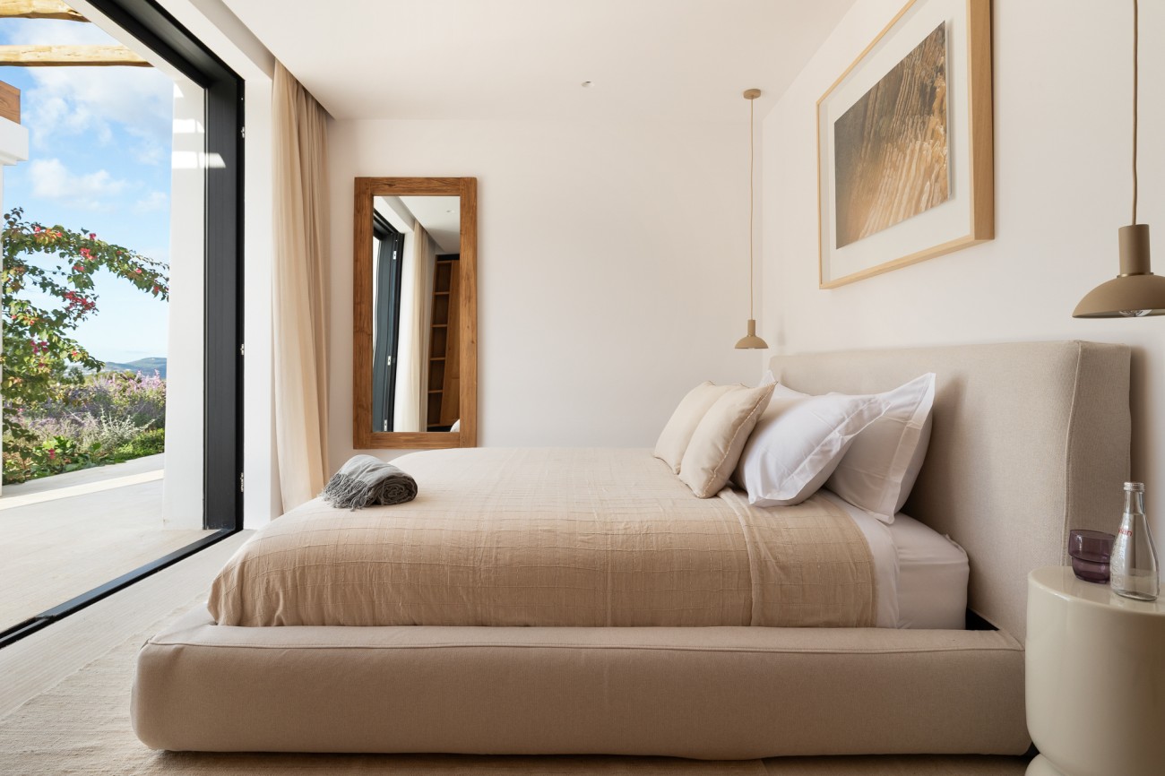 Deze eigentijdse villa is ontworpen volgens de hoogste normen en heeft een uitzonderlijk ruim en licht interieur. De zorgvuldig geplande lay-out omvat vier elegante slaapkamers met eigen badkamer, elk met comfort, privacy en verfijnd design. Ramen van vloer tot plafond versterken het gevoel van ruimte en omlijsten het prachtige uitzicht op zee en de zonsondergang.