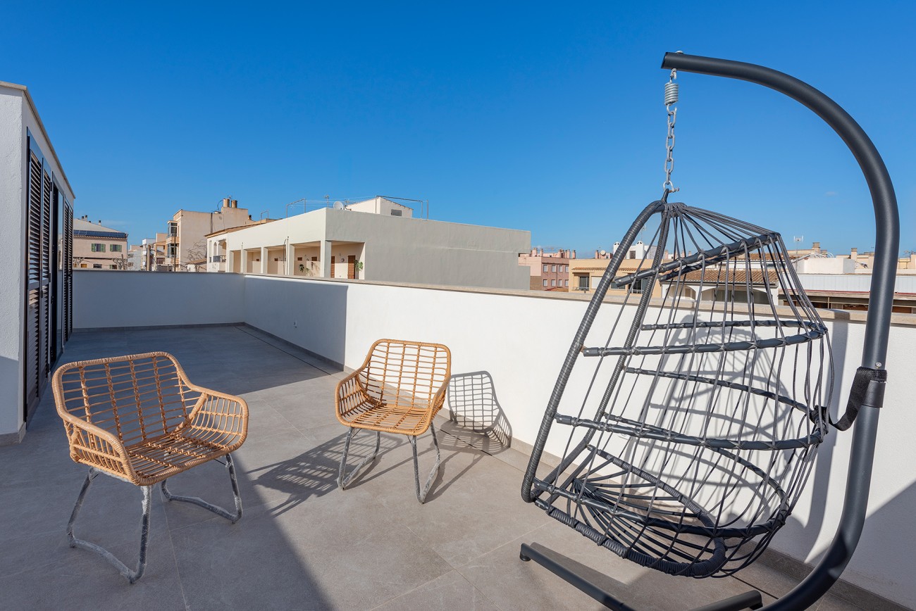 De buitenruimte biedt een sereen toevluchtsoord, met een privézwembad en een dakterras