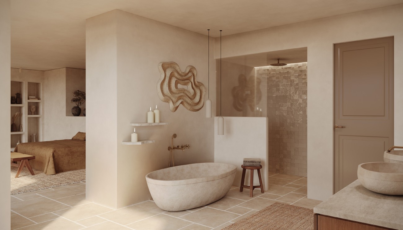 Eerste verdieping: Drie tweepersoonsslaapkamers, elk met eigen badkamer, waaronder een master suite van 55 m².