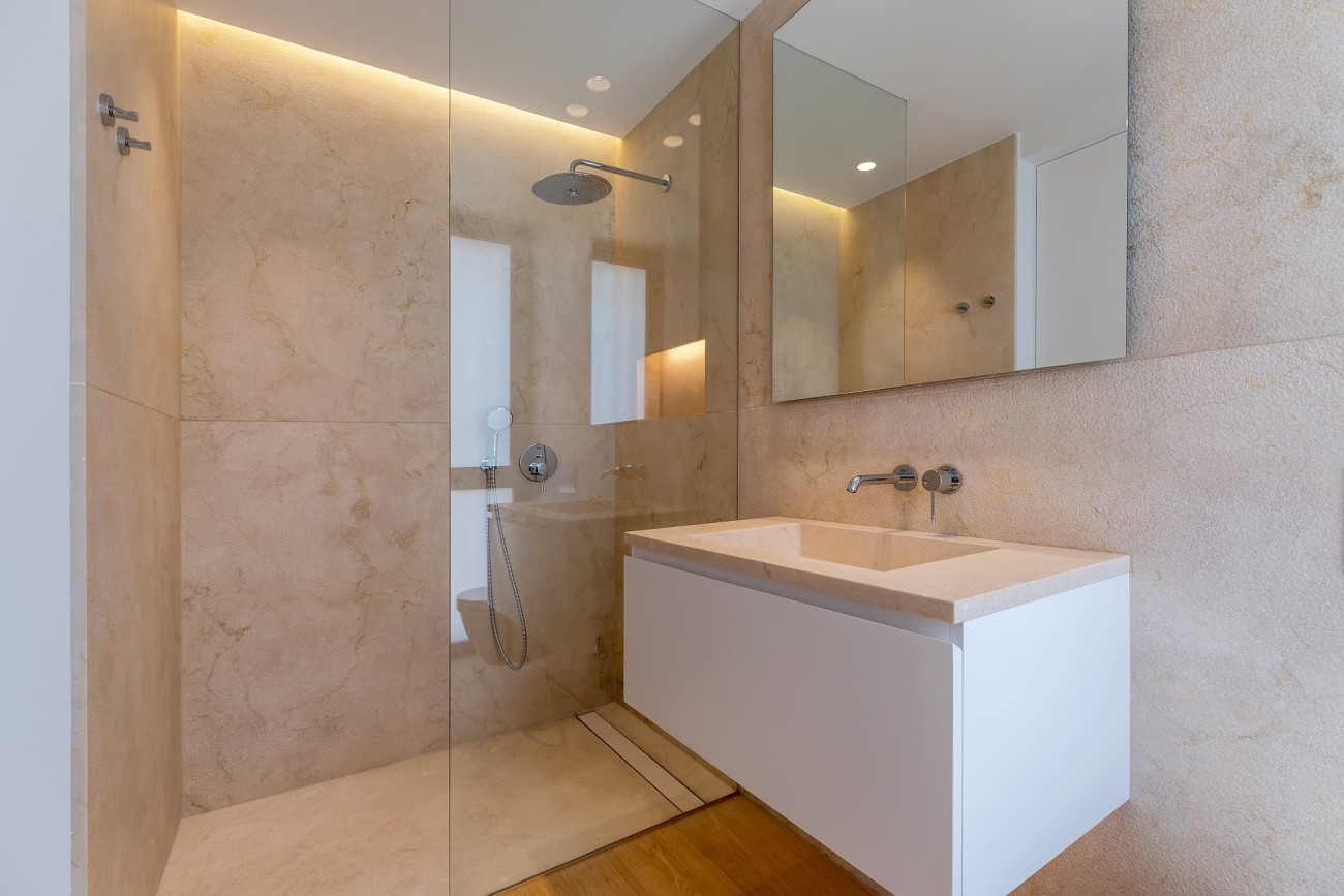 Op de eerste verdieping bevinden zich twee weelderige slaapkamersuites en twee tweepersoonsslaapkamers die een badkamer delen. Er is ook een open galerij met een speciale werkruimte die uitkijkt op de woonruimte eronder, wat het gevoel van licht en ruimte versterkt.