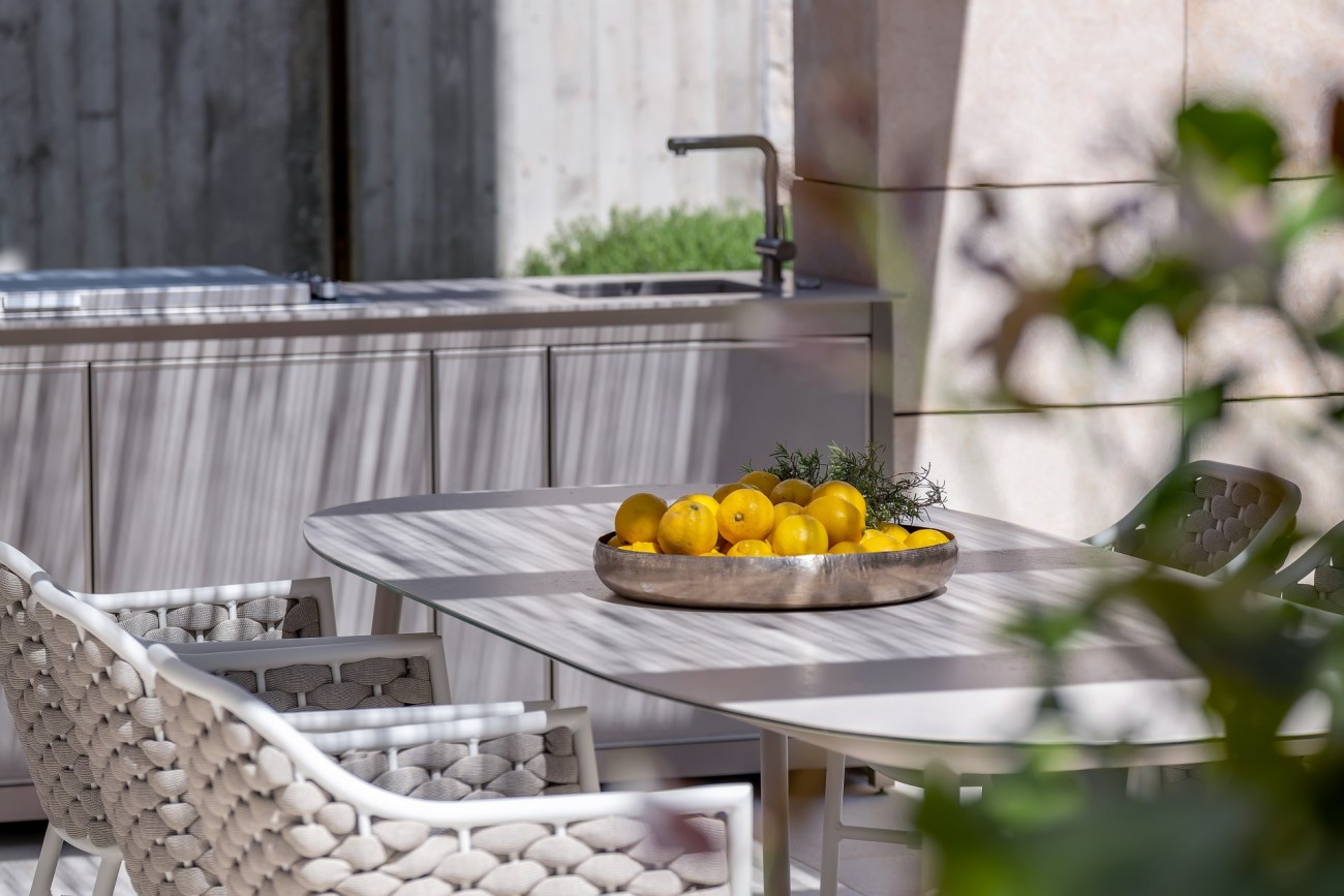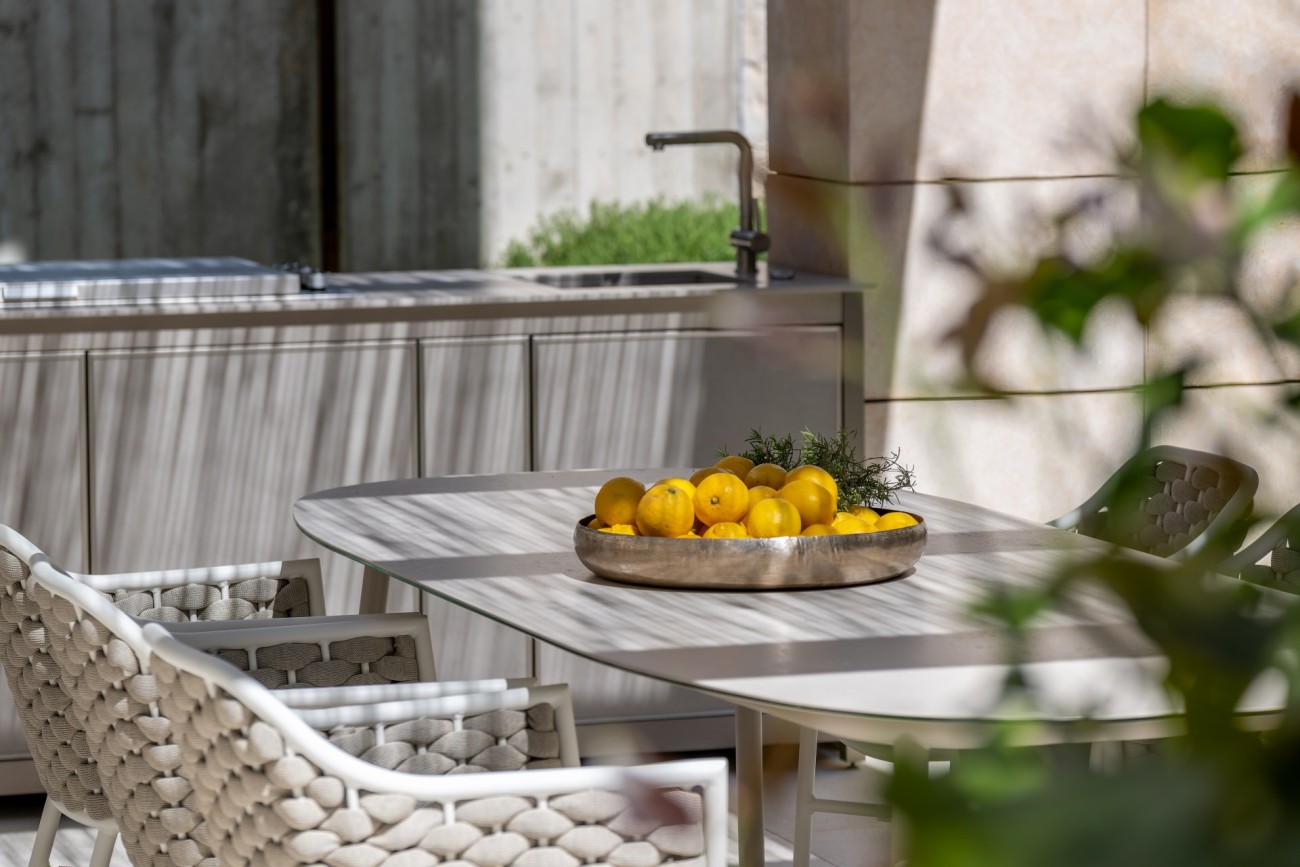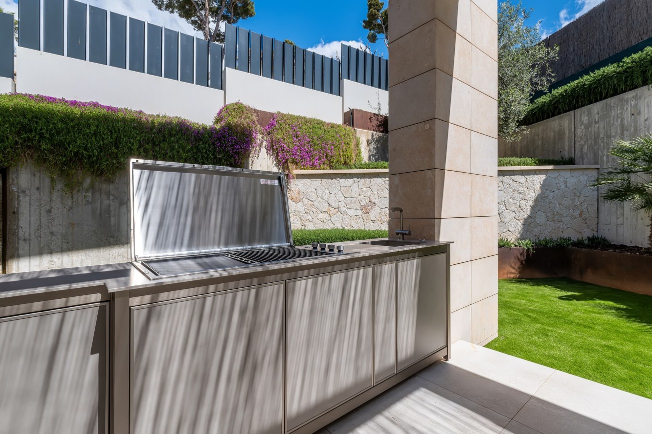 Buiten zijn er gemakkelijk te onderhouden tuinen, verschillende terrassen om te ontspannen in de schaduw of te zonnebaden bij het zoutwaterzwembad , en er is een eethoek met zomerkeuken waar je gasten kunt ontvangen.