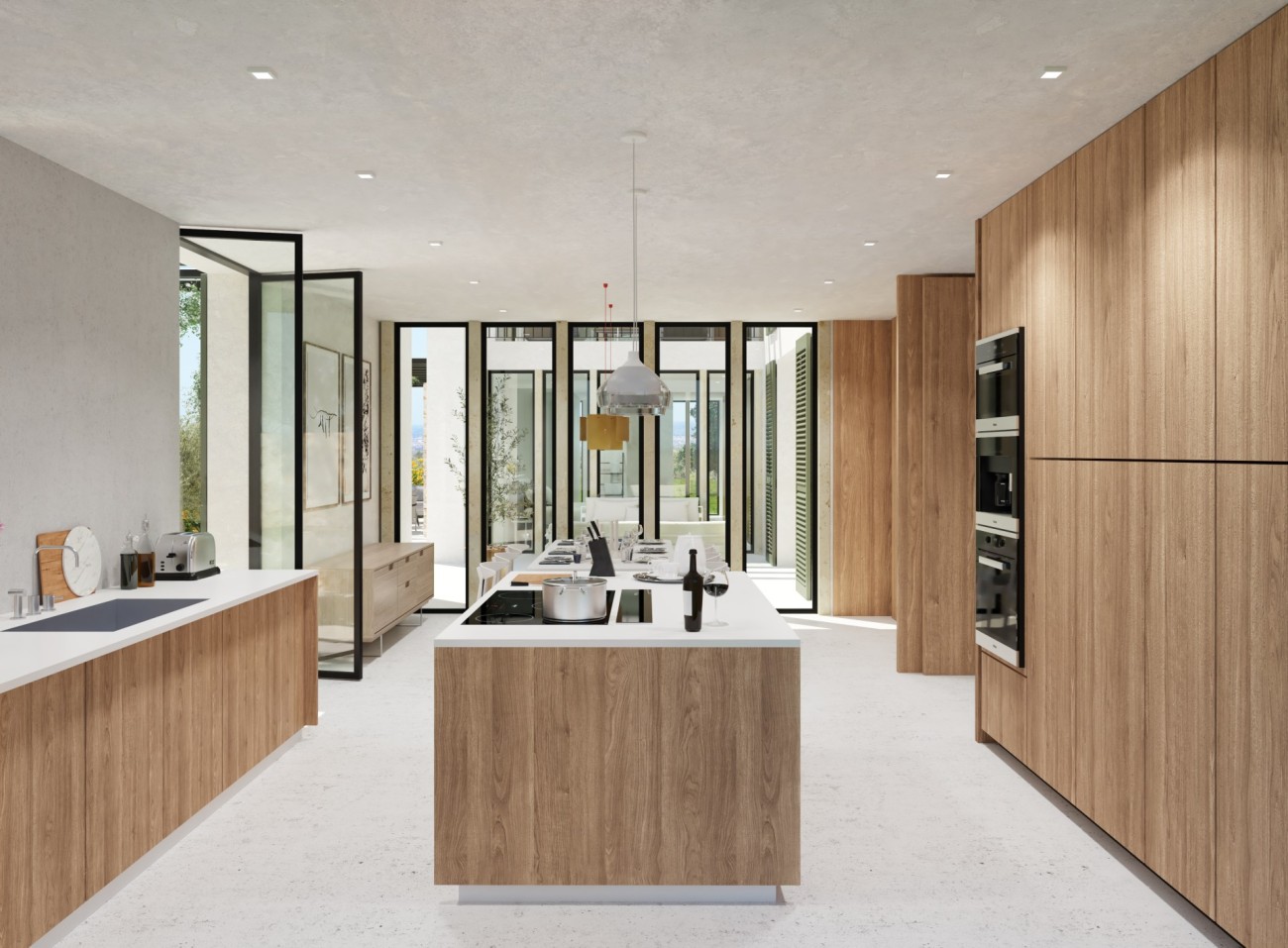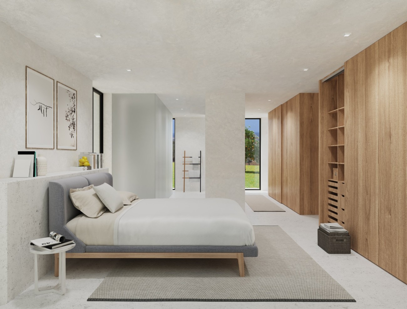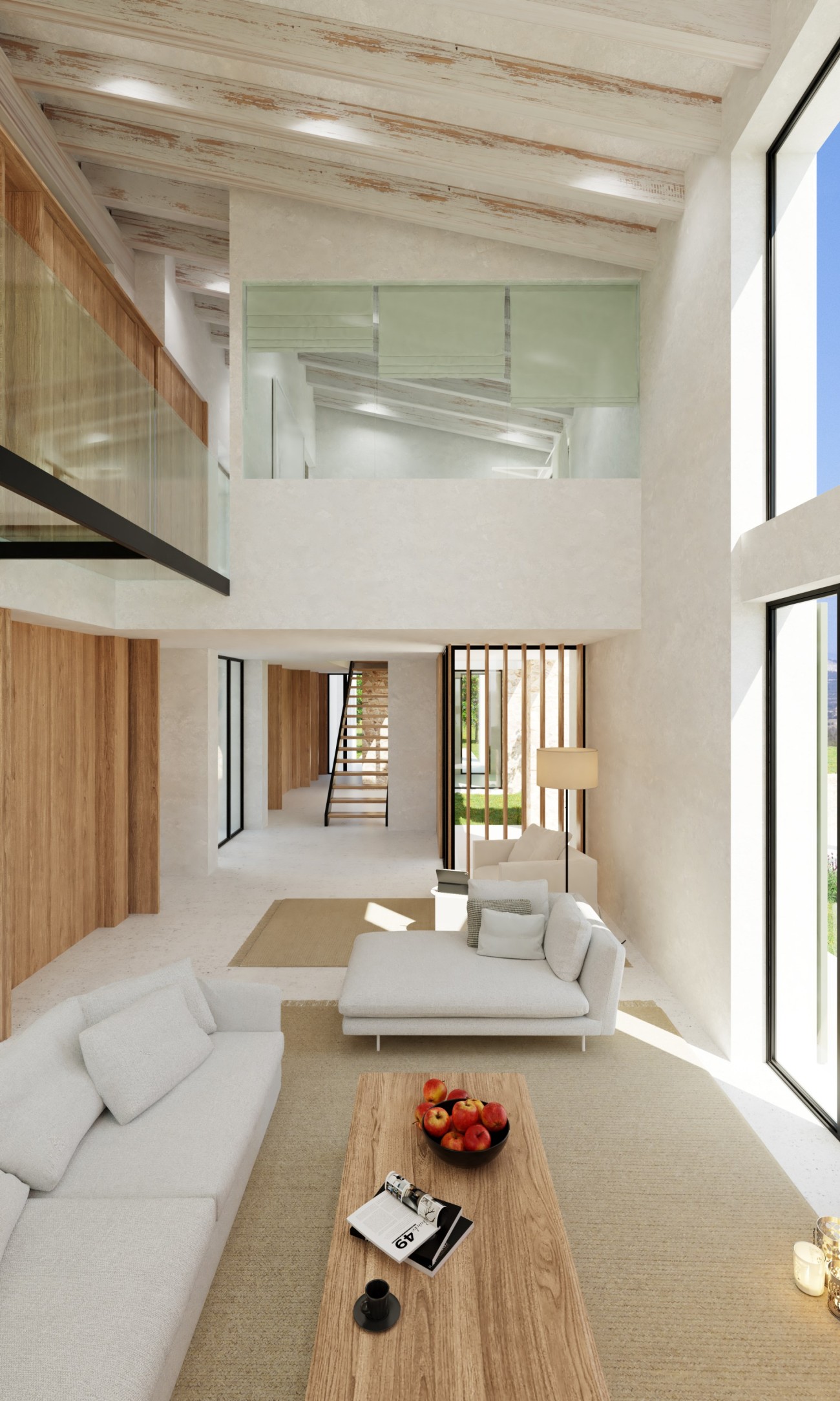 De geplande indeling is verdeeld over twee verdiepingen en omvat vier slaapkamers, vier badkamers en een extra gastentoilet. Grote binnenruimtes zijn ontworpen om het natuurlijke licht te maximaliseren, met voorzieningen voor een wasruimte en bijkeuken. Een zwembad van 15 meter lang is aanwezig, samen met een royale buitenparkeerplaats voor meerdere voertuigen. Ramen zijn nog niet geïnstalleerd, waardoor er flexibiliteit is in ontwerp en materialen om te voldoen aan de uiteindelijke esthetische en comforteisen.