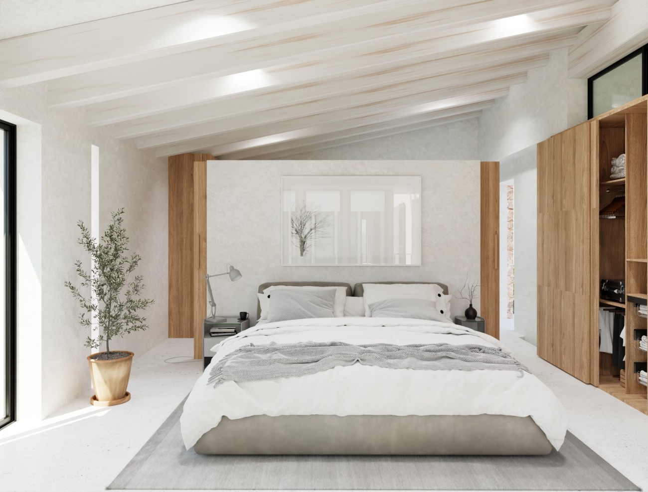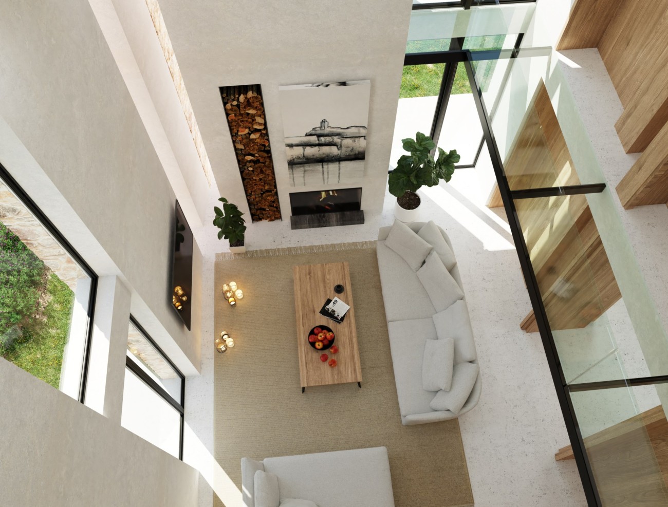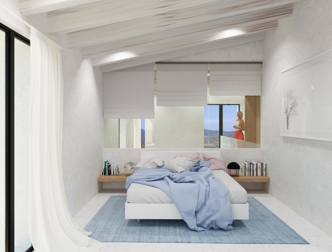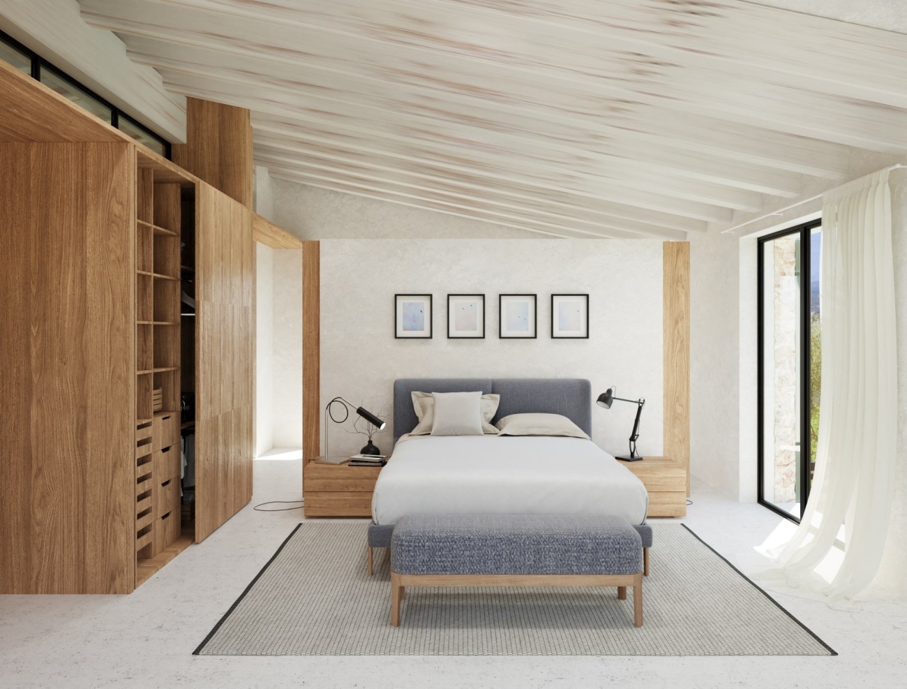 De geplande indeling is verdeeld over twee verdiepingen en omvat vier slaapkamers, vier badkamers en een extra gastentoilet. Grote binnenruimtes zijn ontworpen om het natuurlijke licht te maximaliseren, met voorzieningen voor een wasruimte en bijkeuken. Een zwembad van 15 meter lang is aanwezig, samen met een royale buitenparkeerplaats voor meerdere voertuigen. Ramen zijn nog niet geïnstalleerd, waardoor er flexibiliteit is in ontwerp en materialen om te voldoen aan de uiteindelijke esthetische en comforteisen.