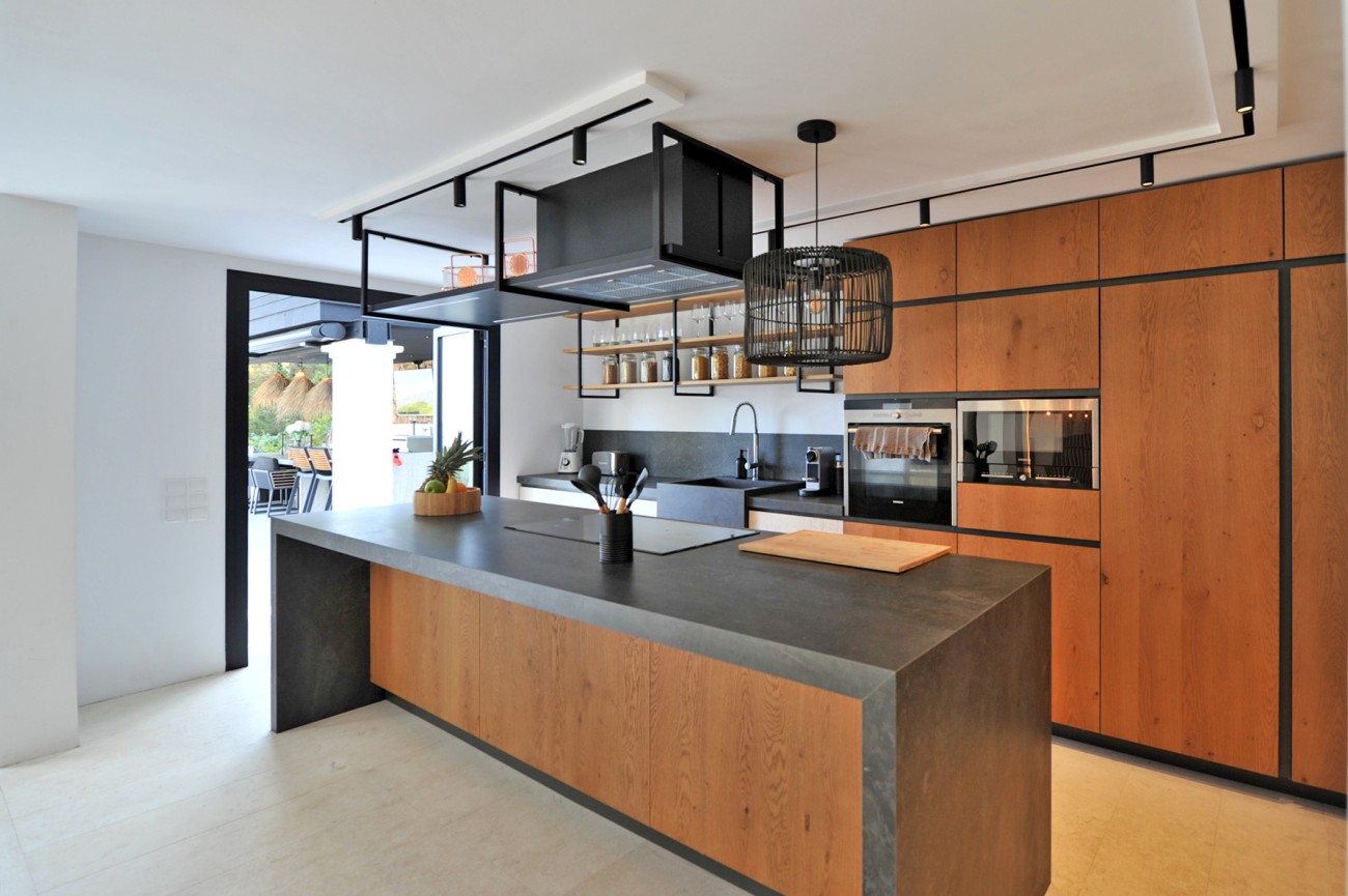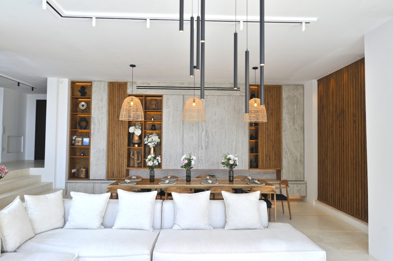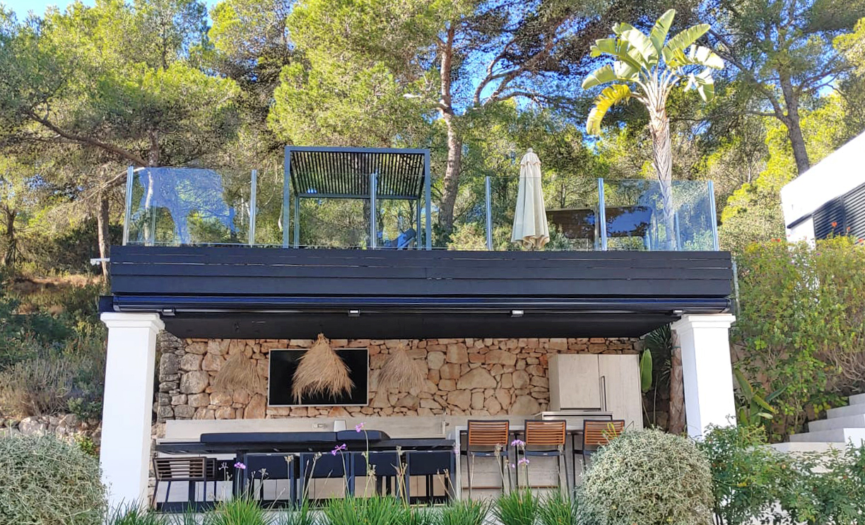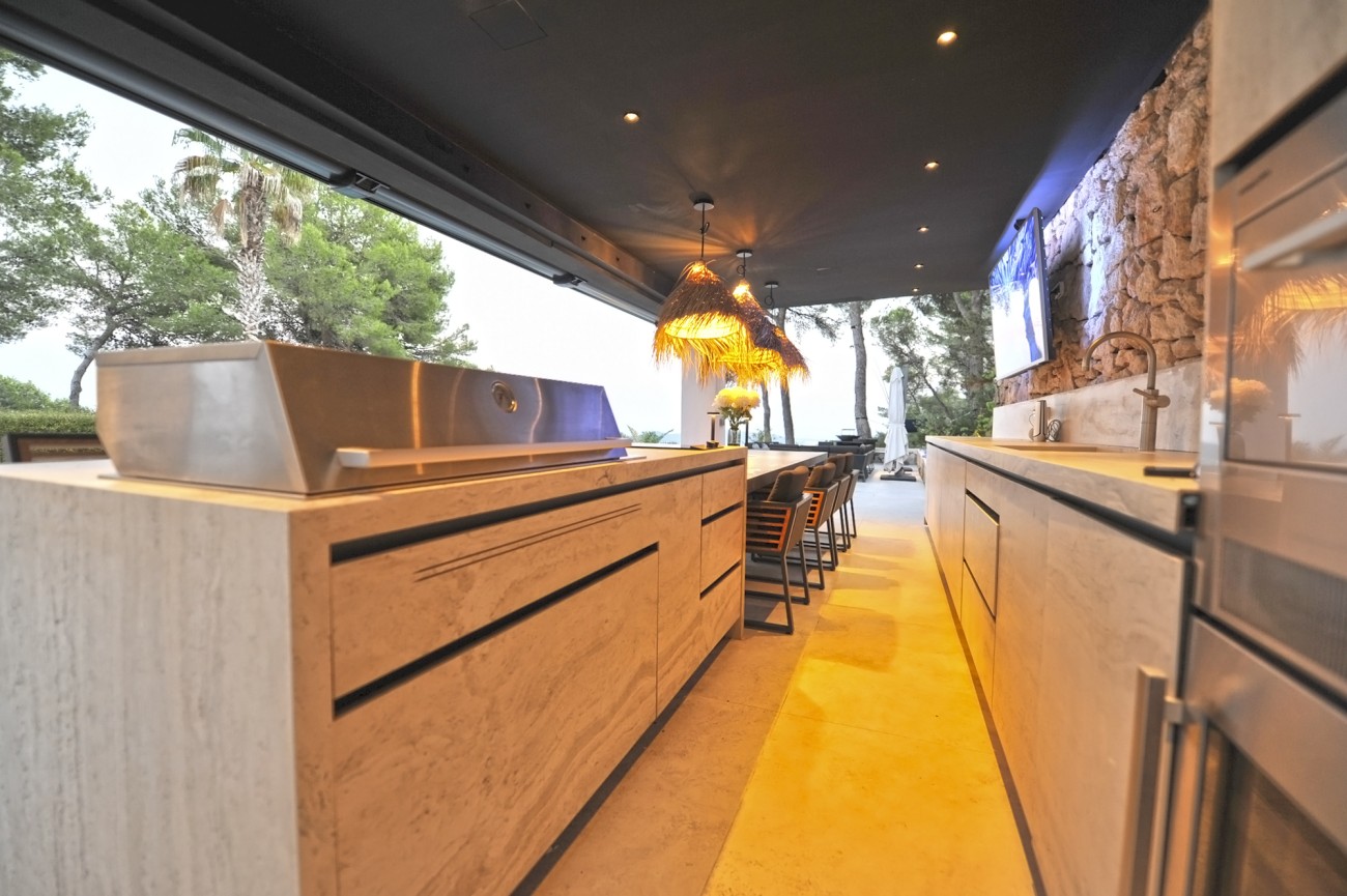 Buiten creëren een zwembad van 65 m², aangelegde tuinen, overdekte terrassen en een buitenkeuken de perfecte omgeving om buiten te ontspannen en te dineren, terwijl je geniet van panoramisch uitzicht op zee.