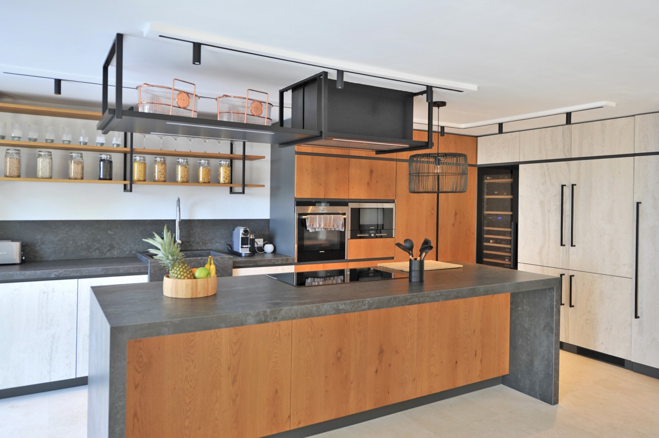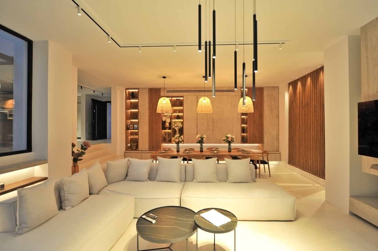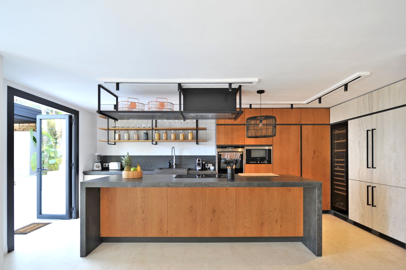 Buiten creëren een zwembad van 65 m², aangelegde tuinen, overdekte terrassen en een buitenkeuken de perfecte omgeving om buiten te ontspannen en te dineren, terwijl je geniet van panoramisch uitzicht op zee.