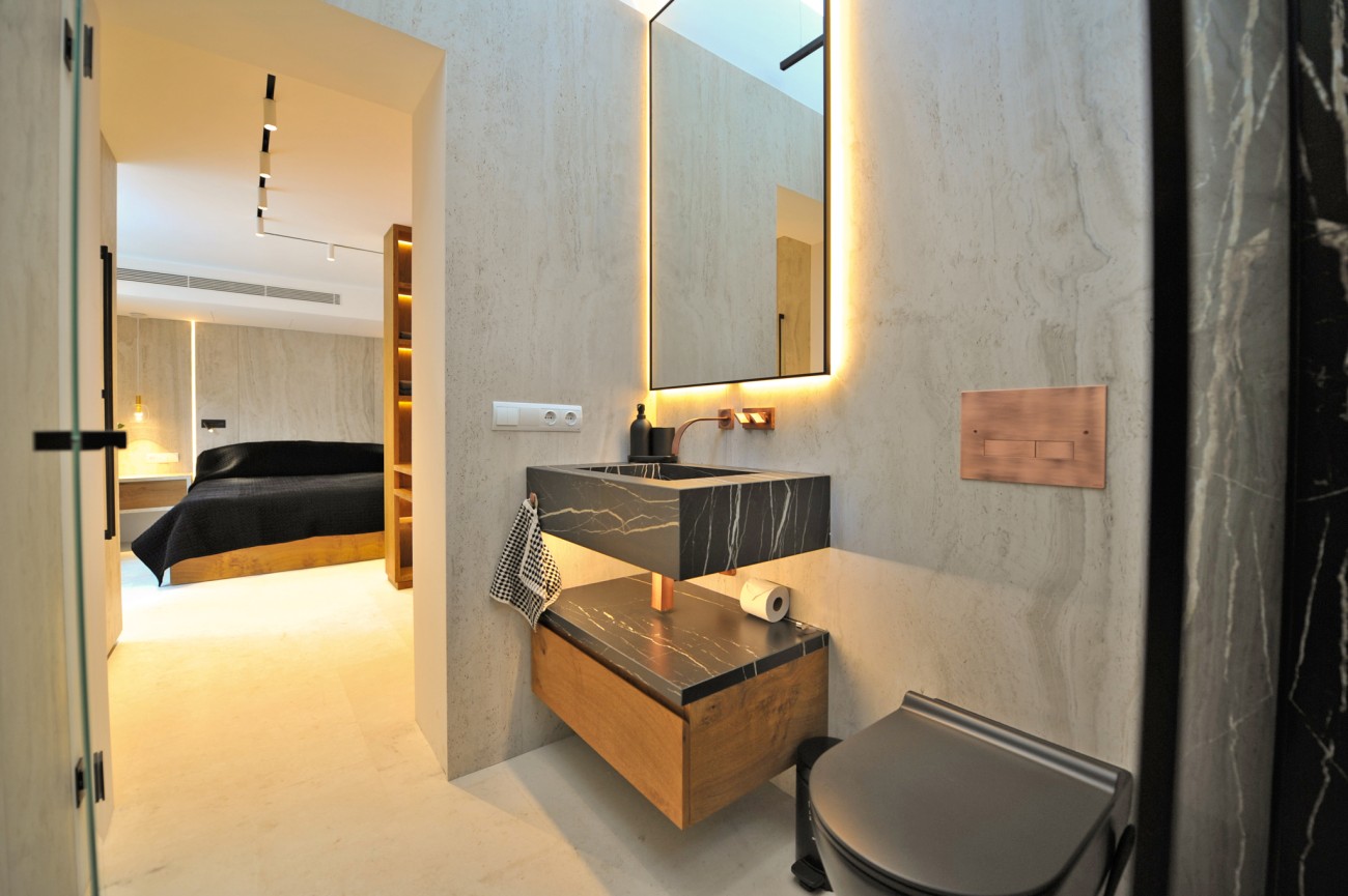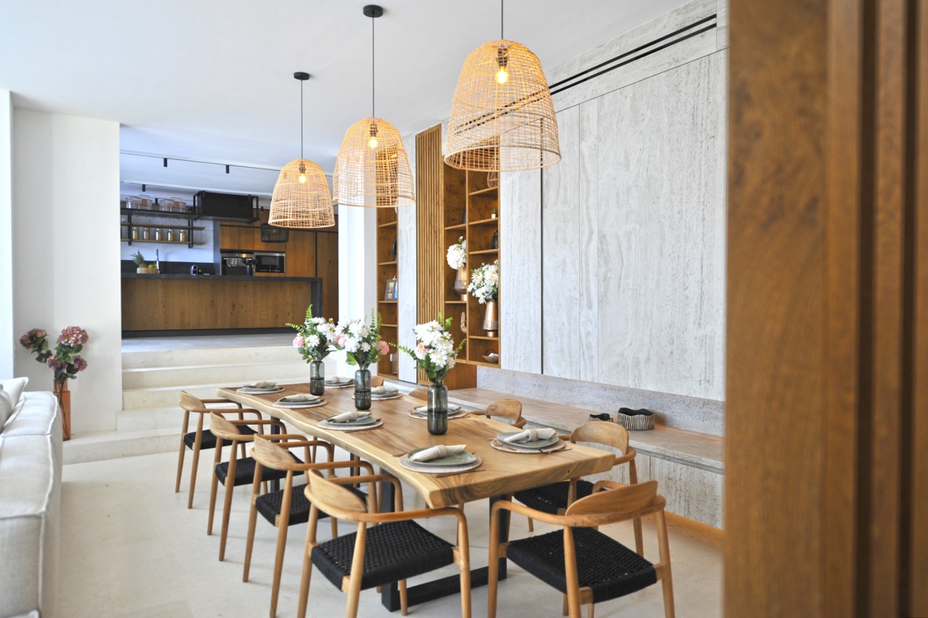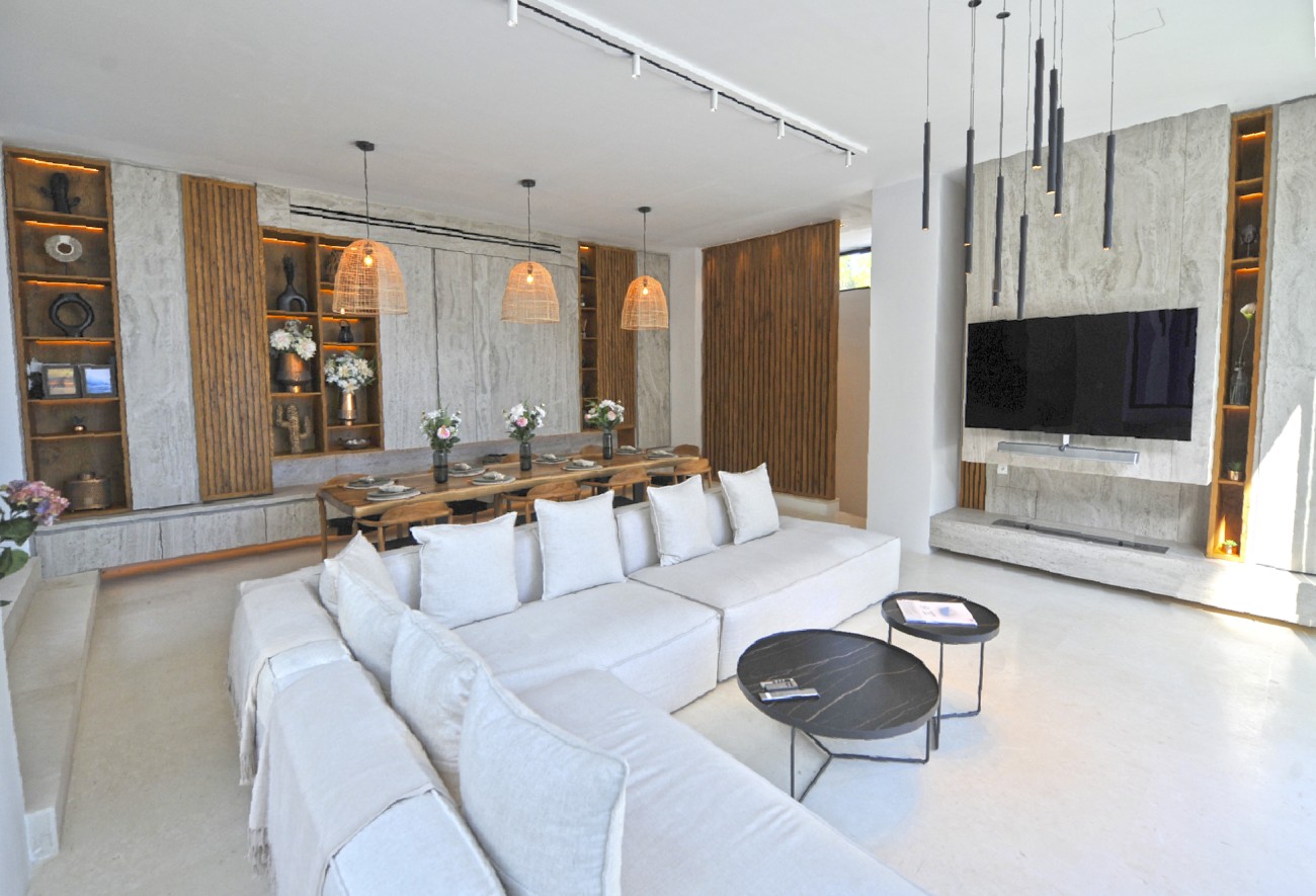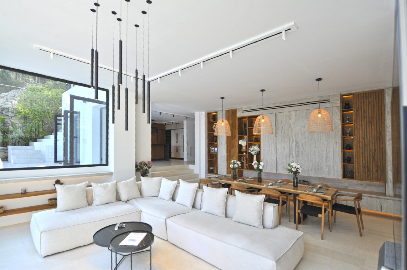 Het hoofdgebouw heeft een ruime open woon-eetkamer met ramen van vloer tot plafond, waardoor de ruimte overstroomt met natuurlijk licht en uitzicht op het zwembad en de zee. Er is een moderne keuken met kookeiland, een bijkeuken en een gastentoilet. Drie tweepersoonsslaapkamers met eigen badkamer, waarvan een met uitzicht op het zwembad, maken dit niveau compleet. Boven komen nog twee slaapkamers met eigen badkamer uit op een terras met prachtig uitzicht op de kust, dat leidt naar een chill-outruimte met een Balinees bed. Een fitnessruimte, bereikbaar via een stenen trap, ligt midden in de natuur.