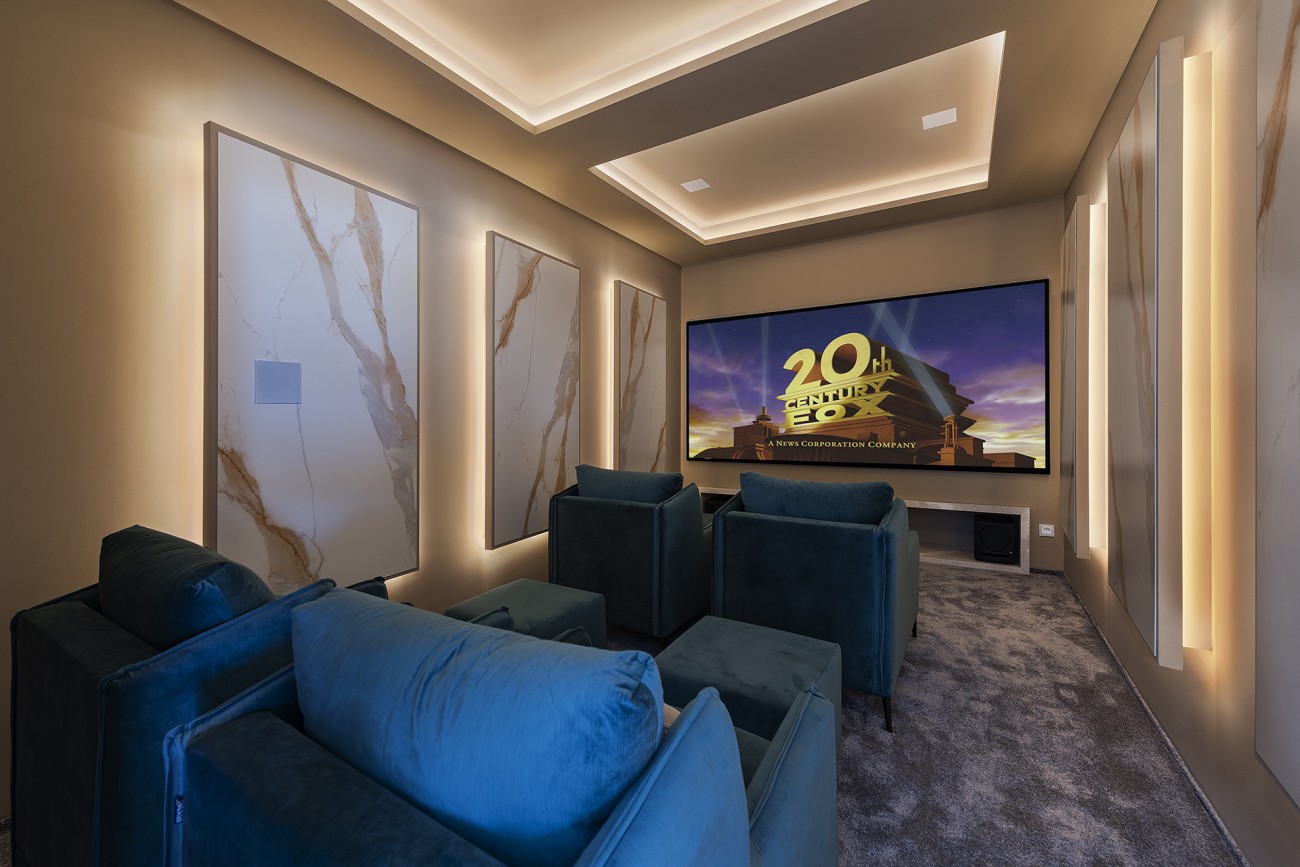 De benedenverdieping is zeer ruim en bevat een fitnessruimte, sauna en zelfs een thuisbioscoop.