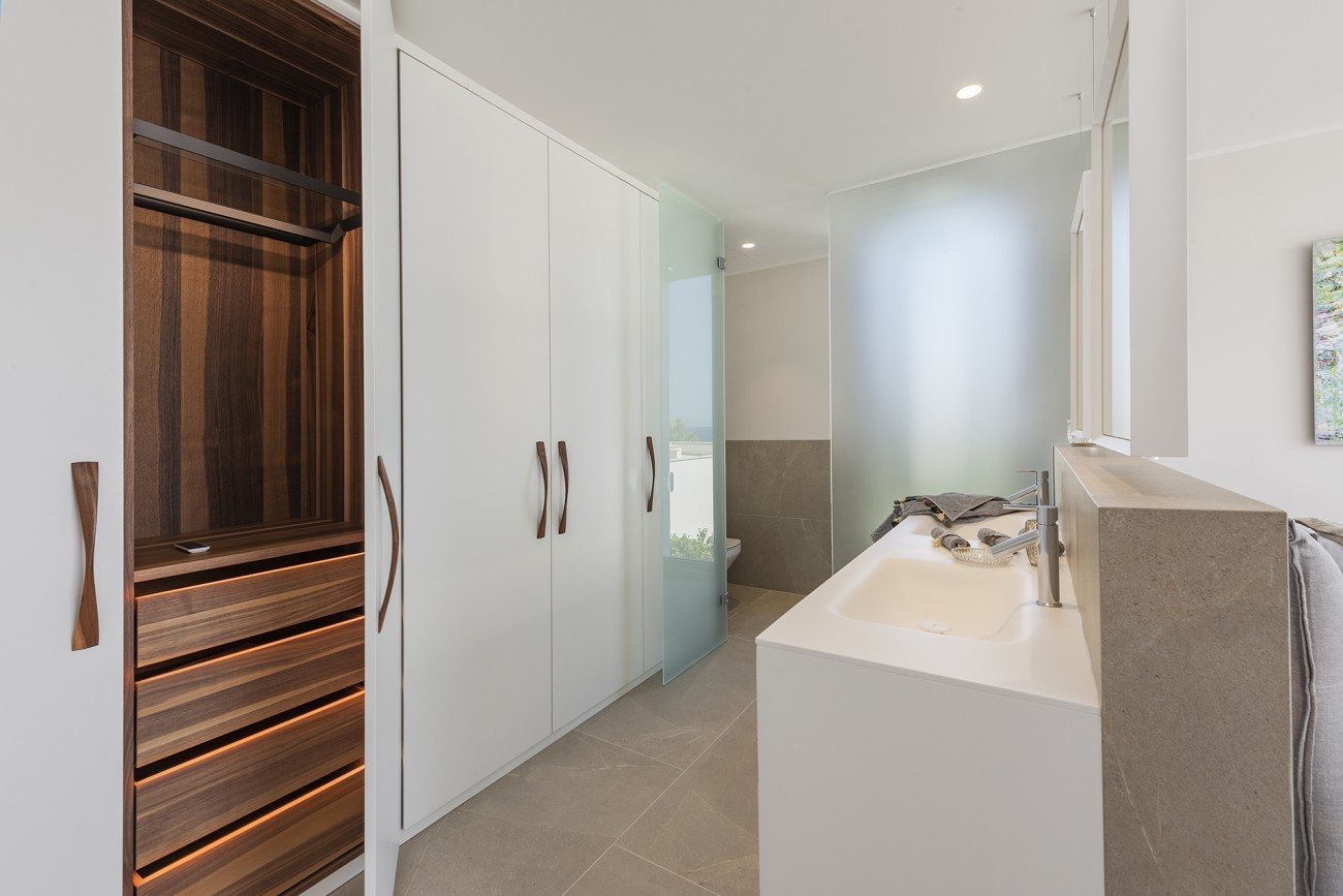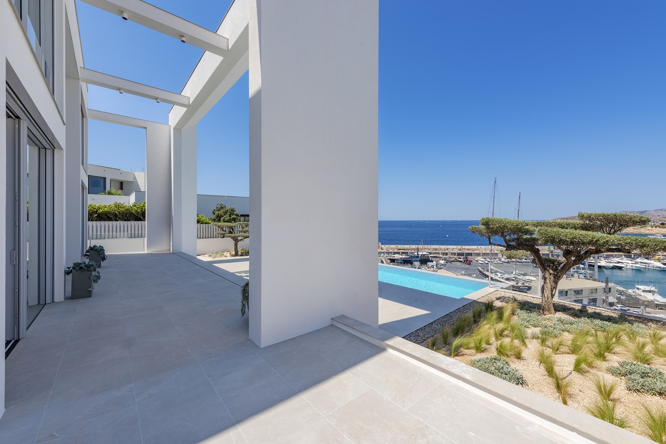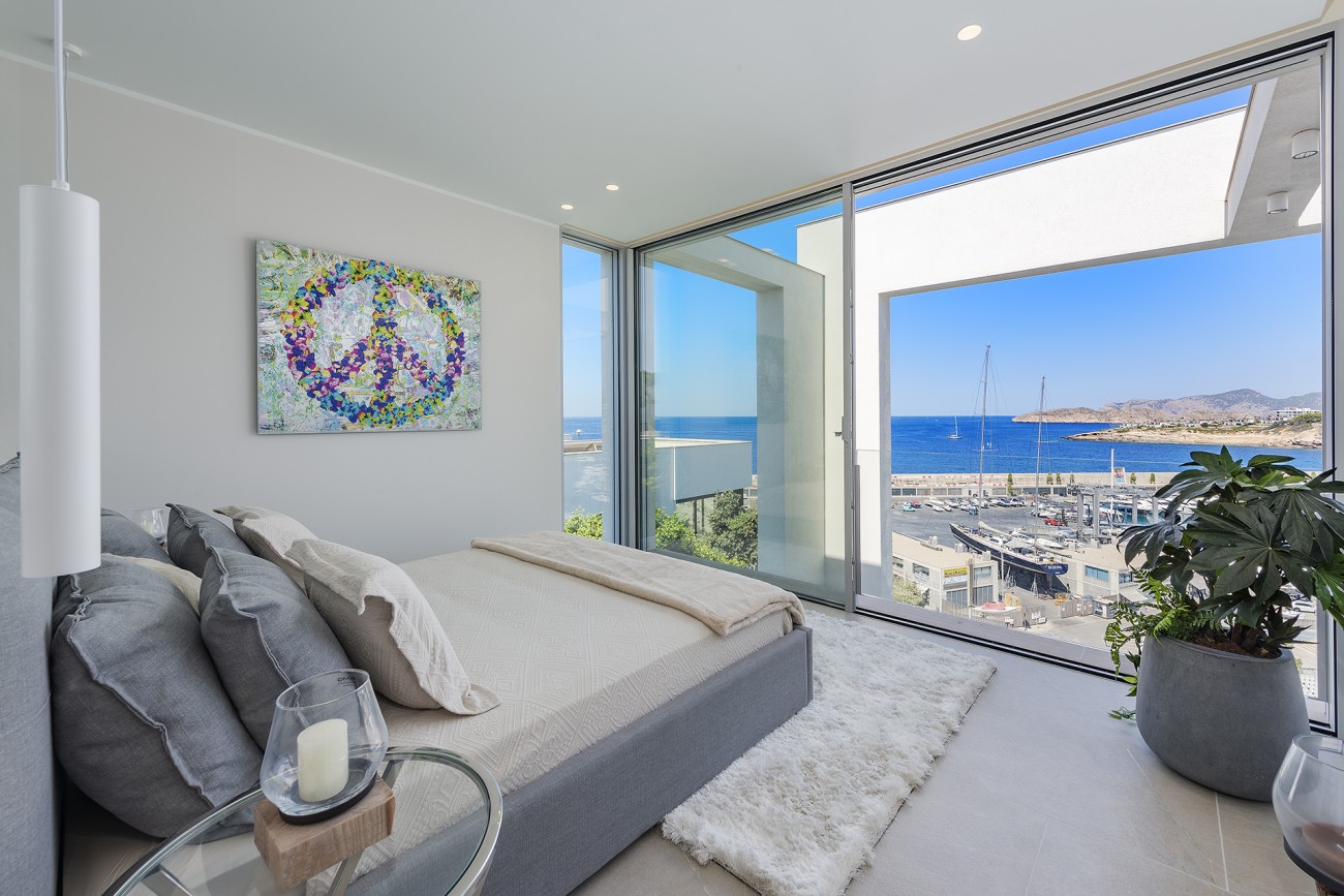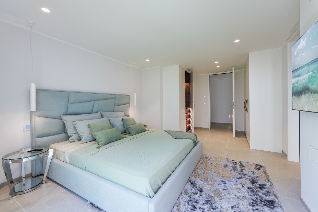 Verdeeld over drie verdiepingen heeft de villa in totaal vier tweepersoonsslaapkamers, vier eigen badkamers, een kleedkamer en enorme ramen en deuren die de kamers overspoelen met natuurlijk licht en directe toegang bieden tot de terrassen.