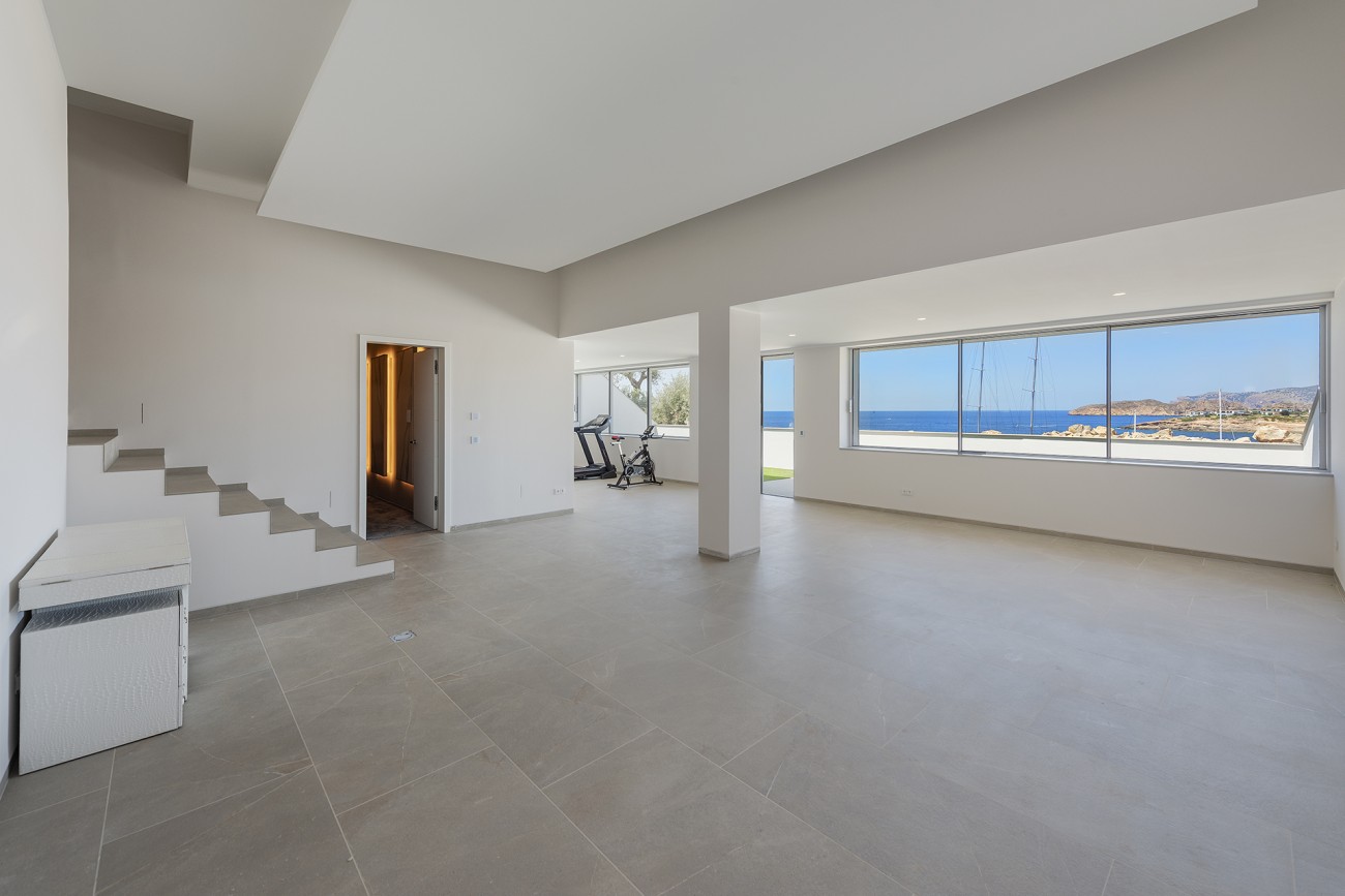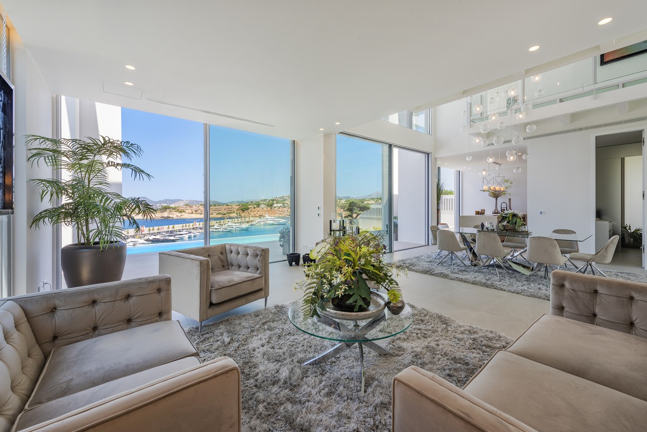 Op de begane grond vind je een open indeling met de belangrijkste woongedeeltes, waaronder een design inbouwkeuken met geïntegreerde apparatuur, een eethoek en een lounge, die allemaal uitkomen op het overloopzwembad en het terras waar je kunt genieten van het uitzicht op de jachthaven en de baai.