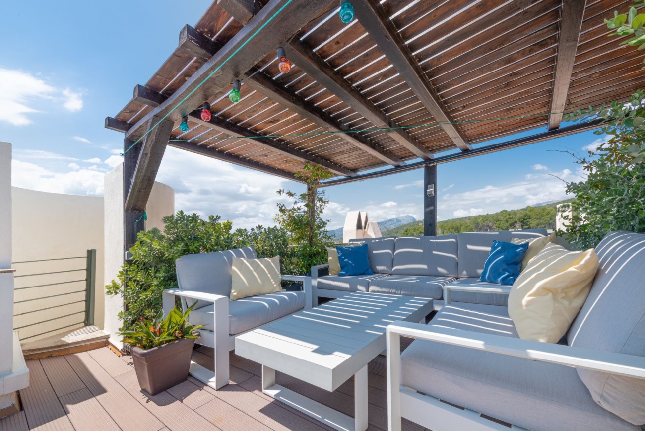 Een van de hoogtepunten van deze woning is het privédakterras, waar je heerlijk kunt chillen met adembenemend uitzicht op de bergen, perfect om te ontspannen of gasten te ontvangen.