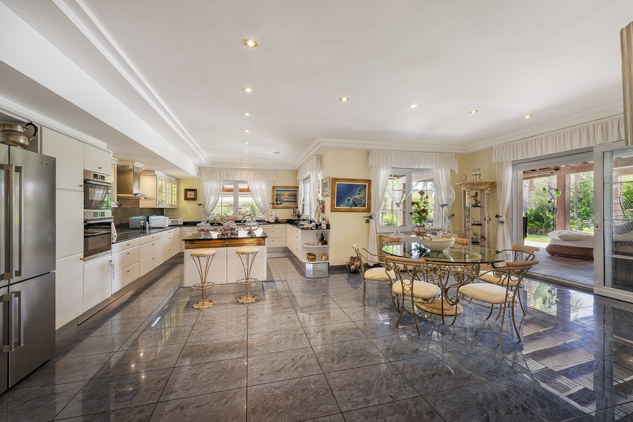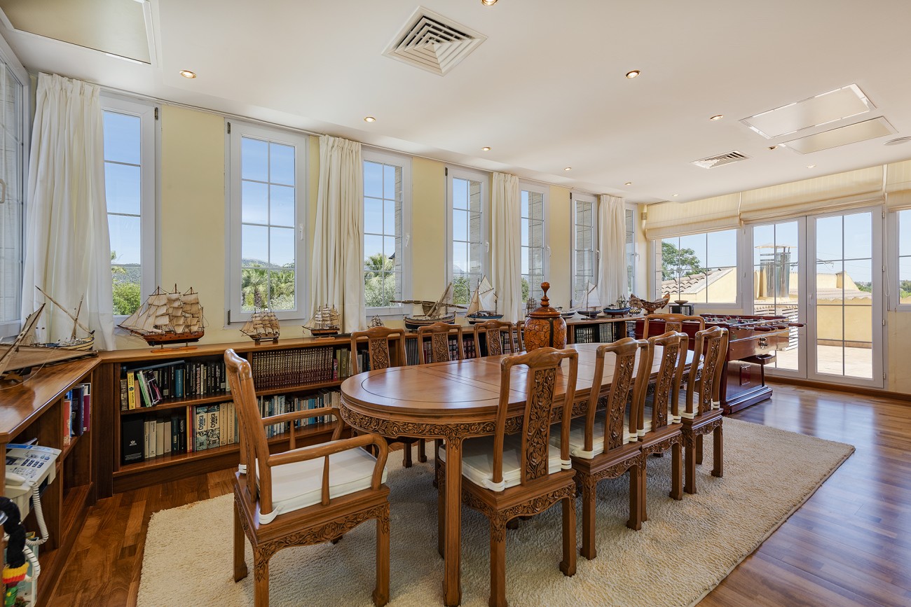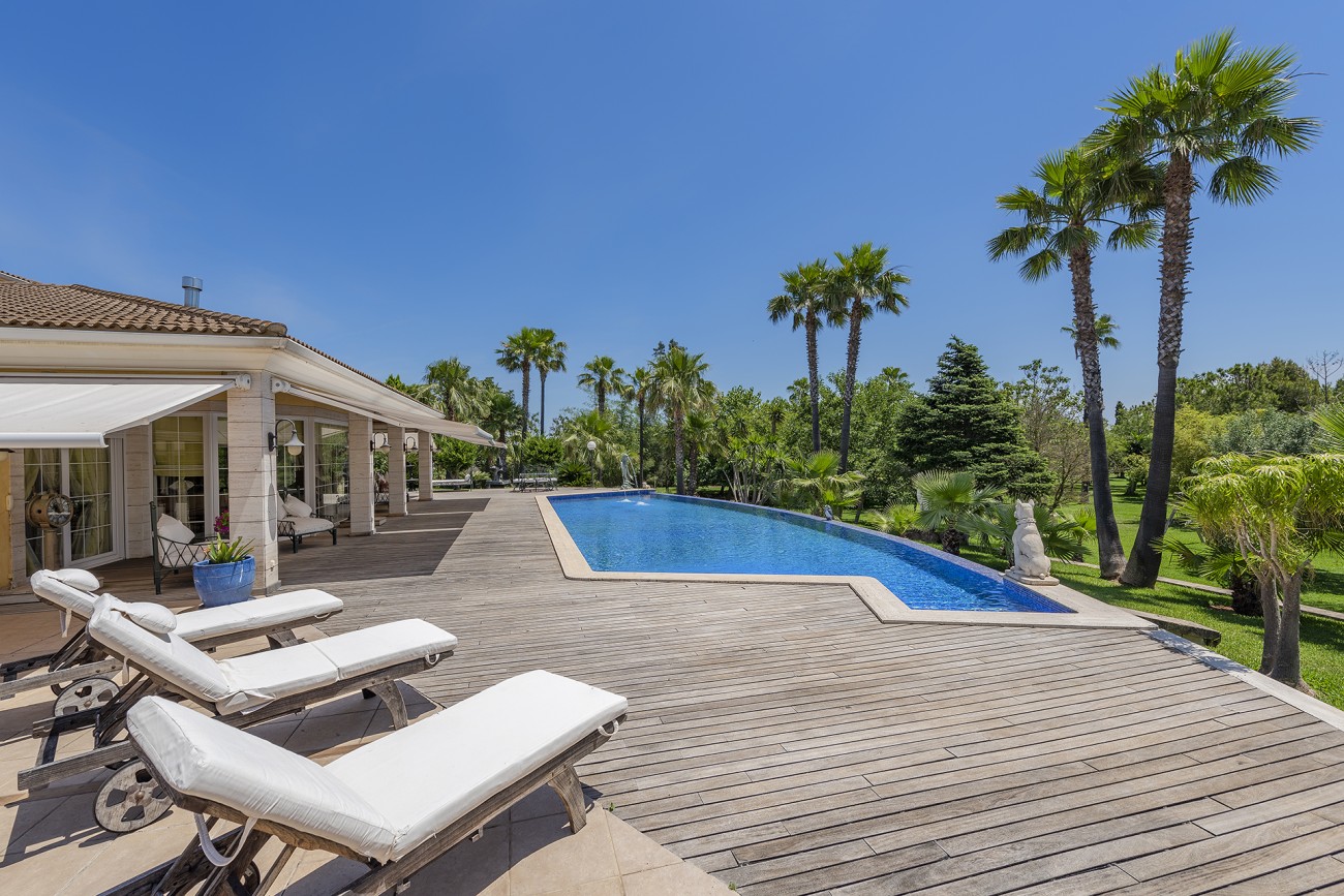 De hoofdingang leidt naar de indrukwekkende entreehal van dubbele hoogte. Op deze verdieping vind je vier grote slaapkamers met aangrenzende badkamers en kleedkamers, een ruime woon/eetkamer met open haard en een keuken/eetkamer met eiland. Er is ook een tweede woonkamer met industriële keuken, barbecue en eethoek, een gastentoilet en een wasruimte. Alle kamers hebben toegang tot het terras en het zwembad.