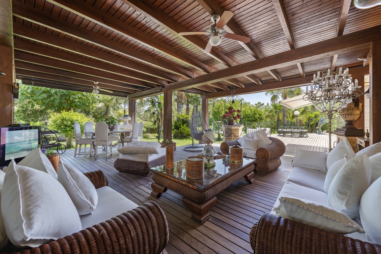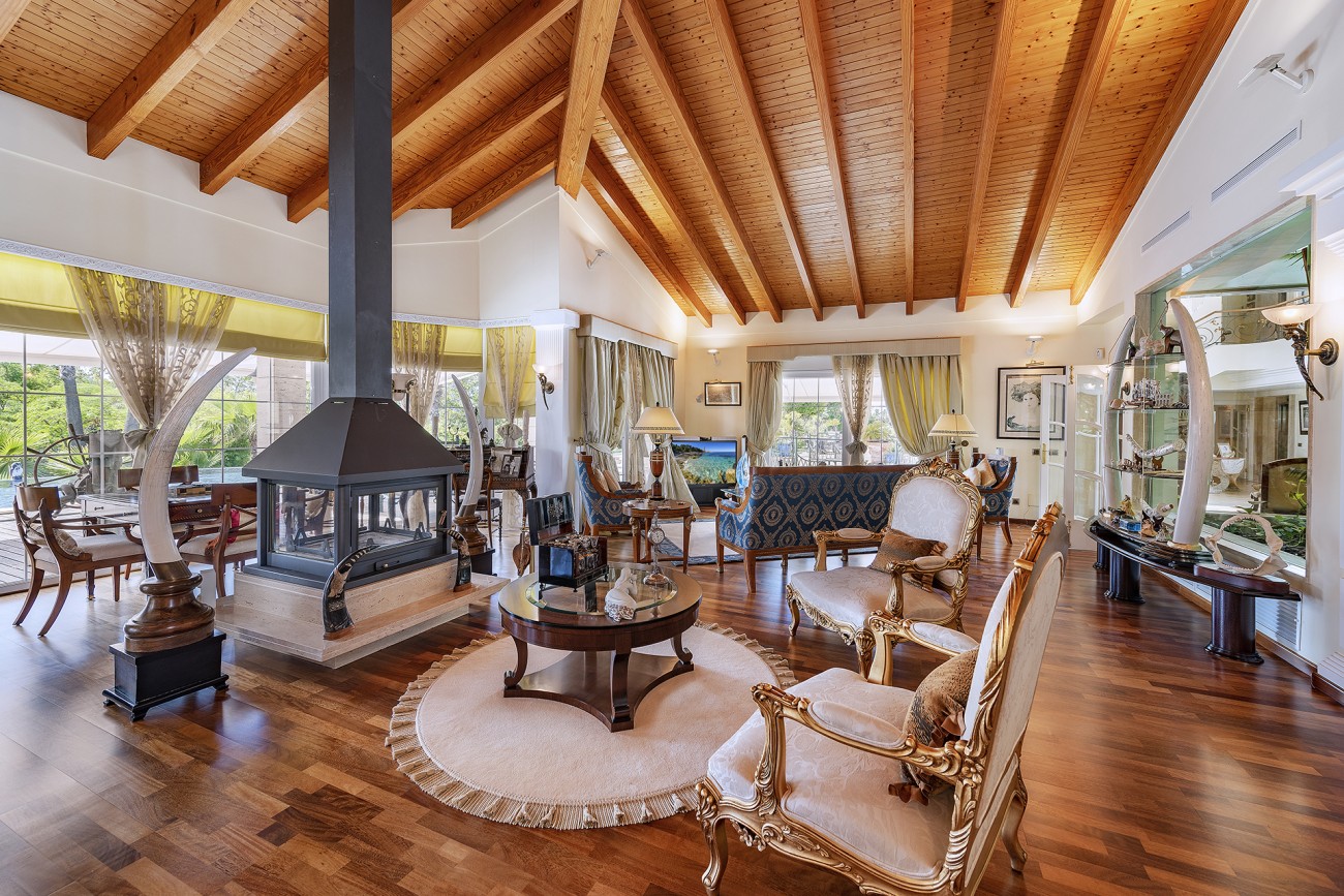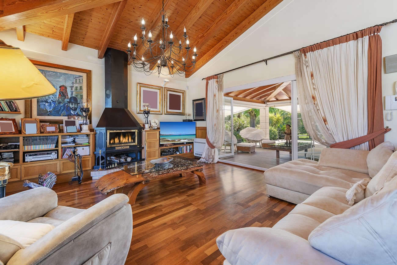 De hoofdingang leidt naar de indrukwekkende entreehal van dubbele hoogte. Op deze verdieping vind je vier grote slaapkamers met aangrenzende badkamers en kleedkamers, een ruime woon/eetkamer met open haard en een keuken/eetkamer met eiland. Er is ook een tweede woonkamer met industriële keuken, barbecue en eethoek, een gastentoilet en een wasruimte. Alle kamers hebben toegang tot het terras en het zwembad.