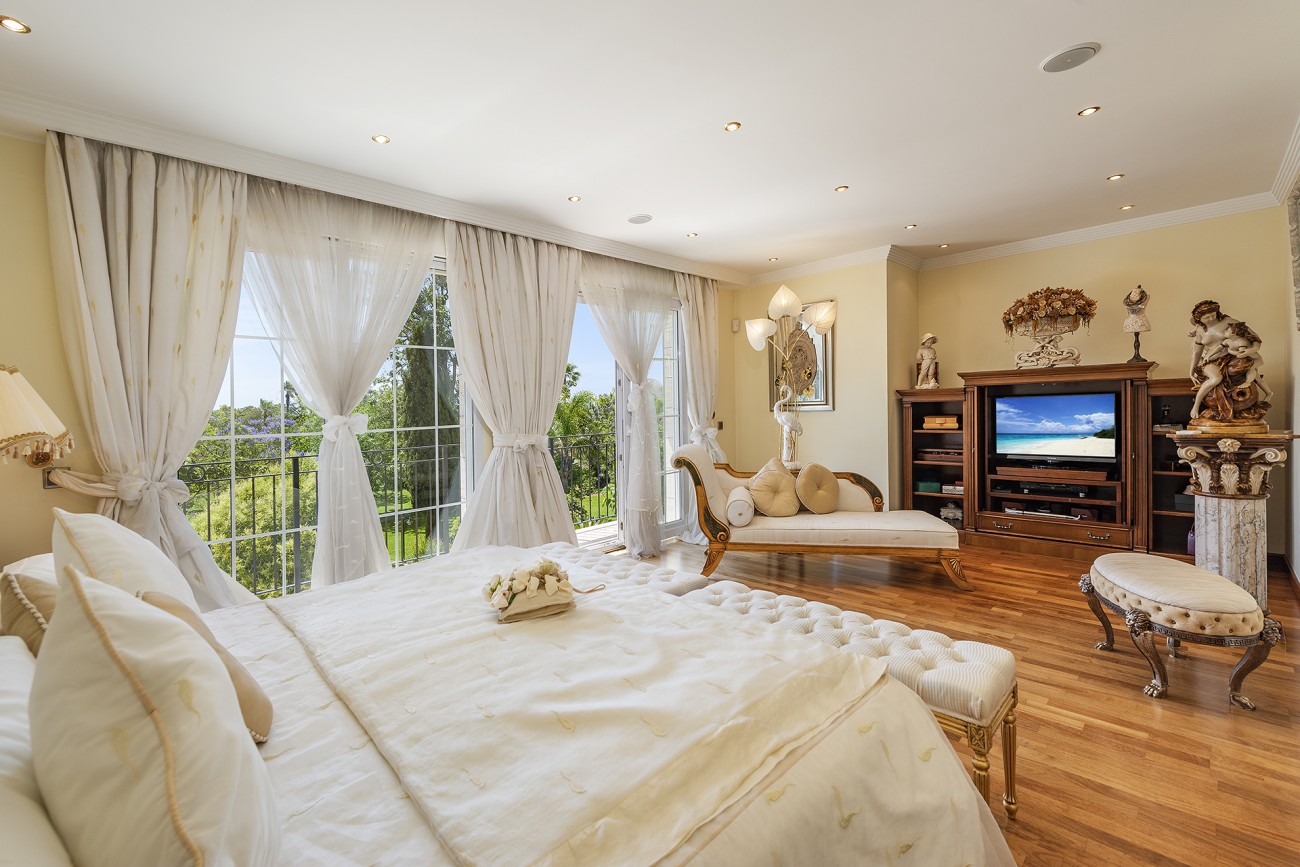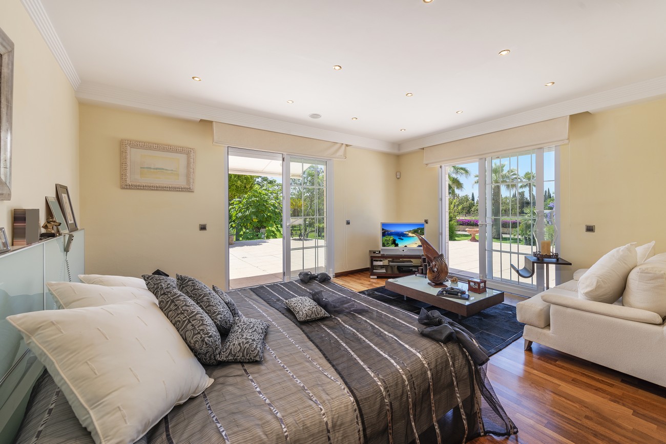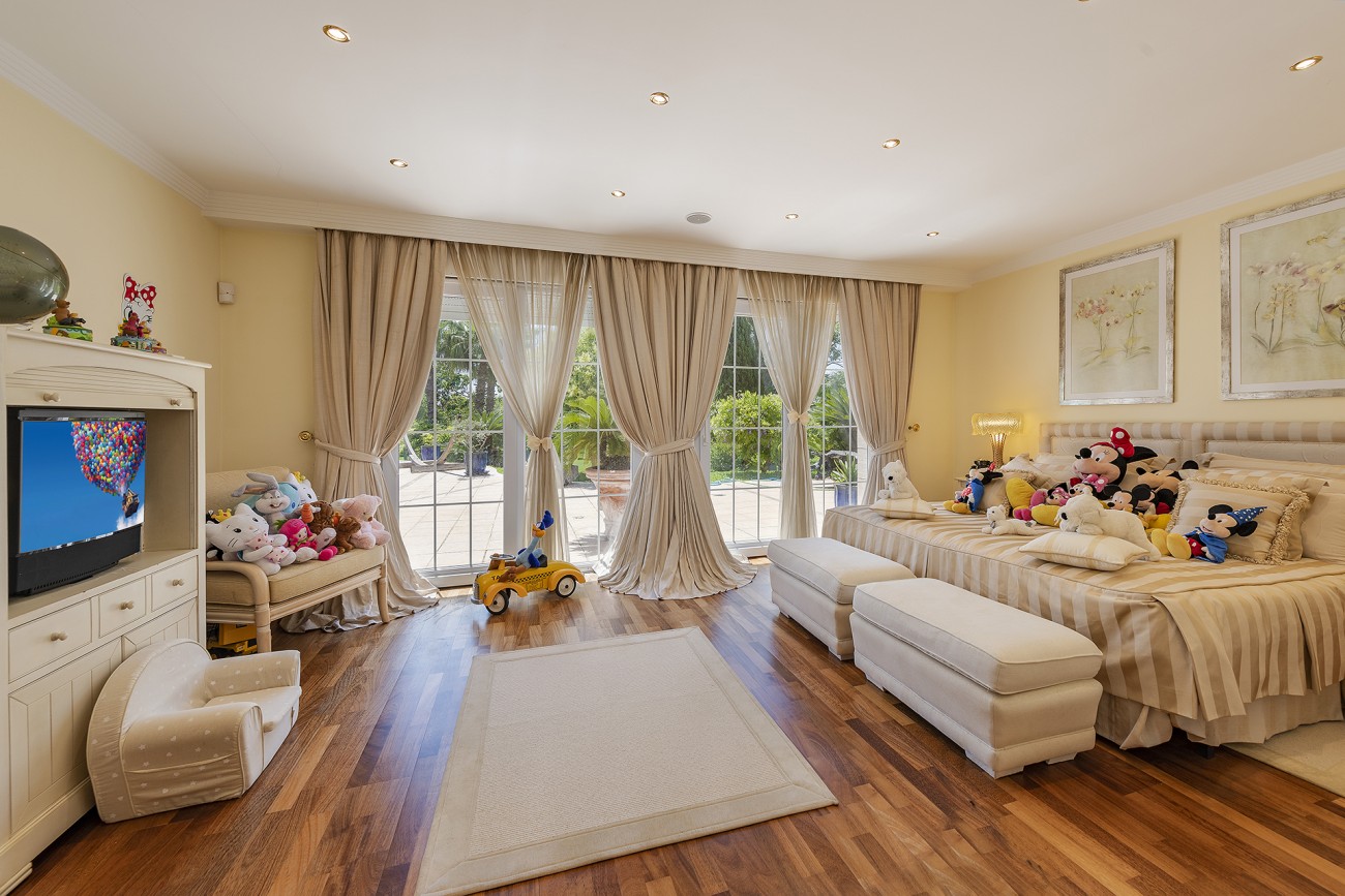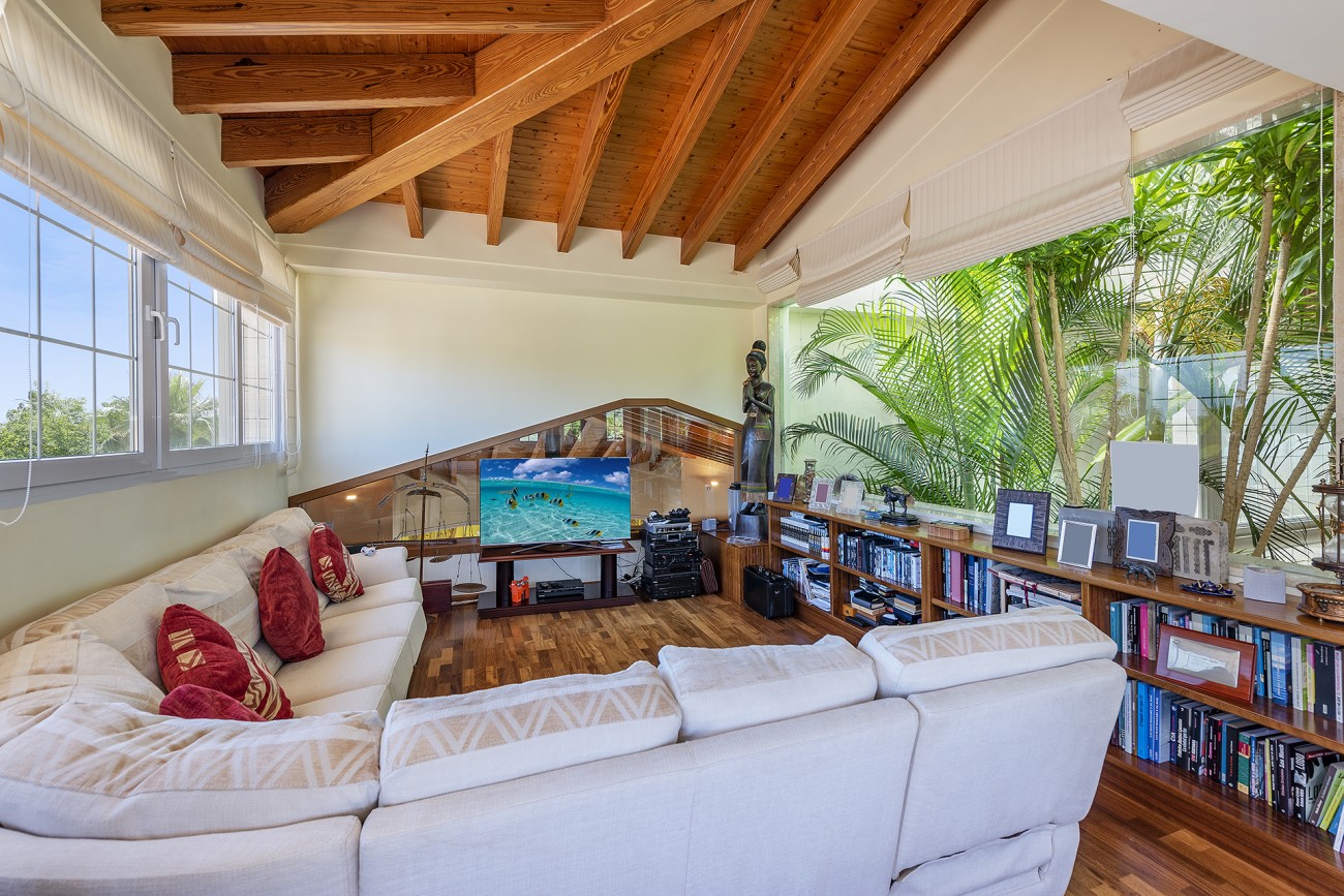 Op de bovenverdieping is de master suite met een grote slaapkamer, kleedkamer, eigen badkamer, een lounge/bibliotheek en toegang tot terrassen met spectaculair uitzicht op de bergen.