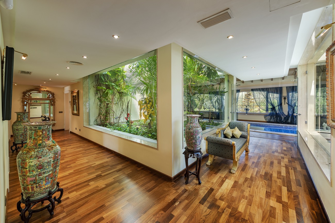 De kelder herbergt een wijnkelder met temperatuurregeling, machinekamers en een garage voor maximaal 10 voertuigen. Een lift geeft toegang tot de twee bovenste verdiepingen. Omkeerbare airconditioning en vloerverwarming garanderen comfort in het hele pand.