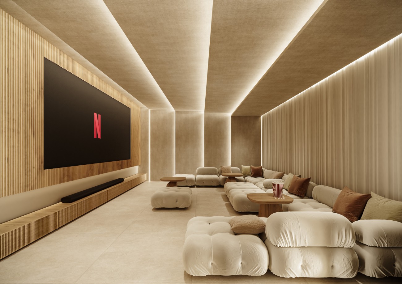 Bewoners kunnen genieten van een ultramoderne bioscoop met een HD-projector, een hoogwaardig surround sound-systeem, een enorm scherm en comfortabele lounge stoelen voor een unieke ervaring.