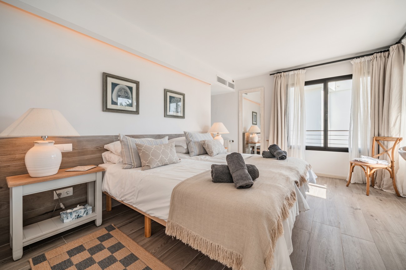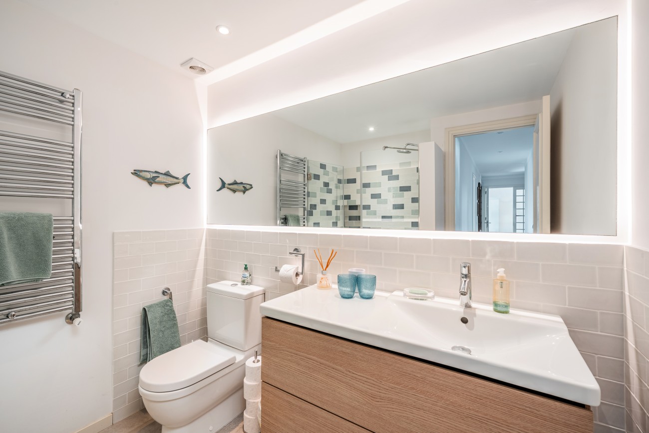 Upstairs, you will find two further bedrooms, each with its own en-suite bathroom. Both rooms open onto a shared private balcony, where you can enjoy pleasant views across the Bay of Pollensa. While the sea views are exclusively from the first-floor balcony, the true highlight of this villa is its unbeatable location, just a few steps from the shoreline.