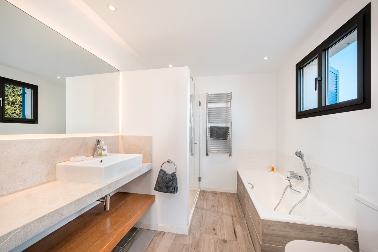 The fully refurbished villa features 4 bedrooms and 4 bathrooms arranged over two spacious levels, making it an ideal family home or the perfect holiday retreat close to the beach.