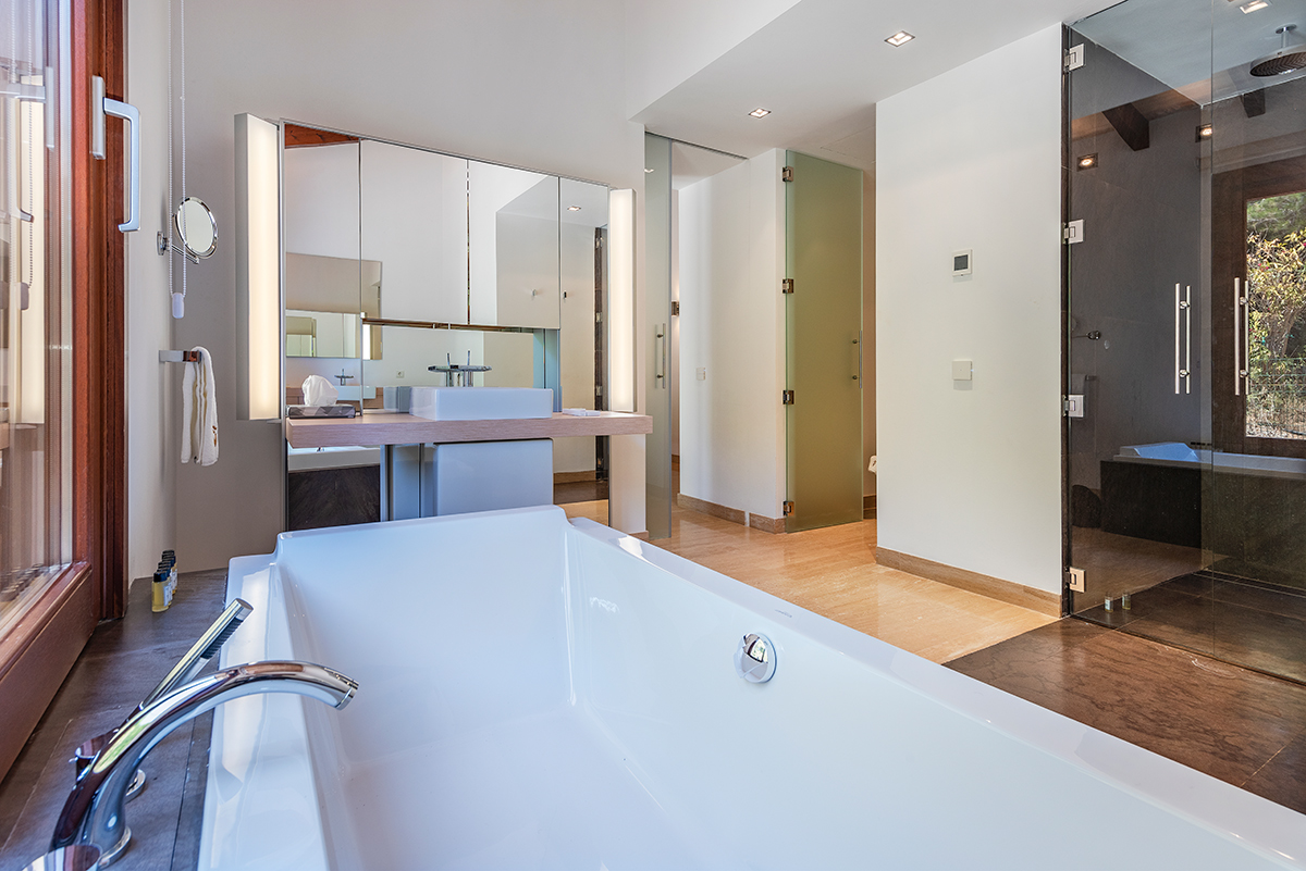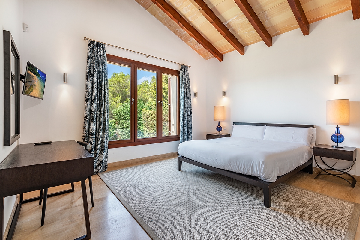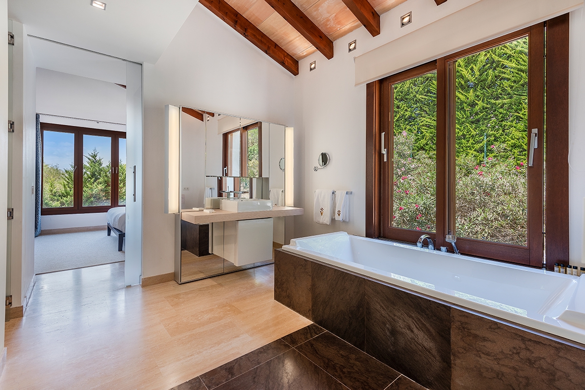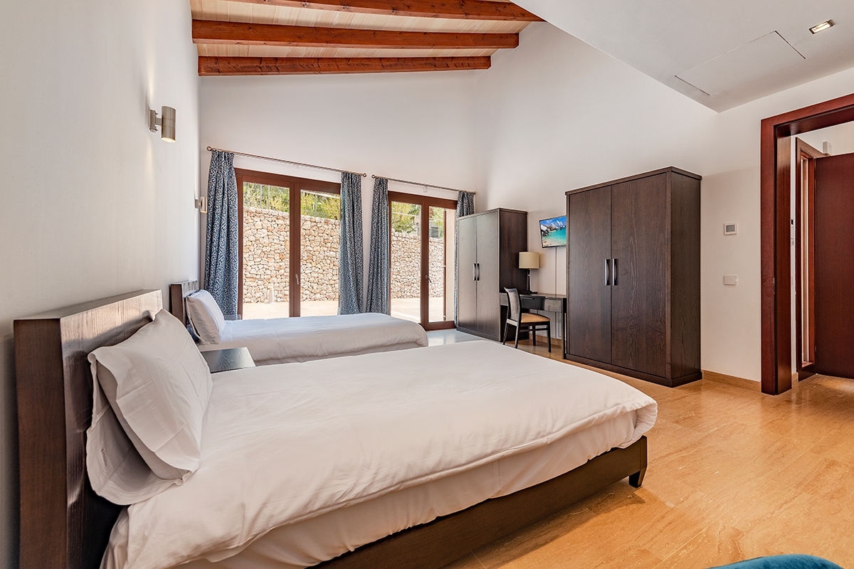 De villa bestaat uit drie lichte tweepersoonsslaapkamers, elk met eigen badkamer, een eenpersoonsslaapkamer met eigen badkamer voor personeel of kinderen, een kleedkamer, een volledig ingerichte moderne keuken met geïntegreerde apparatuur, inclusief wijnkoeler en een ruime open woon-/eetkamer, met prachtig ononderbroken uitzicht op het platteland en met directe toegang tot het terras met uitzicht op het zwembad.