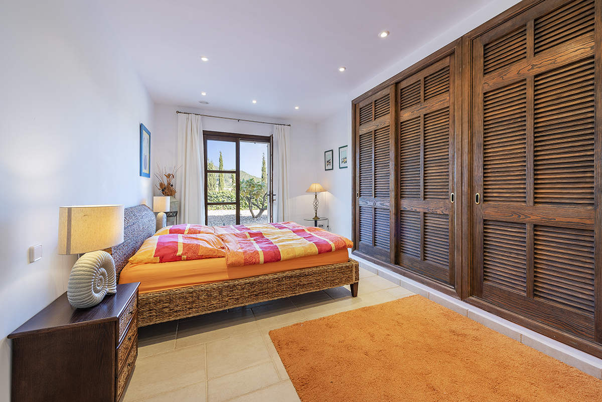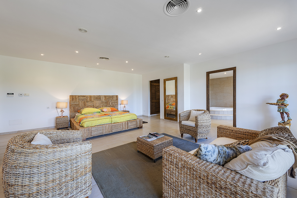 Op de begane grond van de villa vind je een dubbelhoge entreehal die leidt naar een open woonruimte met een modern ingerichte keuken, eethoek en lichte woonkamer met directe toegang tot het terras en het zwembad. Deze verdieping heeft ook drie tweepersoonsslaapkamers, twee badkamers (waarvan een en suite) en een spagedeelte met jacuzzi en sauna dat uitkijkt op het zwembad.