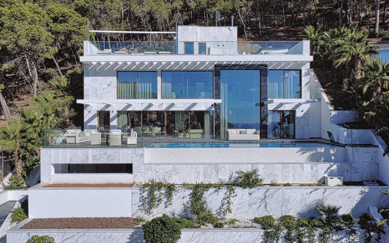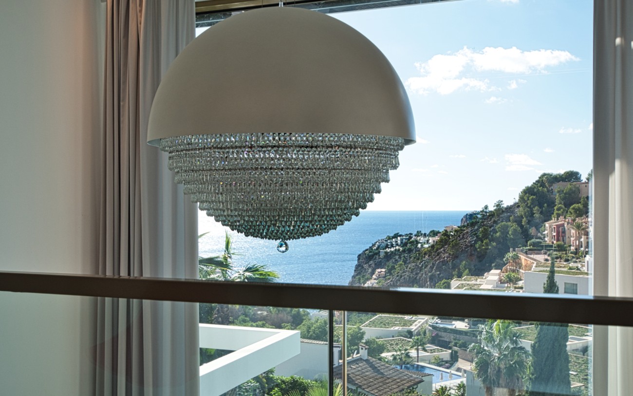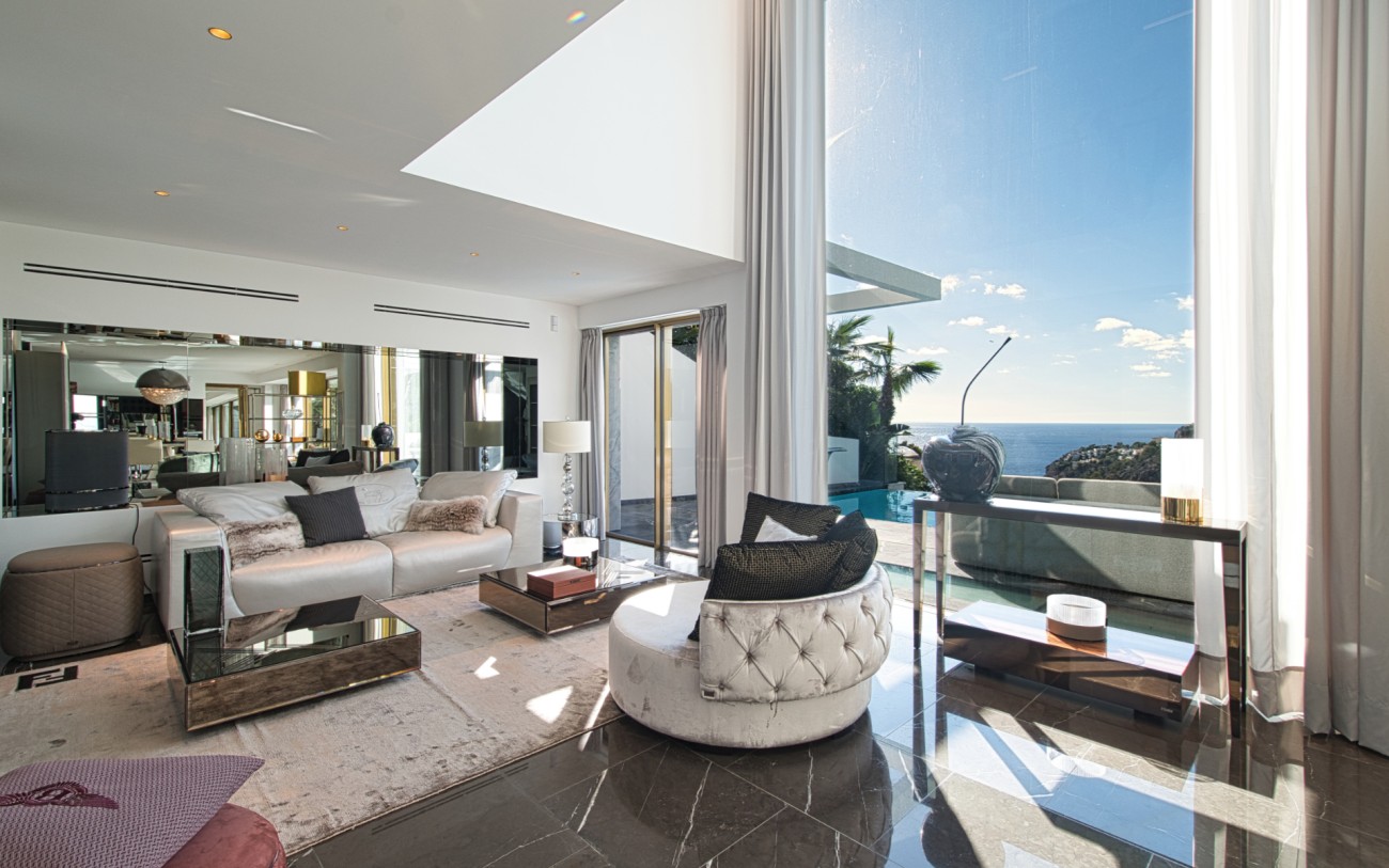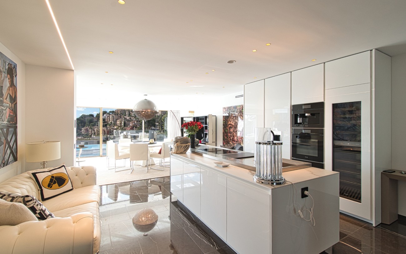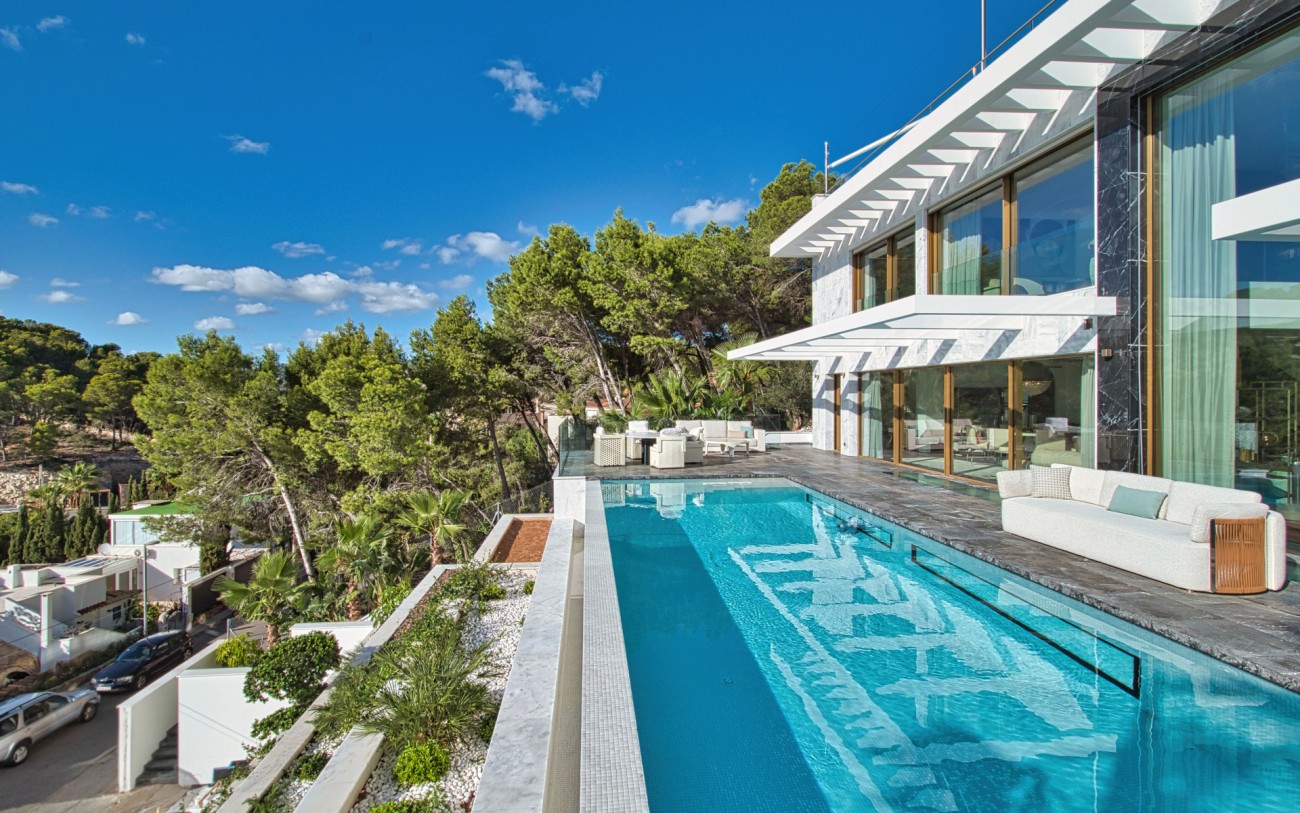 Met een oppervlakte van 532 m² en drie verdiepingen combineert deze woning eigentijds design met tijdloze elegantie. De belangrijkste woonverdieping baadt in natuurlijk licht en beschikt over een verfijnde Poliform designkeuken, een open woonkamer en directe toegang tot een terras met een overloopzwembad dat uitkijkt over de glinsterende Middellandse Zee.
