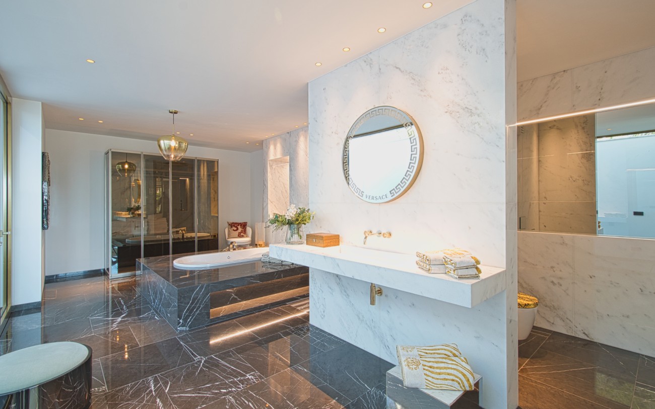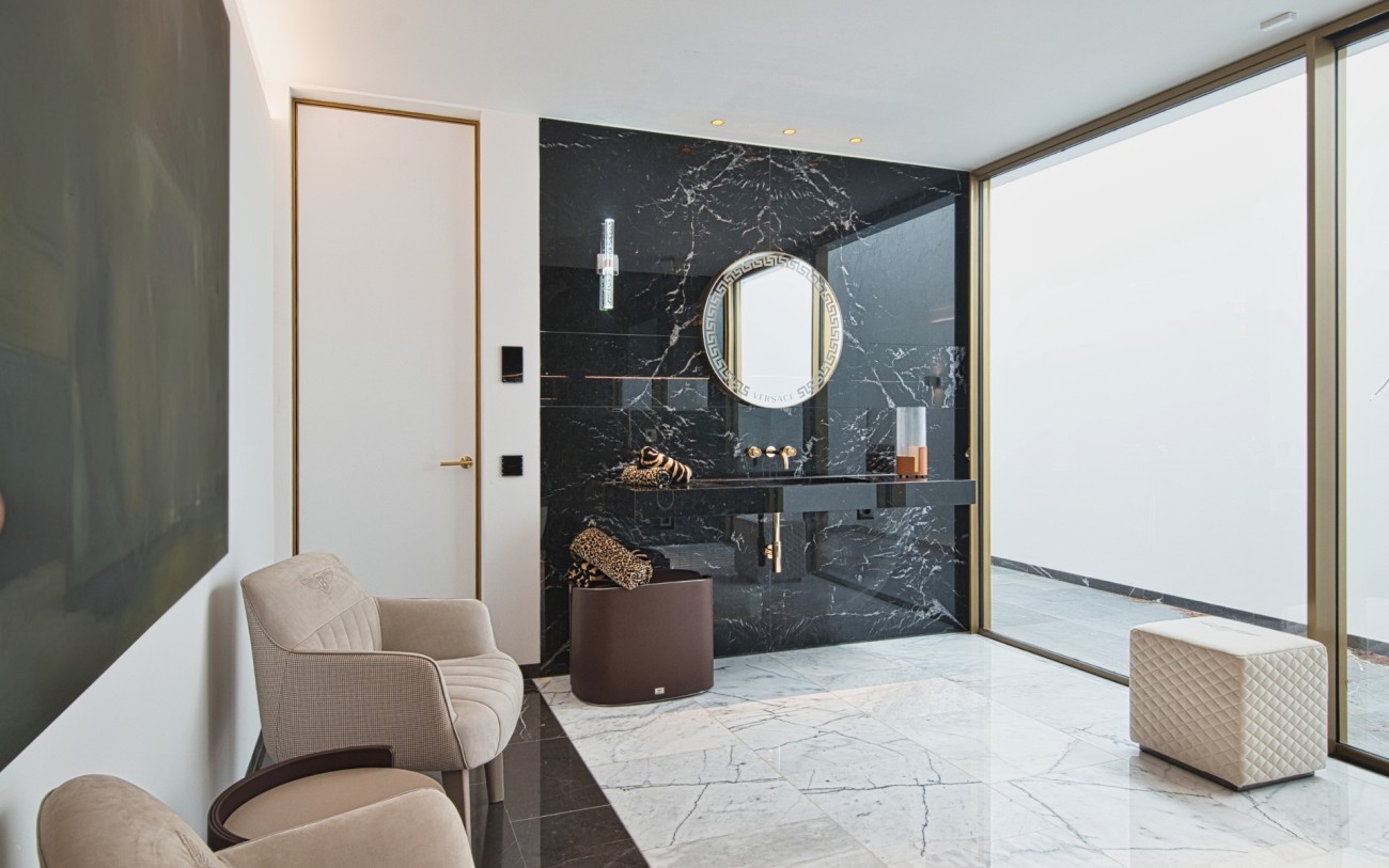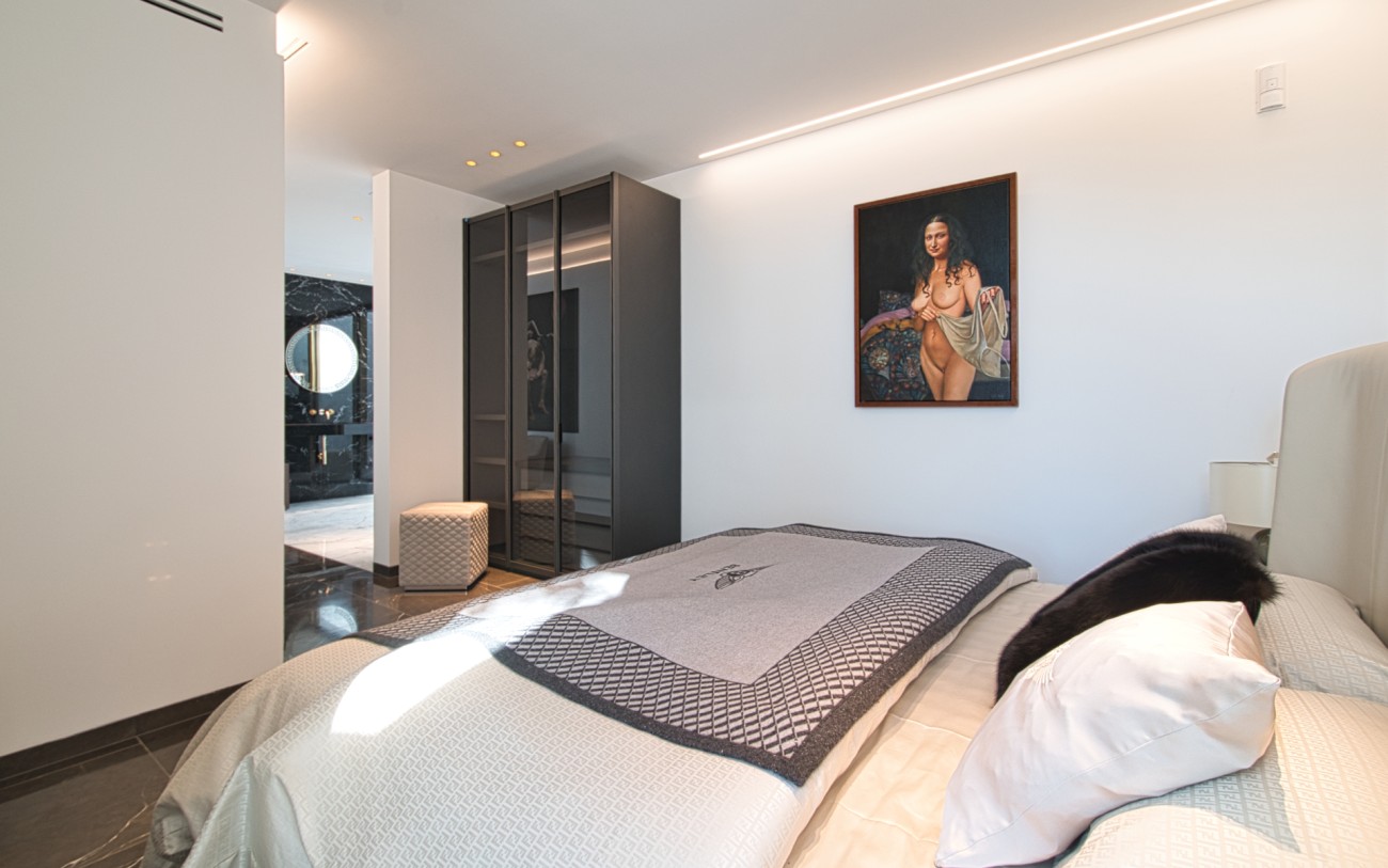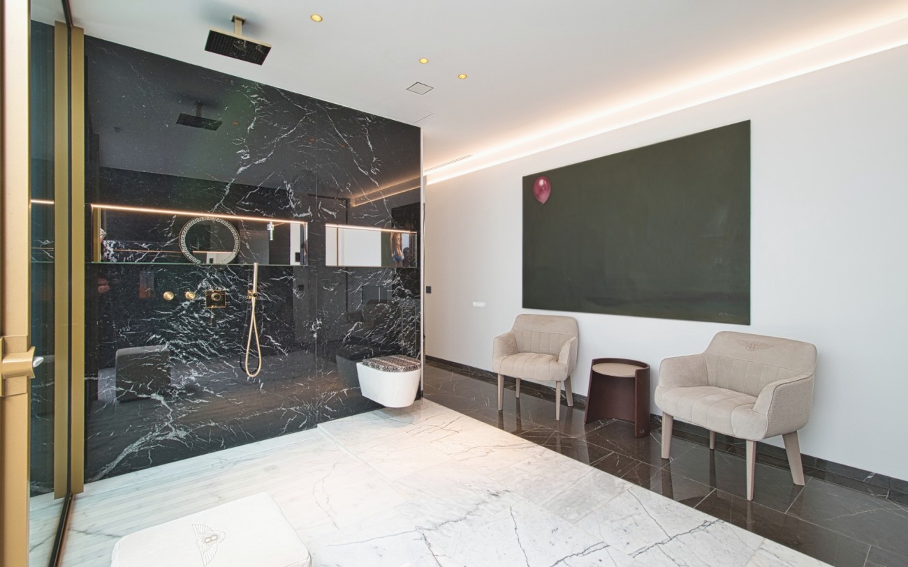 Boven wachten drie royale slaapkamersuites, elk met eigen badkamer, op maat gemaakte kasten en privéterrassen, een intieme uitdrukking van comfort en stijl. Het dakterras van 151 m², bereikbaar met de lift, biedt de ultieme retraite met een jacuzzi, buitenkeuken, chill-out lounge en een panoramisch uitzicht op zee dat zich eindeloos uitstrekt tot aan de horizon.