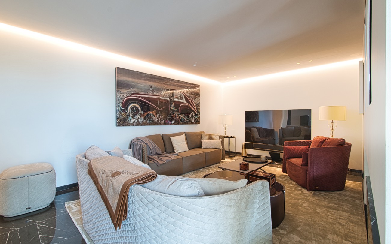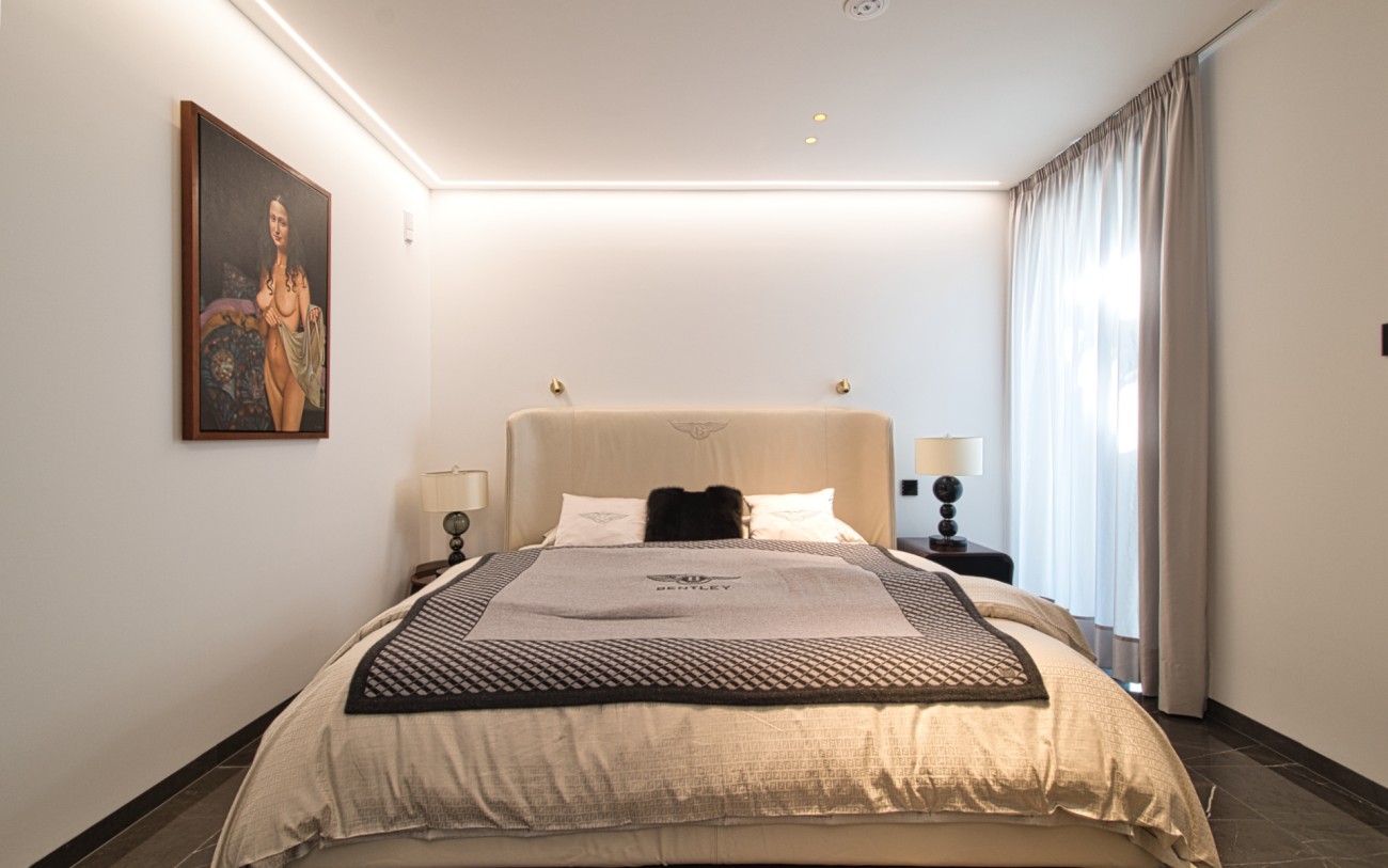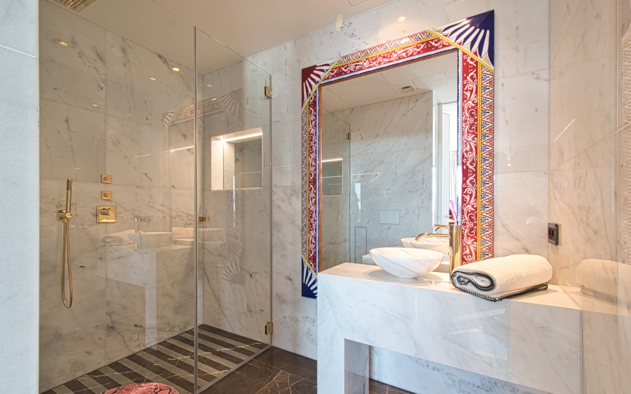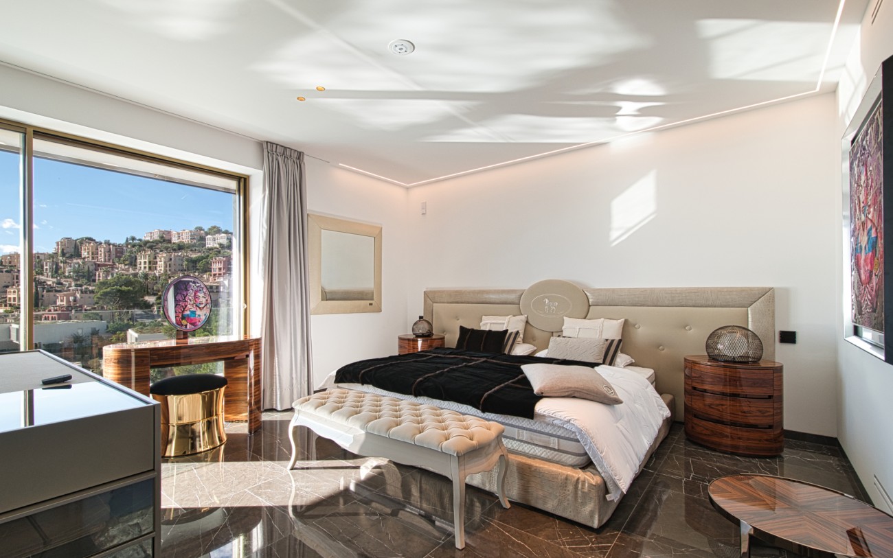 Boven wachten drie royale slaapkamersuites, elk met eigen badkamer, op maat gemaakte kasten en privéterrassen, een intieme uitdrukking van comfort en stijl. Het dakterras van 151 m², bereikbaar met de lift, biedt de ultieme retraite met een jacuzzi, buitenkeuken, chill-out lounge en een panoramisch uitzicht op zee dat zich eindeloos uitstrekt tot aan de horizon.