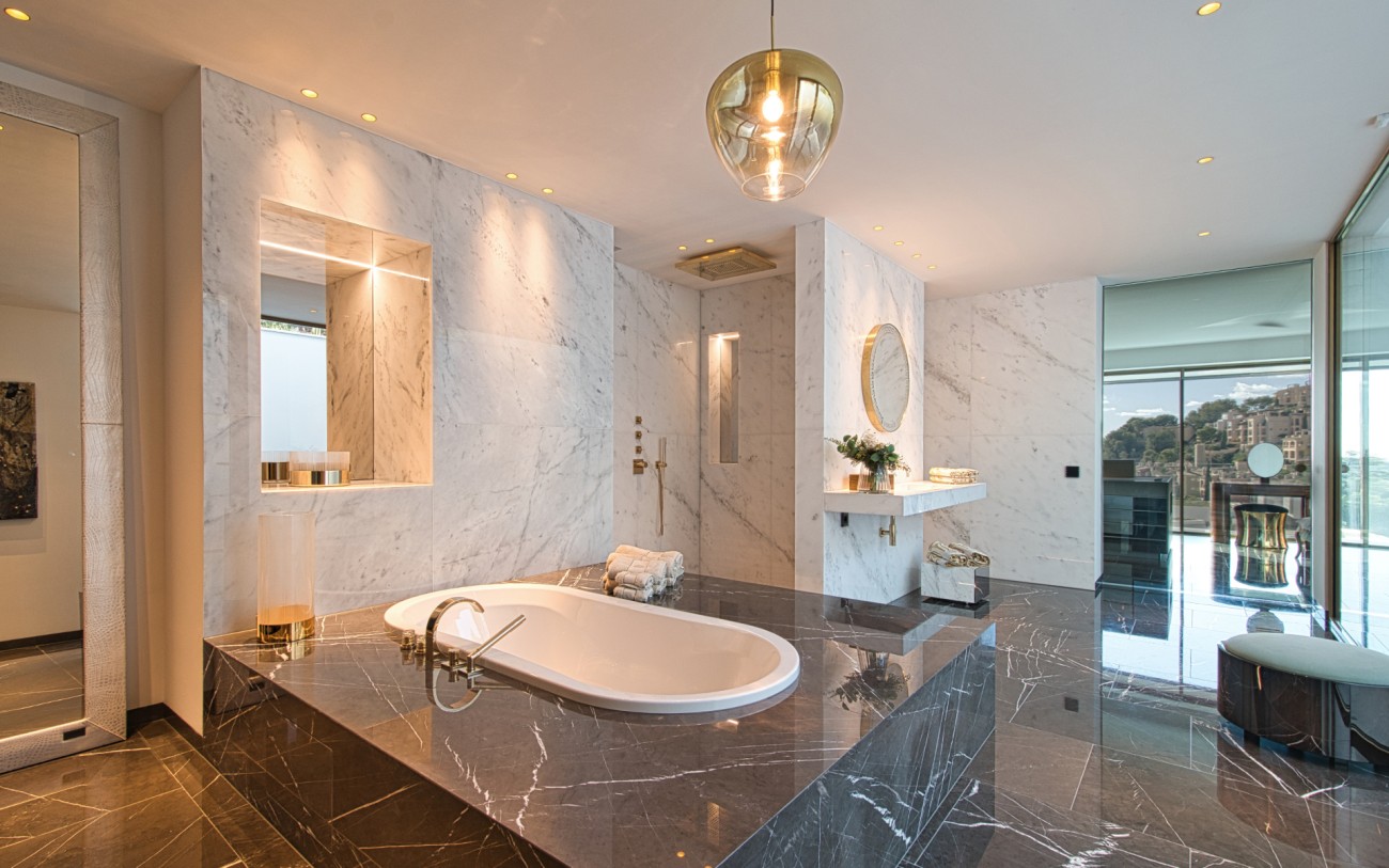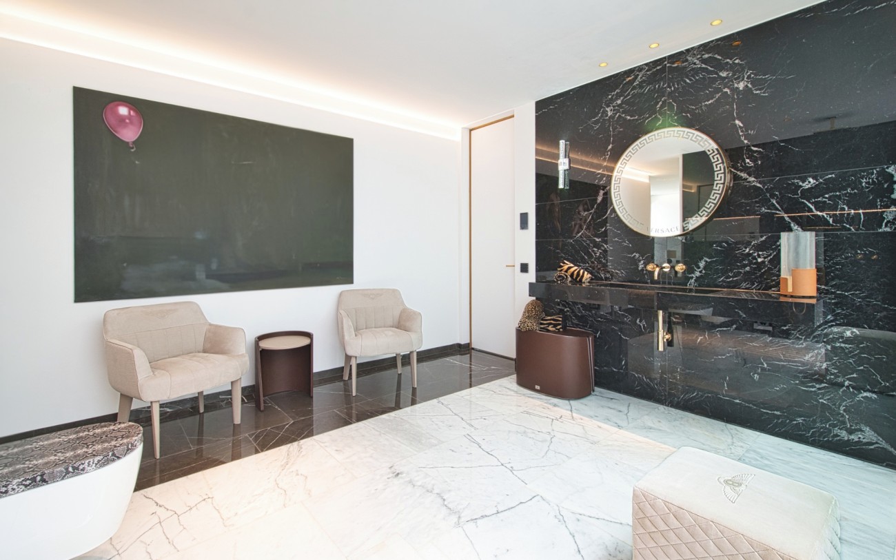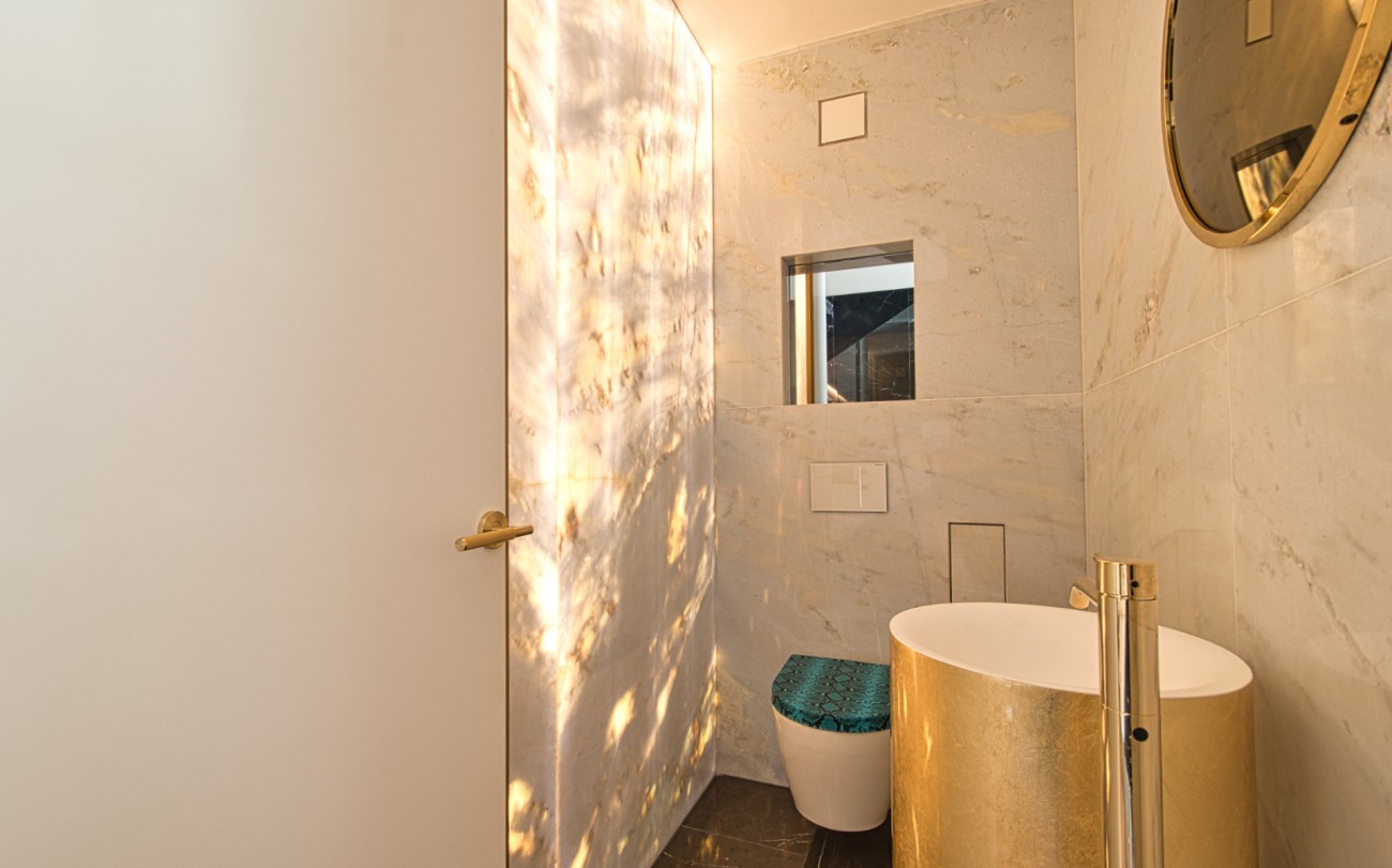 Vanaf de eerste blik is de opvallende aanwezigheid fascinerend. De gevel, vloeren en zelfs de trap zijn versierd met prachtig marmer en zetten een toon van verfijning en exclusiviteit die door het hele huis wordt voortgezet.