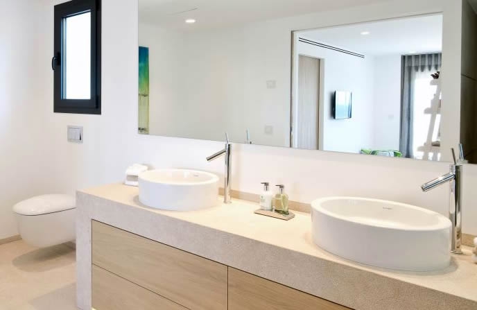 Deze Mallorcaanse villa moet inspireren en een “levend” voorbeeld zijn van hoe perfect gewone moderne huizen gebouwd kunnen worden met behulp van het passieve verwarmingsconcept. Onze moderne passieve villa bevat de antwoorden op de huidige energie- en milieuproblemen: – Het energieverbruik voor verwarming is bijna nul – De bijdrage aan de koolstofuitstoot is daarom zeer laag – Het wooncomfort, inclusief het binnenklimaat en het lage allergeengehalte, is hoog en zal daarom het potentieel hebben om het concept van toekomstige huizen die op Mallorca worden gebouwd vorm te geven, met de nadruk op meer comfort en ecologische duurzaamheid. Isolatie: Meer thermische isolatie — Passieve verwarming werkt als een thermosfles, in die zin dat hoe meer warmte wordt vastgehouden, hoe minder energie er nodig is om nieuwe warmte op te wekken.