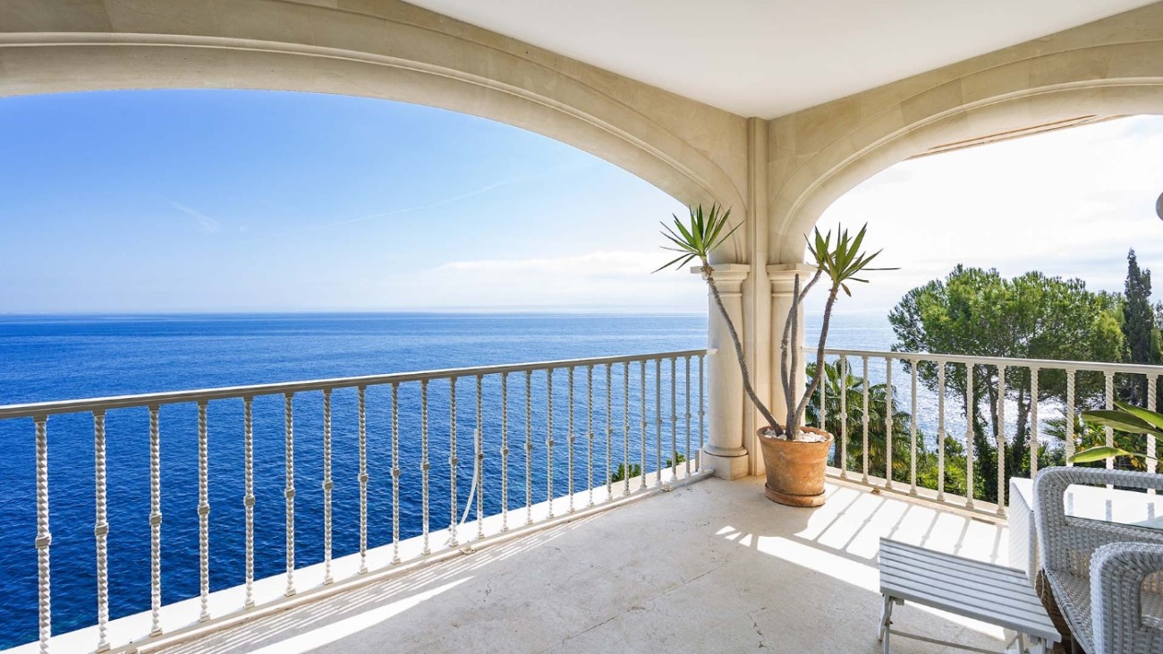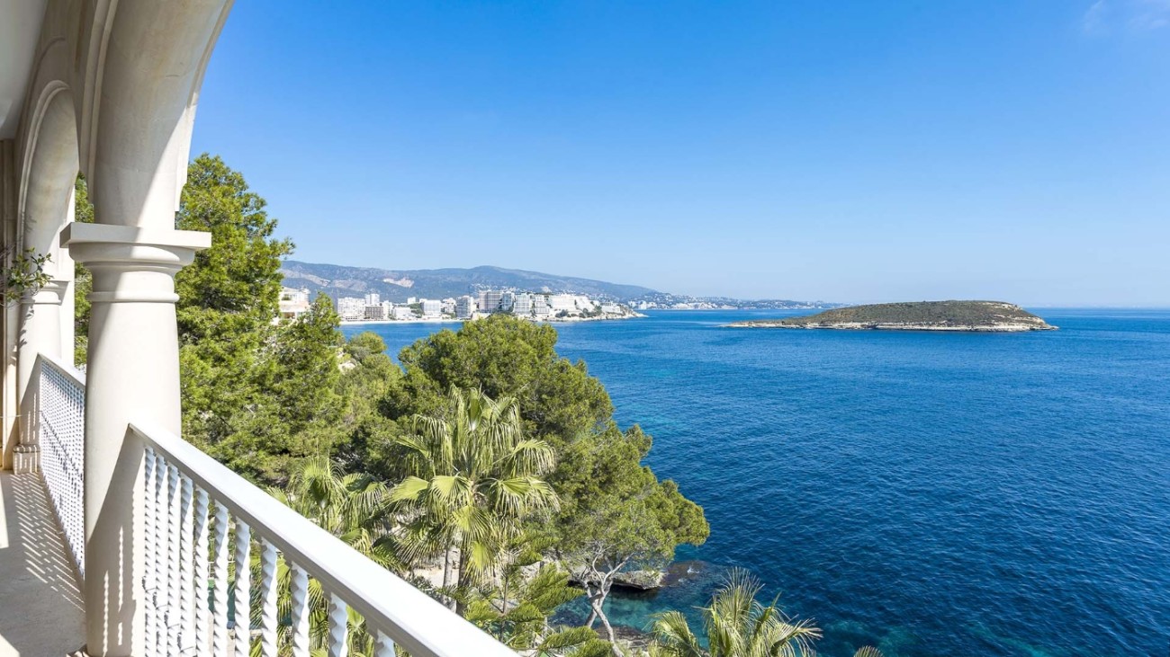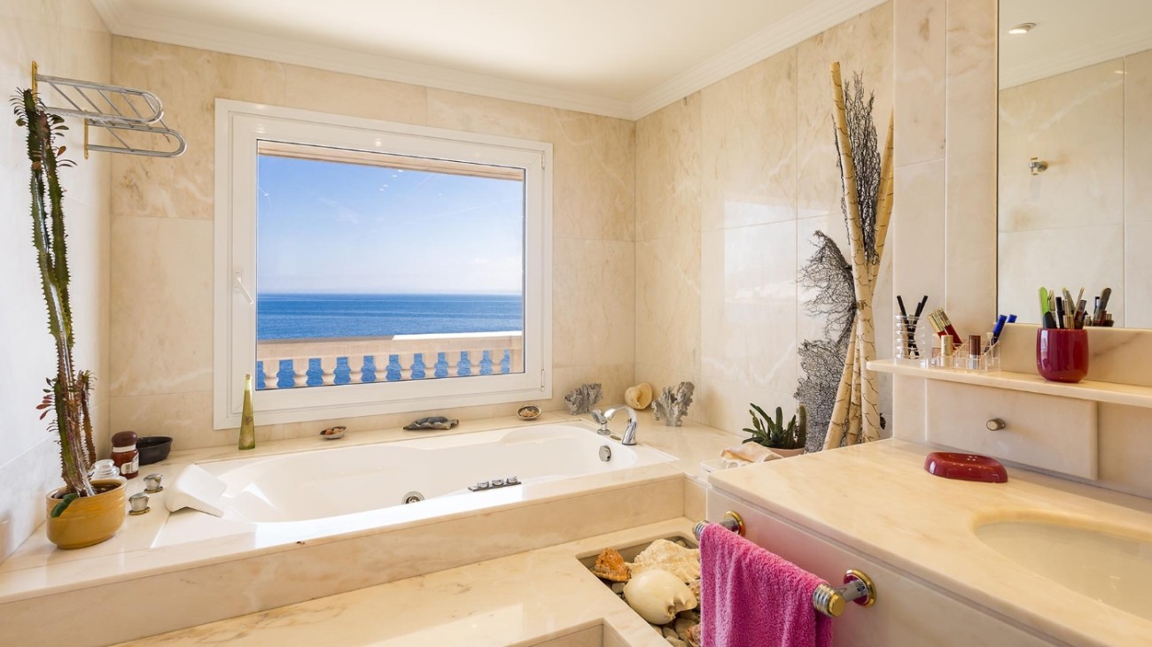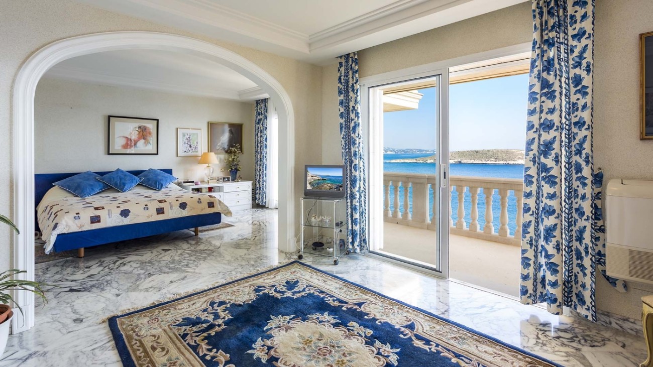 Deze unieke villa ligt direct aan de kust en heeft een eigen privétoegang tot de zee. De villa heeft vijf verdiepingen, elk met een terras en spectaculair uitzicht op de turquoise zee. Het ligt in een zeer rustige woonwijk en op slechts 20 minuten van Palma. De indeling en kamers zijn goed gepland zodat een groot gezin hier comfortabel kan wonen en privacy heeft wanneer dat nodig is. Alle slaapkamers hebben een eigen badkamer, de meeste met jacuzzi. Er is een keuken op de vierde verdieping met een L-vormig terras met fantastisch uitzicht op zee. Alle verdiepingen hebben ruime woonkamers en eetkamers. Een van de verdiepingen heeft een biljarttafel met gastentoilet. Ze hebben allemaal grote glazen schuifdeuren die uitkomen op het terras met uitzicht op zee.