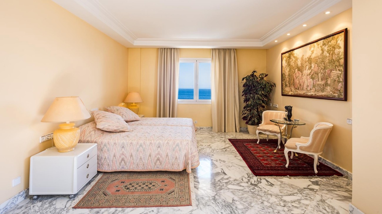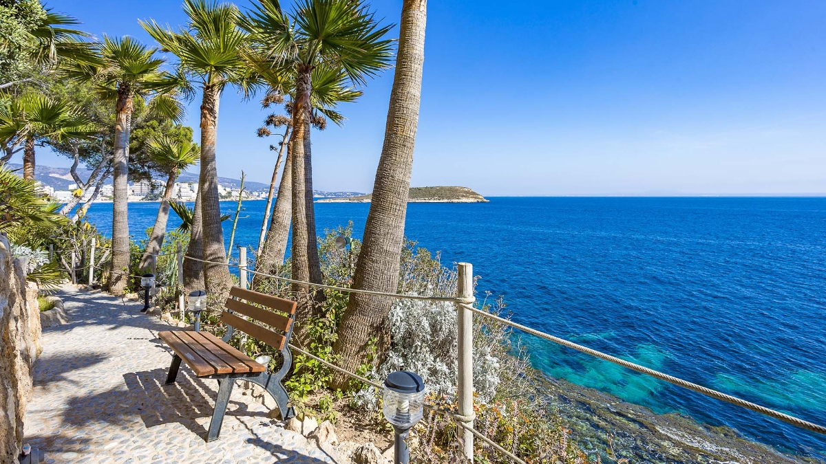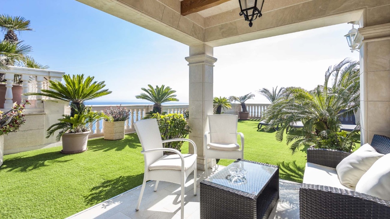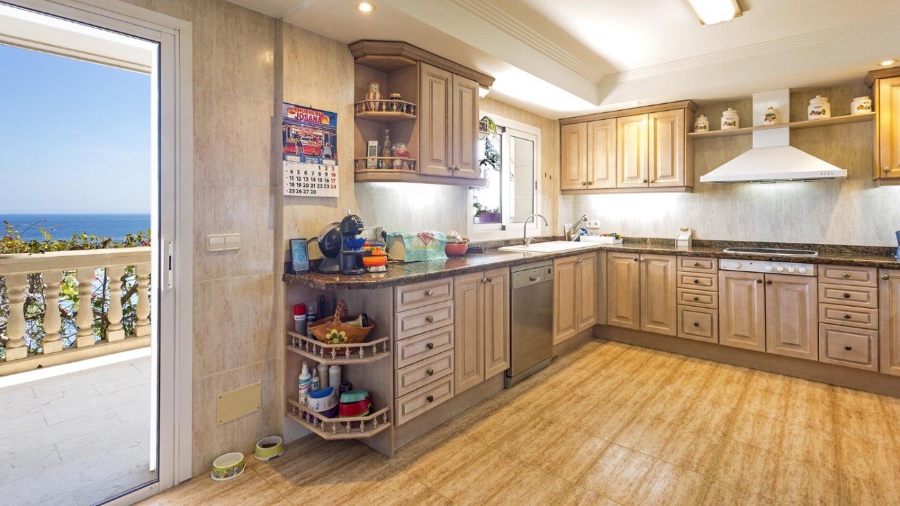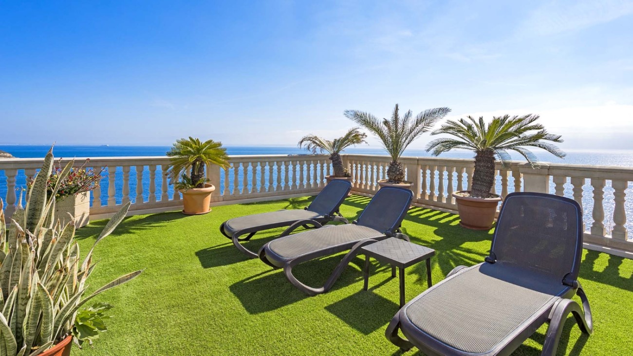 Deze unieke villa ligt direct aan de kust en heeft een eigen privétoegang tot de zee. De villa heeft vijf verdiepingen, elk met een terras en spectaculair uitzicht op de turquoise zee. Het ligt in een zeer rustige woonwijk en op slechts 20 minuten van Palma. De indeling en kamers zijn goed gepland zodat een groot gezin hier comfortabel kan wonen en privacy heeft wanneer dat nodig is. Alle slaapkamers hebben een eigen badkamer, de meeste met jacuzzi. Er is een keuken op de vierde verdieping met een L-vormig terras met fantastisch uitzicht op zee. Alle verdiepingen hebben ruime woonkamers en eetkamers. Een van de verdiepingen heeft een biljarttafel met gastentoilet. Ze hebben allemaal grote glazen schuifdeuren die uitkomen op het terras met uitzicht op zee.